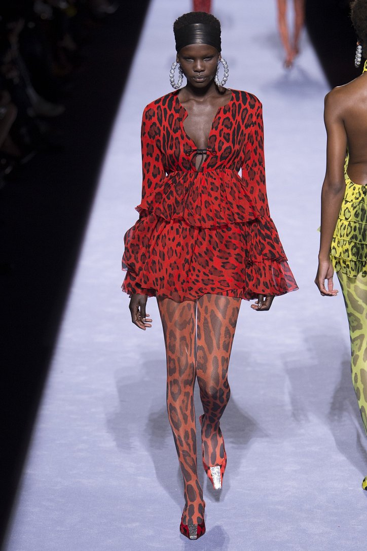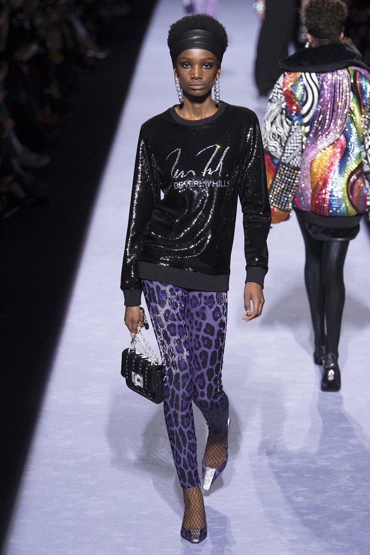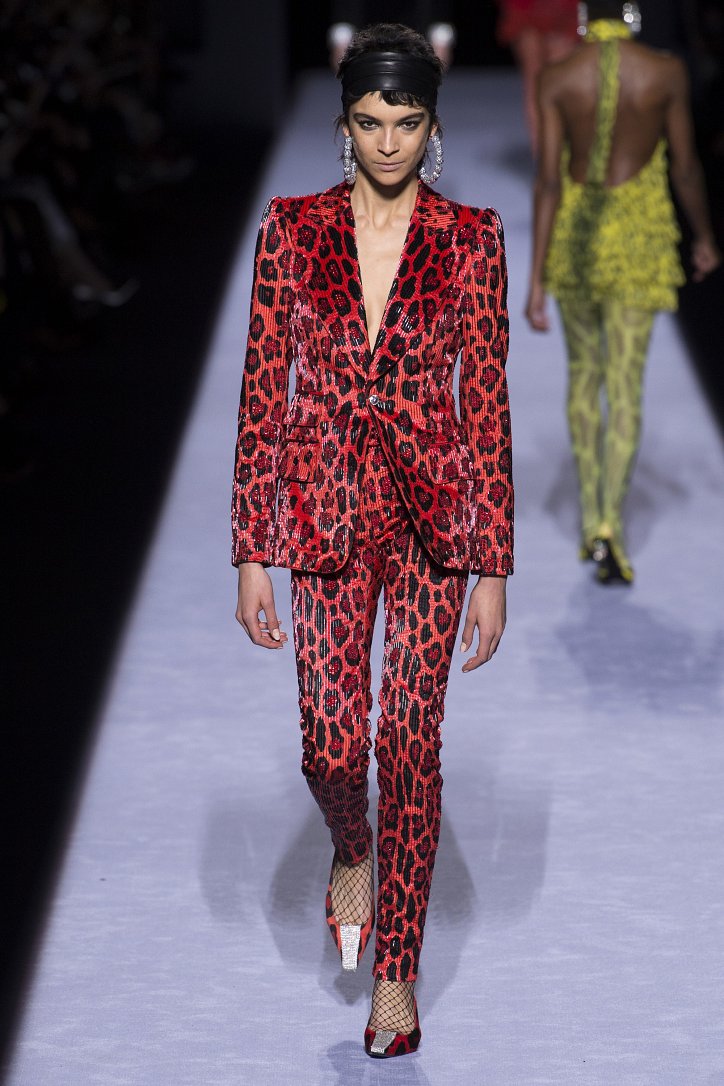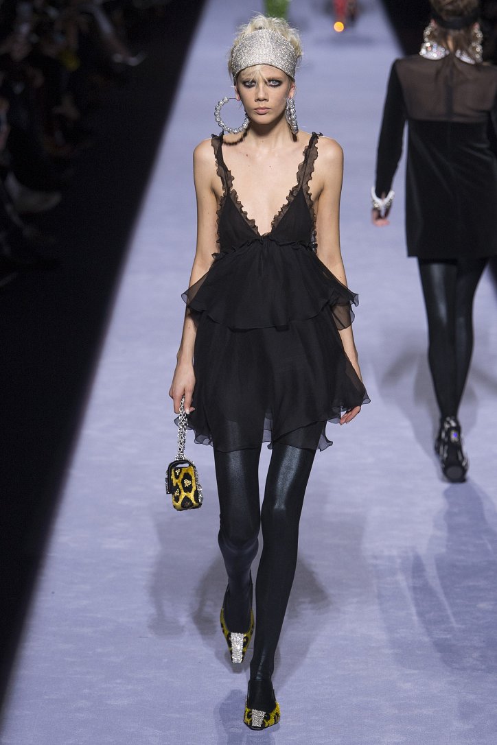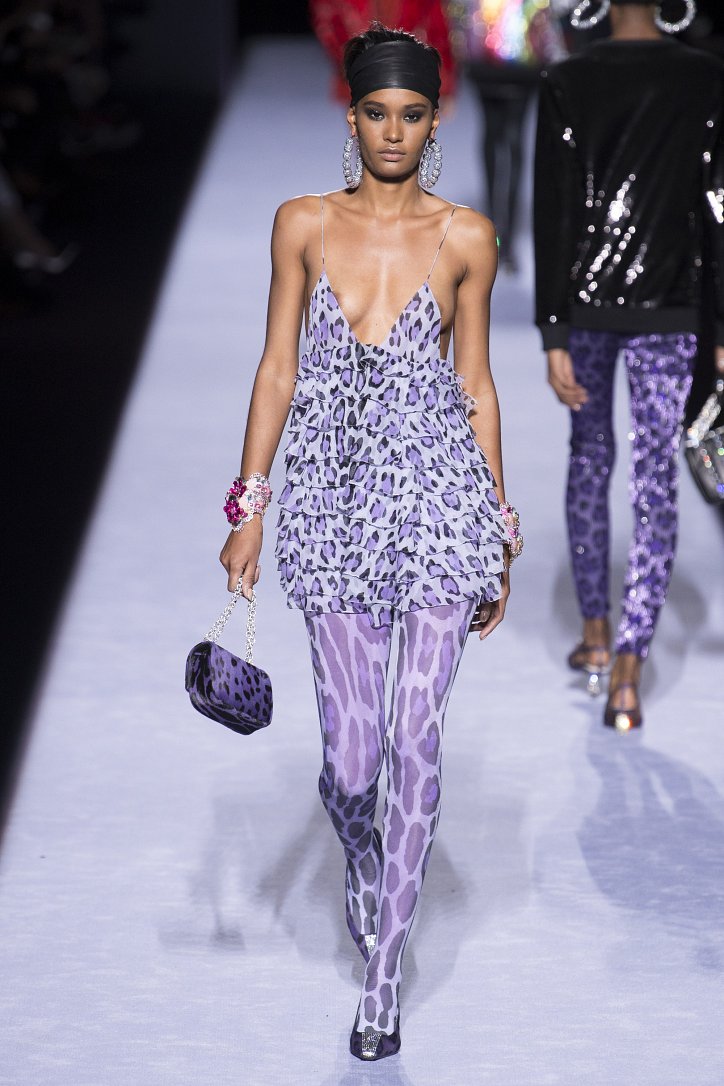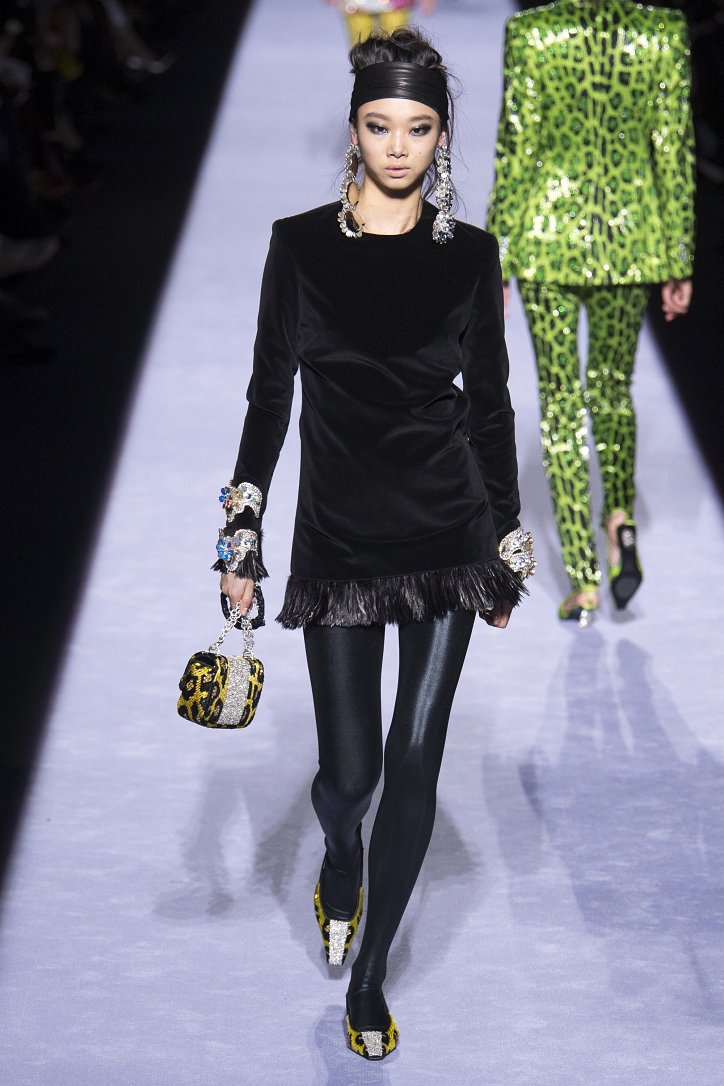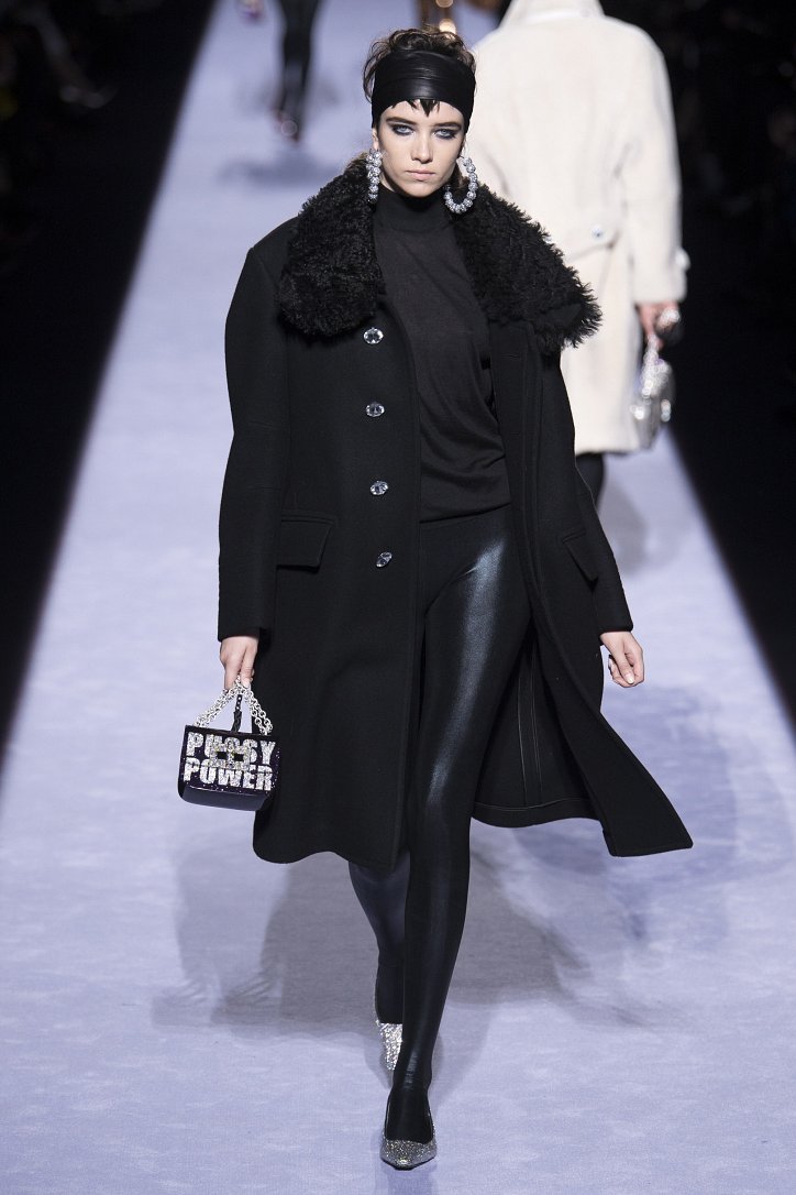 Скрестить шубу с пуховиком Тому Форду оказалось недостаточным. Даже если шуба была черная, а пуховик – ярко-голубой с оранжевыми вставками. Рукава и воротник дизайнер решил сделать «хищными» (причем хищники явно были разными), затем слегка затонировал мех розовым и добавил для полноты картины яркие цветы. Подобным образом выглядела и вся остальная коллекция Tom Ford осень-зима 2018-2019. Блестящие «золотые» леггинсы в ней сочетались с леопардовыми шубами, мех – с плащевкой, анималистические принты соседствовали с графикой по принципу колорблокинга, строгий черный двубортный жакет полагалось носить с серебристыми лосинами и поясом с блестящей пряжкой, а шифоновые мини-платья с красочными принтом «под леопарда» - с такими же «хищными» колготками – настоящее торжество 80-ых! Ярко, блестяще, хищно и смело!