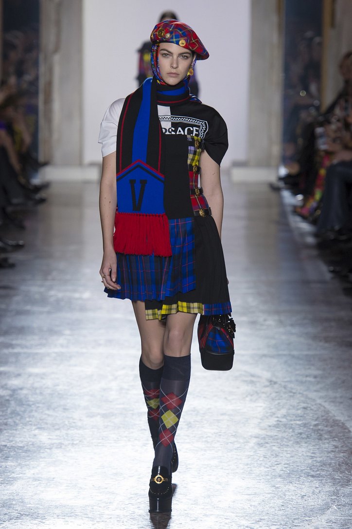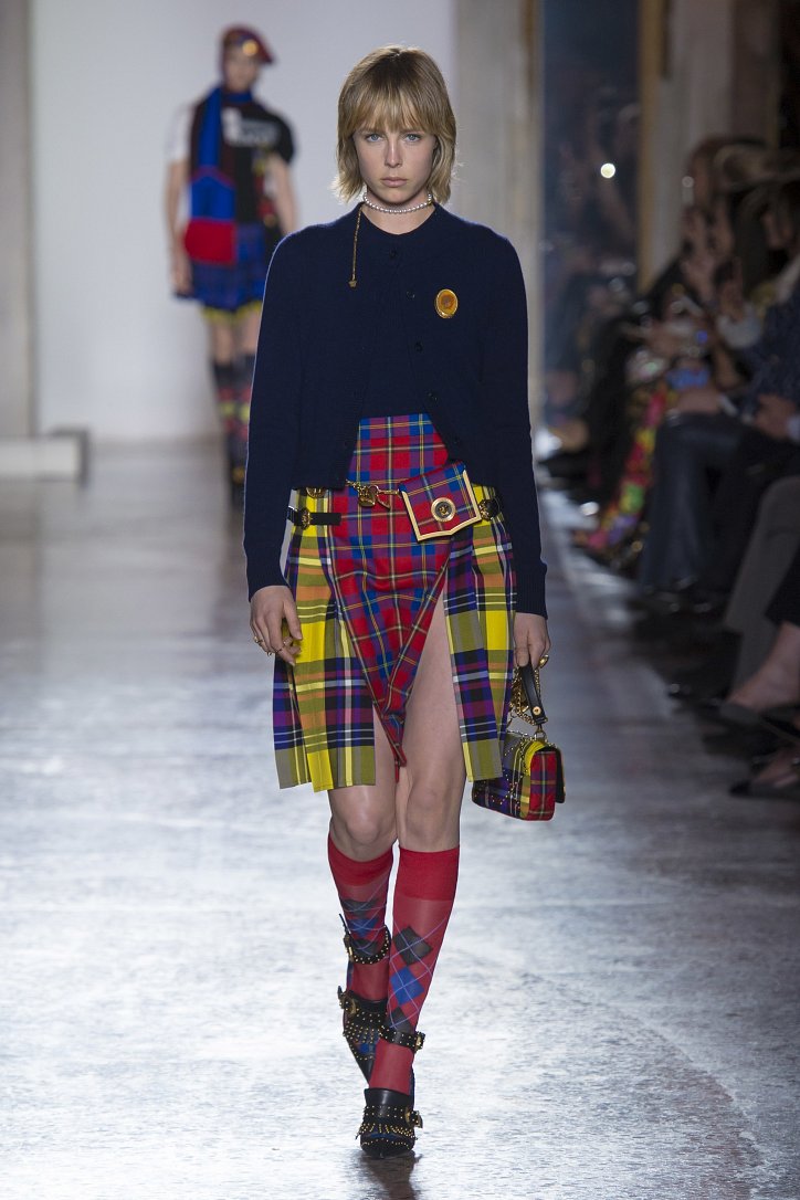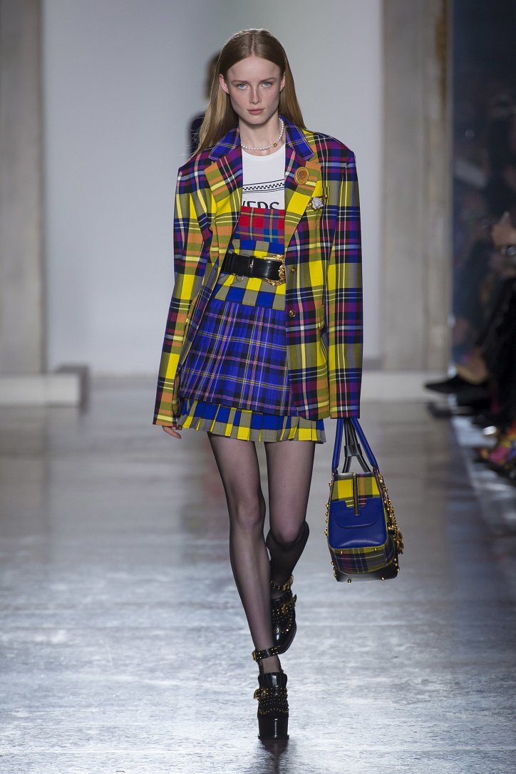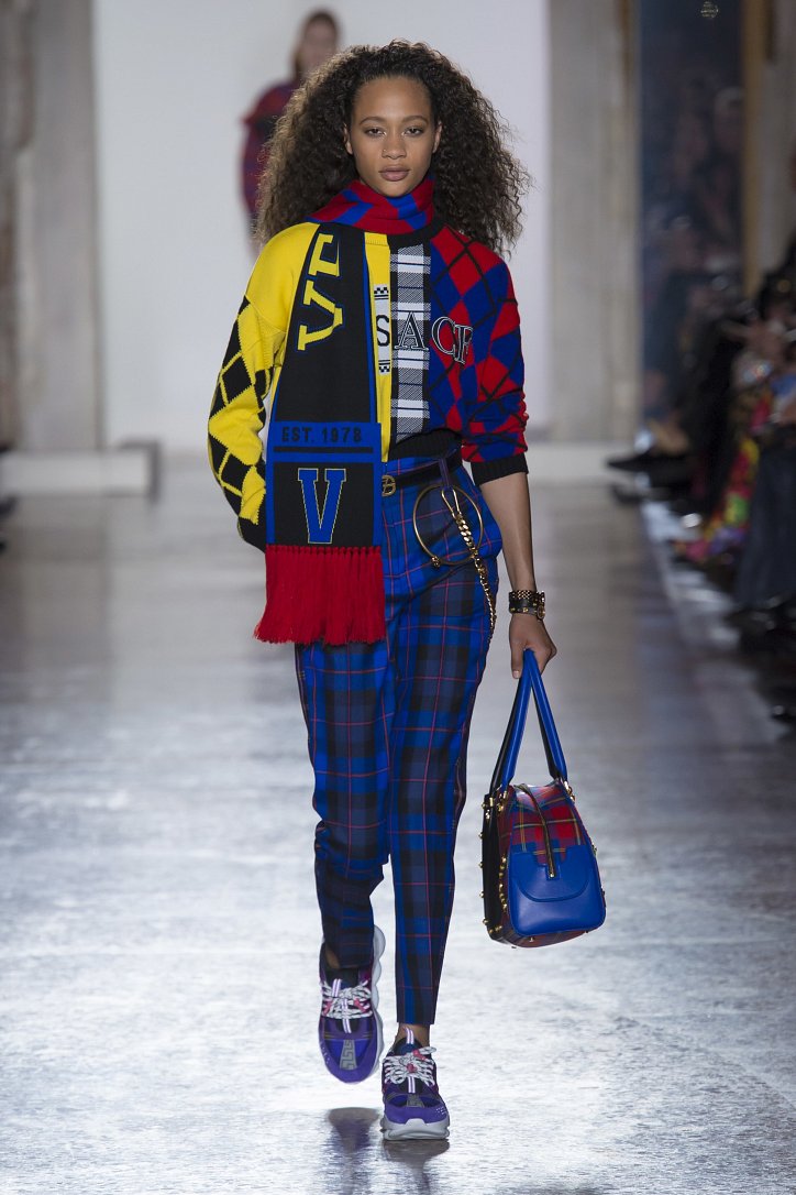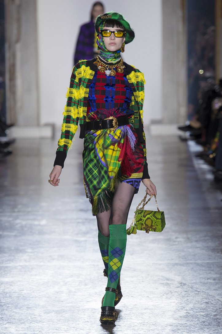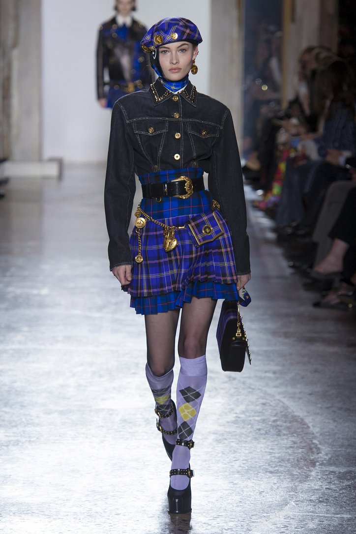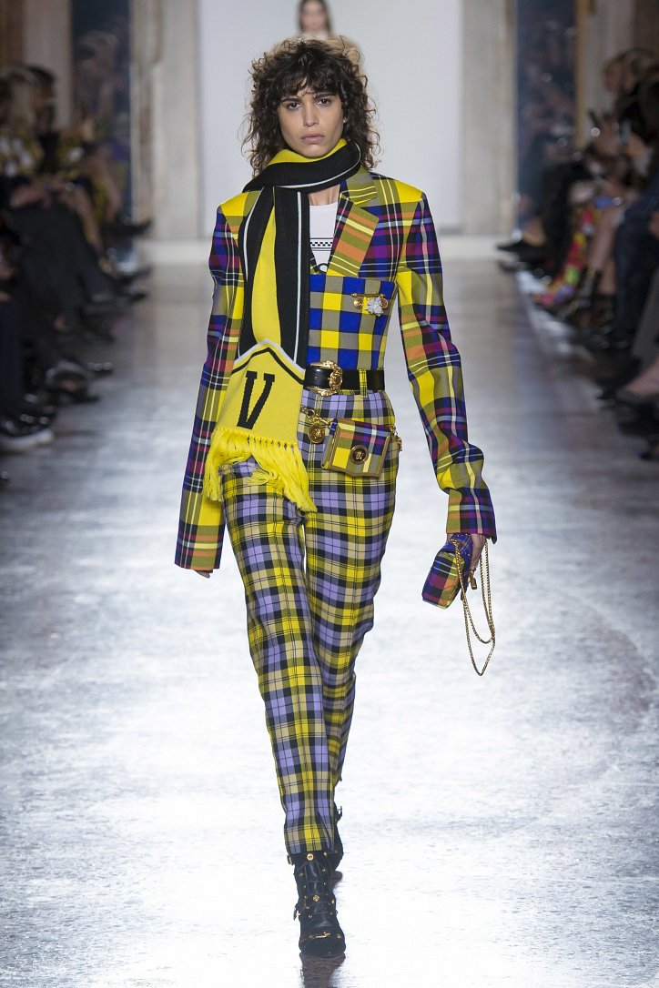 То, что в моду возвращается эпоха 80-ых, уже ясно всем. Но если для многих брендов это время – «терра инкогнита», то для Донателлы Версаче мода восьмидесятых – это все близкое и родное. Игра на своем поле - показ коллекции Versace осень-зима 2018-2019 – начался с классики: бежевые тренчкоты, «школьные» воротнички на рубашках, брюки со стрелками, броги на высокой платформе. Затем на подиуме появился тартан – но в необычном обличье: дизайнер выбрала не просто самые яркие цвета «шотландки», но и перемешала все кланы горцев! (Что-то бы они сказали, глядя на такой святотатственный микс!) Но и этого было мало. Мини-юбки из плиссированного тартана итальянка соединила с джинсовыми рубашками и гольфами с ромбами аргайл, «вплела» клетчатый принт в сапоги и береты, добавила яркие лоскуты в джинсы, косухи и нанесла его на сумки.
