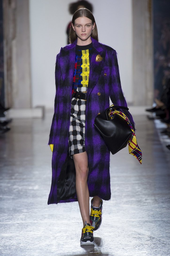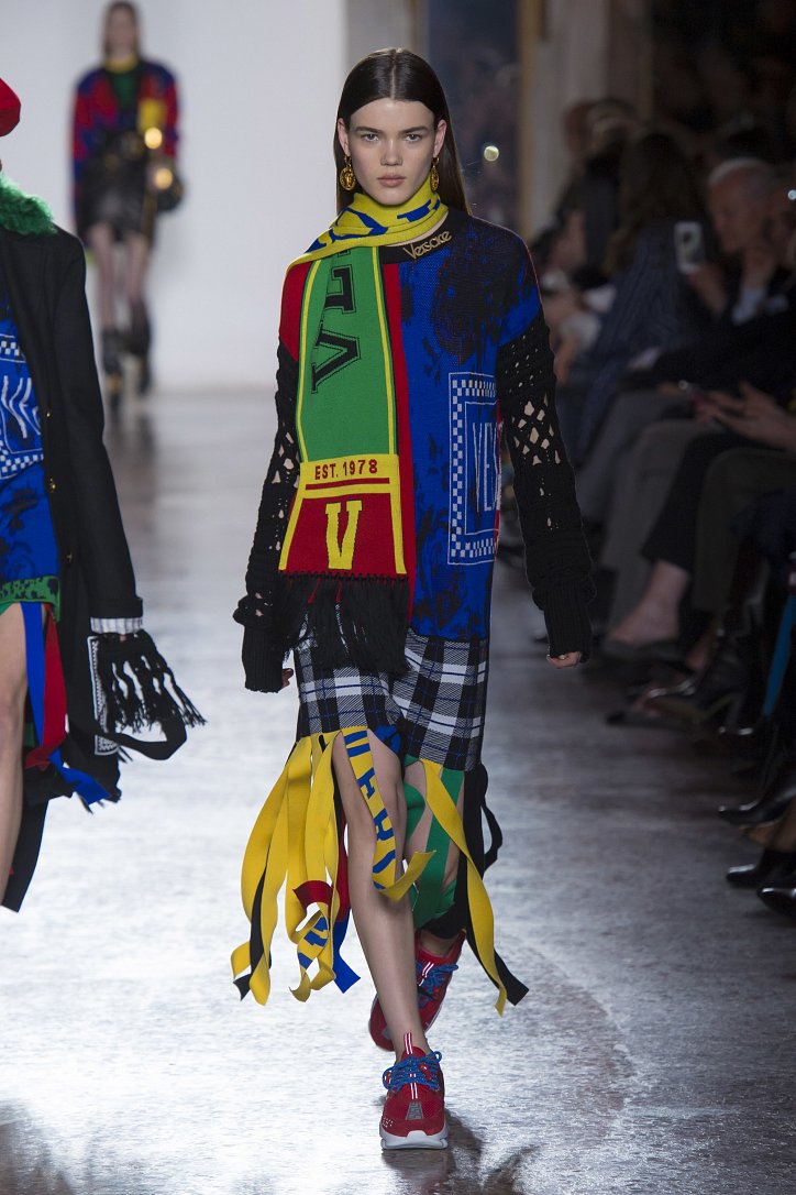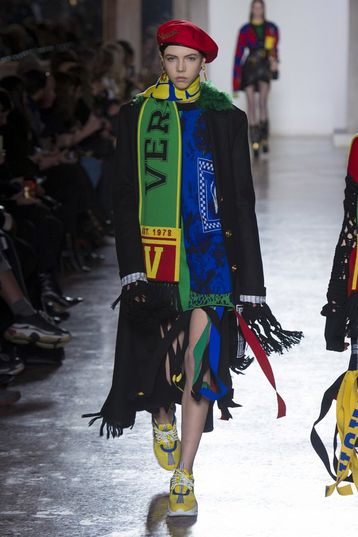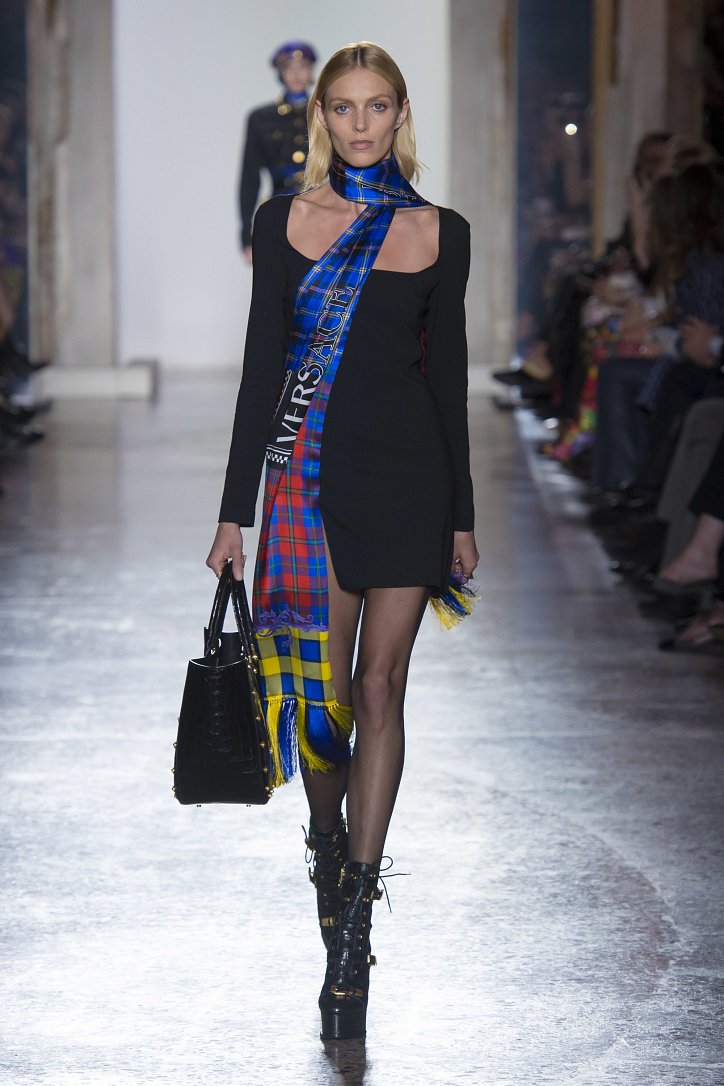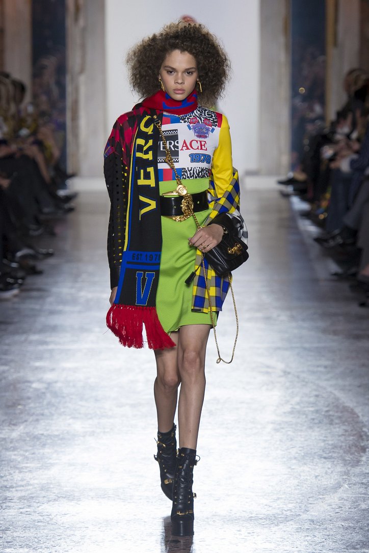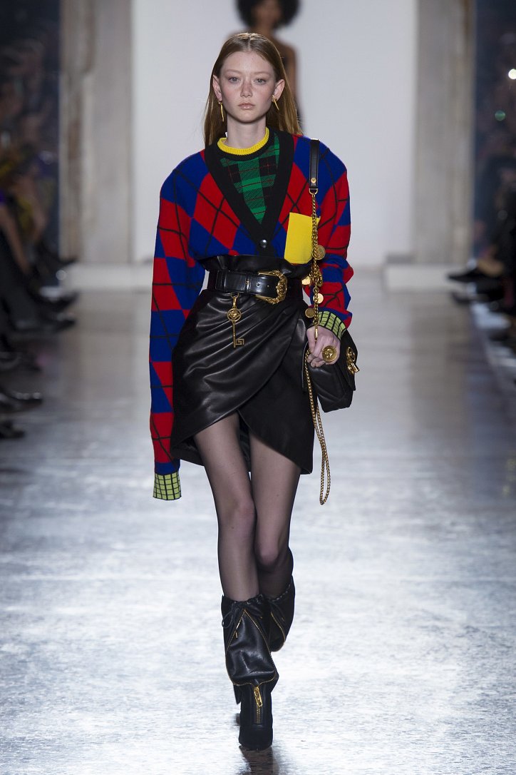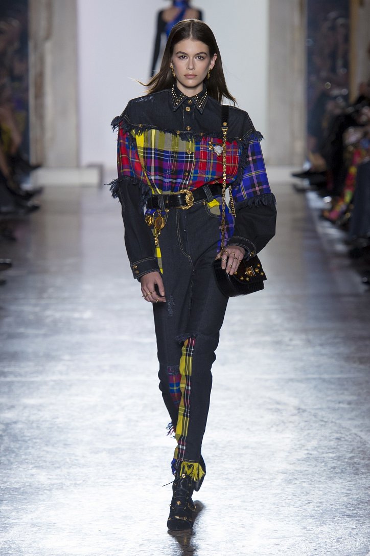 То, что в моду возвращается эпоха 80-ых, уже ясно всем. Но если для многих брендов это время – «терра инкогнита», то для Донателлы Версаче мода восьмидесятых – это все близкое и родное. Игра на своем поле - показ коллекции Versace осень-зима 2018-2019 – начался с классики: бежевые тренчкоты, «школьные» воротнички на рубашках, брюки со стрелками, броги на высокой платформе. Затем на подиуме появился тартан – но в необычном обличье: дизайнер выбрала не просто самые яркие цвета «шотландки», но и перемешала все кланы горцев! (Что-то бы они сказали, глядя на такой святотатственный микс!) Но и этого было мало. Мини-юбки из плиссированного тартана итальянка соединила с джинсовыми рубашками и гольфами с ромбами аргайл, «вплела» клетчатый принт в сапоги и береты, добавила яркие лоскуты в джинсы, косухи и нанесла его на сумки.