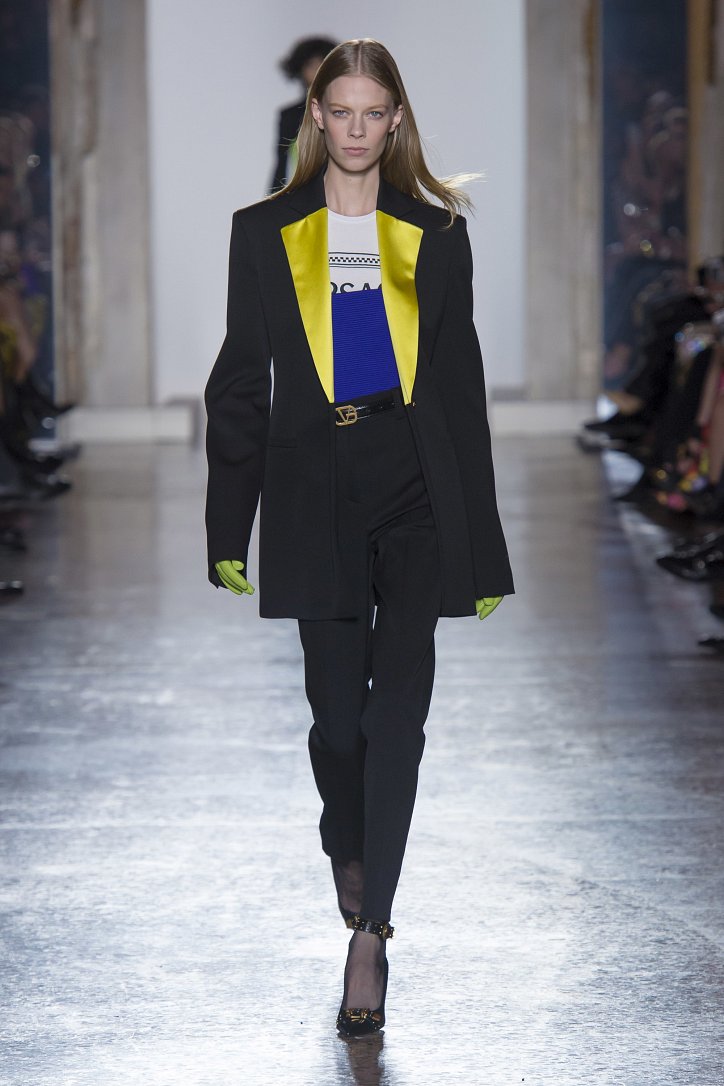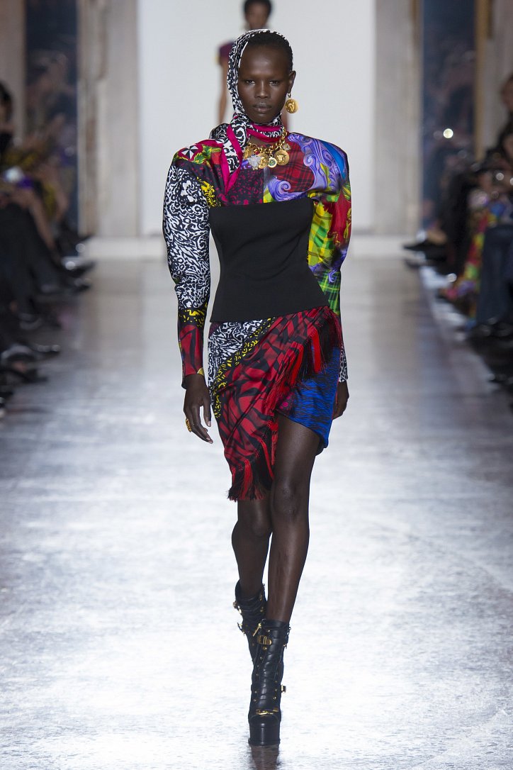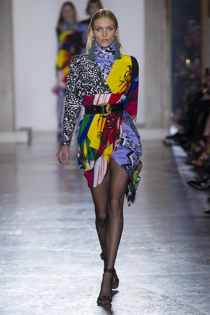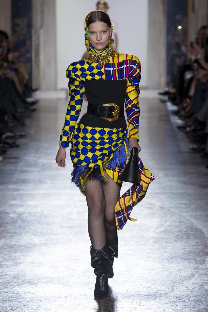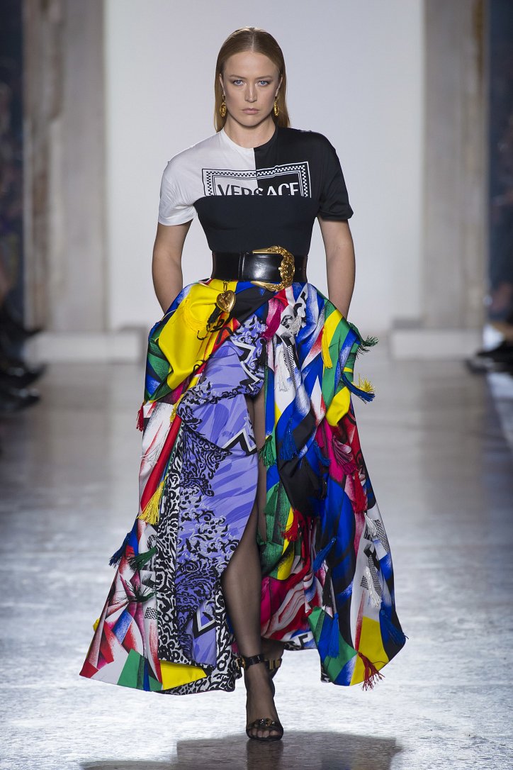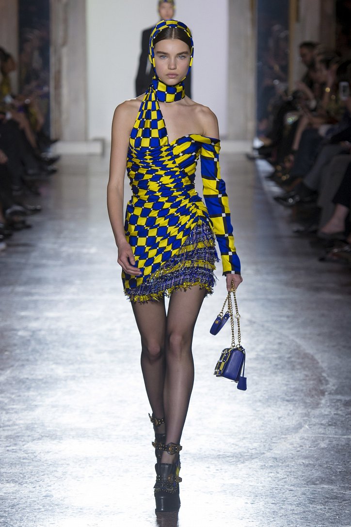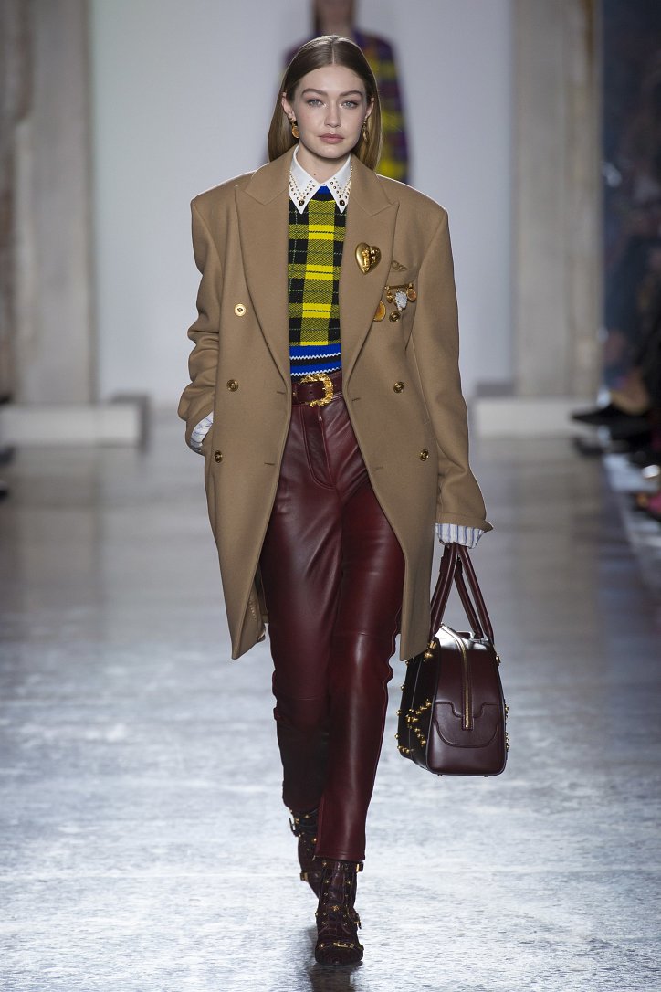 То, что в моду возвращается эпоха 80-ых, уже ясно всем. Но если для многих брендов это время – «терра инкогнита», то для Донателлы Версаче мода восьмидесятых – это все близкое и родное. Игра на своем поле - показ коллекции Versace осень-зима 2018-2019 – начался с классики: бежевые тренчкоты, «школьные» воротнички на рубашках, брюки со стрелками, броги на высокой платформе. Затем на подиуме появился тартан – но в необычном обличье: дизайнер выбрала не просто самые яркие цвета «шотландки», но и перемешала все кланы горцев! (Что-то бы они сказали, глядя на такой святотатственный микс!) Но и этого было мало. Мини-юбки из плиссированного тартана итальянка соединила с джинсовыми рубашками и гольфами с ромбами аргайл, «вплела» клетчатый принт в сапоги и береты, добавила яркие лоскуты в джинсы, косухи и нанесла его на сумки.