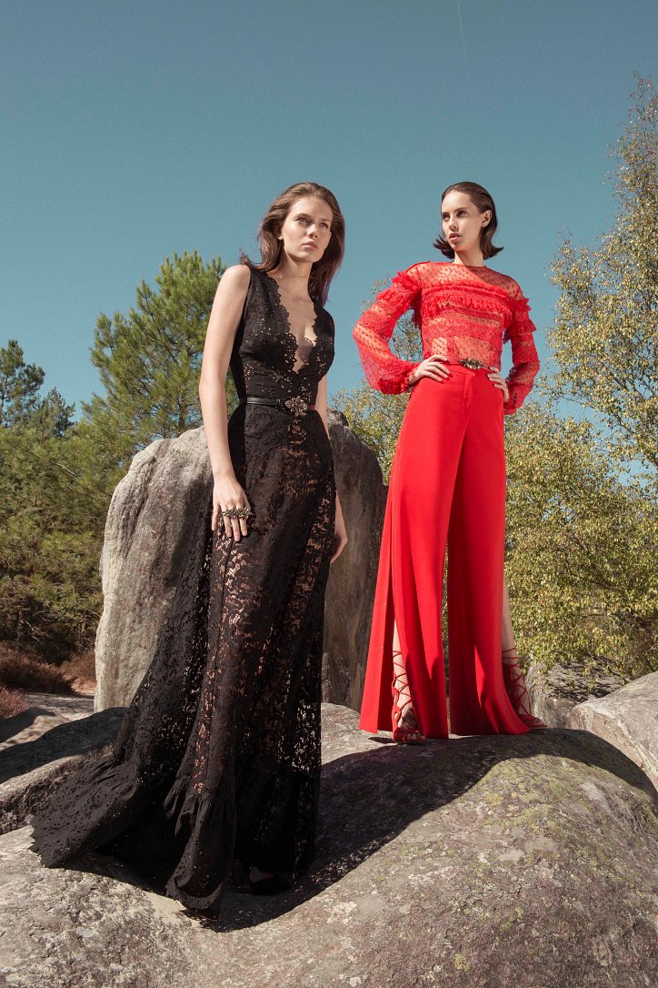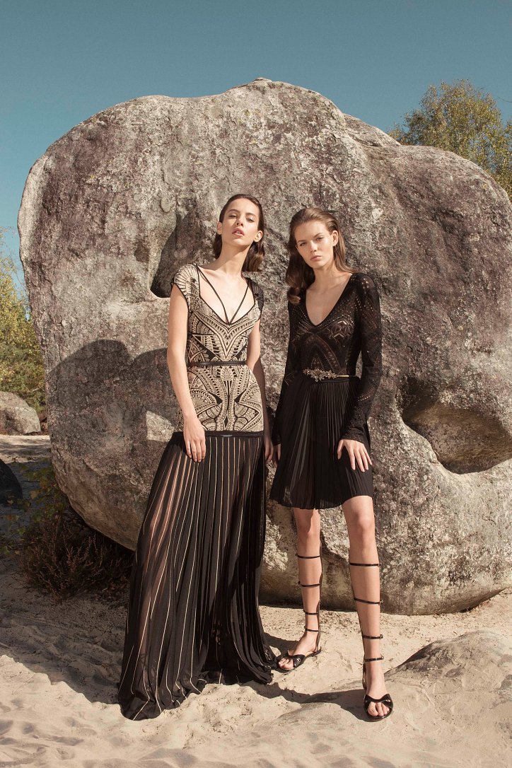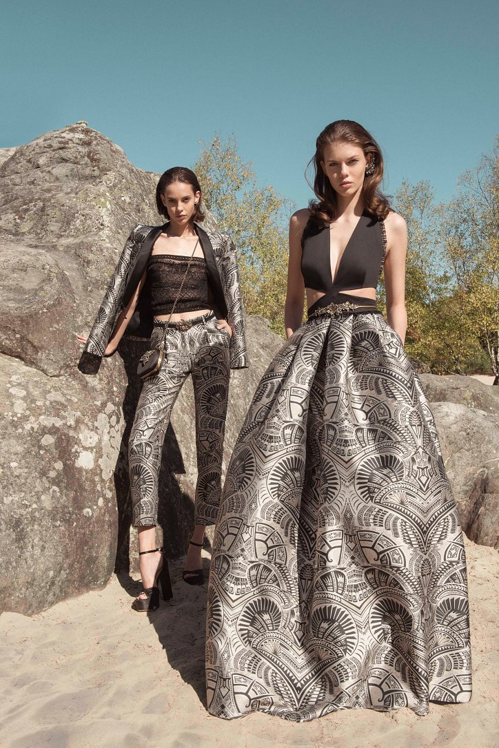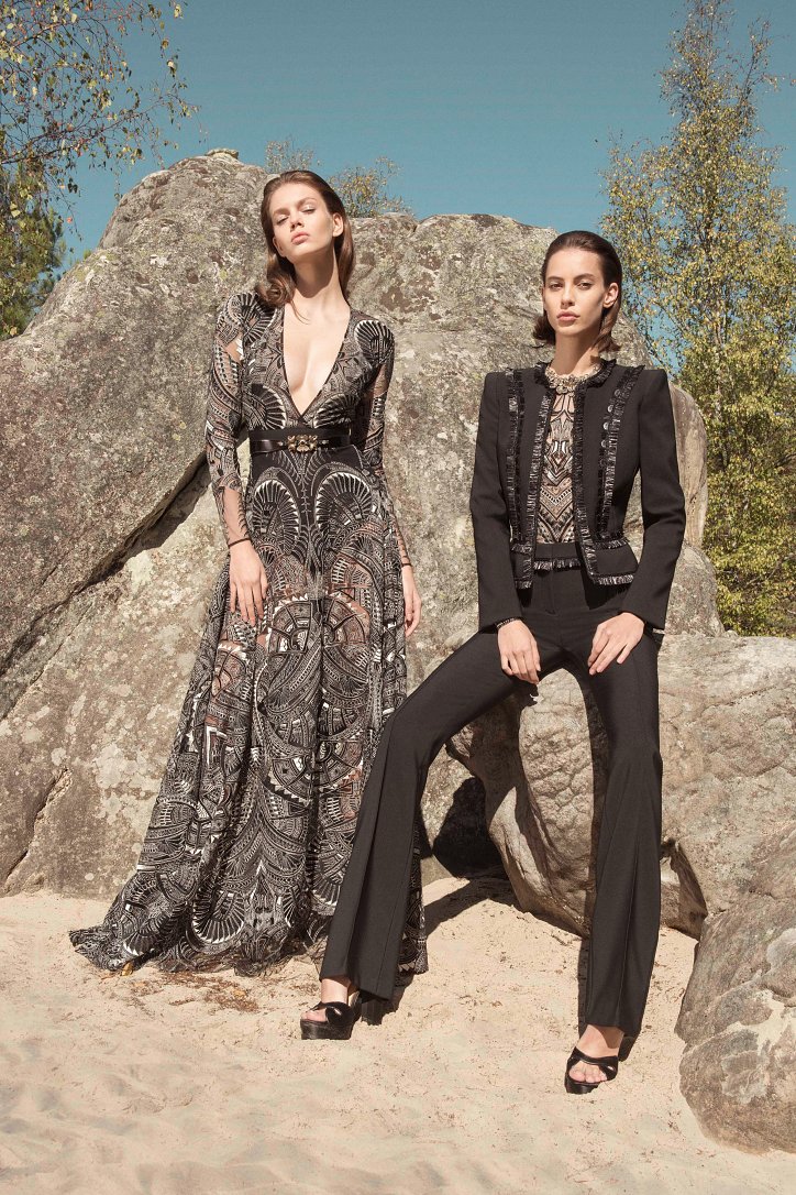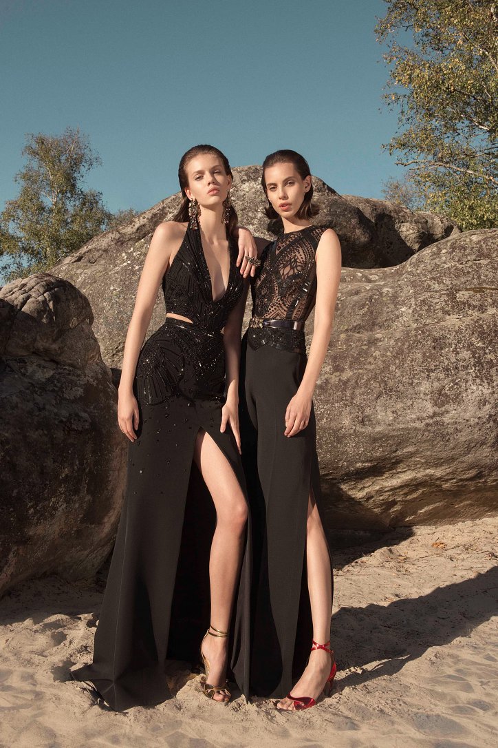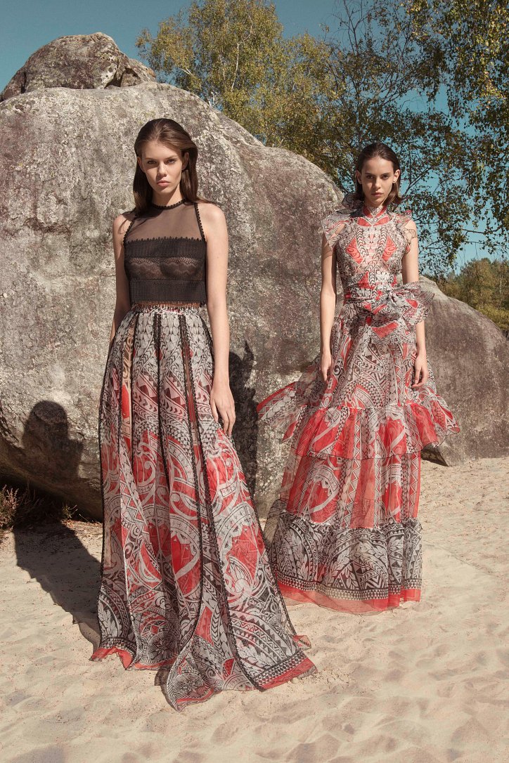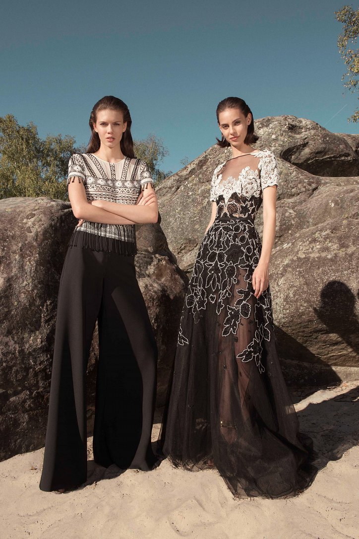 Полинезийские татуировки Tiki Tattoo в виде принтов – это нечто новое для Zuhair Murad, от которого традиционно ждут роскошных нарядов для ковровых дорожек. Но необычные мотивы принтов совсем не противоречили привычным кодам дома моды - коллекция Zuhair Murad выглядела потрясающе красиво, нежно и шикарно. Ведь дизайнер умудрился даже тату-рисунки вышить бисером и пайетками. Так, один из самых красивых образов коллекции – костюм из расклешенных брюк и жакета на запах – был полностью (!) расшит пайетками лилового, лавандового, черного и изумрудного цвета. Впрочем, даже в моделях без декора черно-белые принты выглядели богато и необычно. И, конечно же, радуют глаз элегантные брючные костюмы, летящие шифоновые платья-макси, дерзкие и прекрасные мини-платья и комбинезоны и нюдовые вечерние платья с накидками.