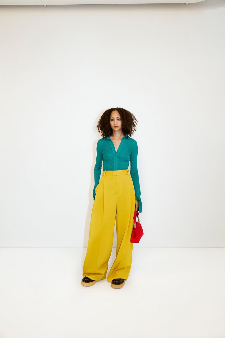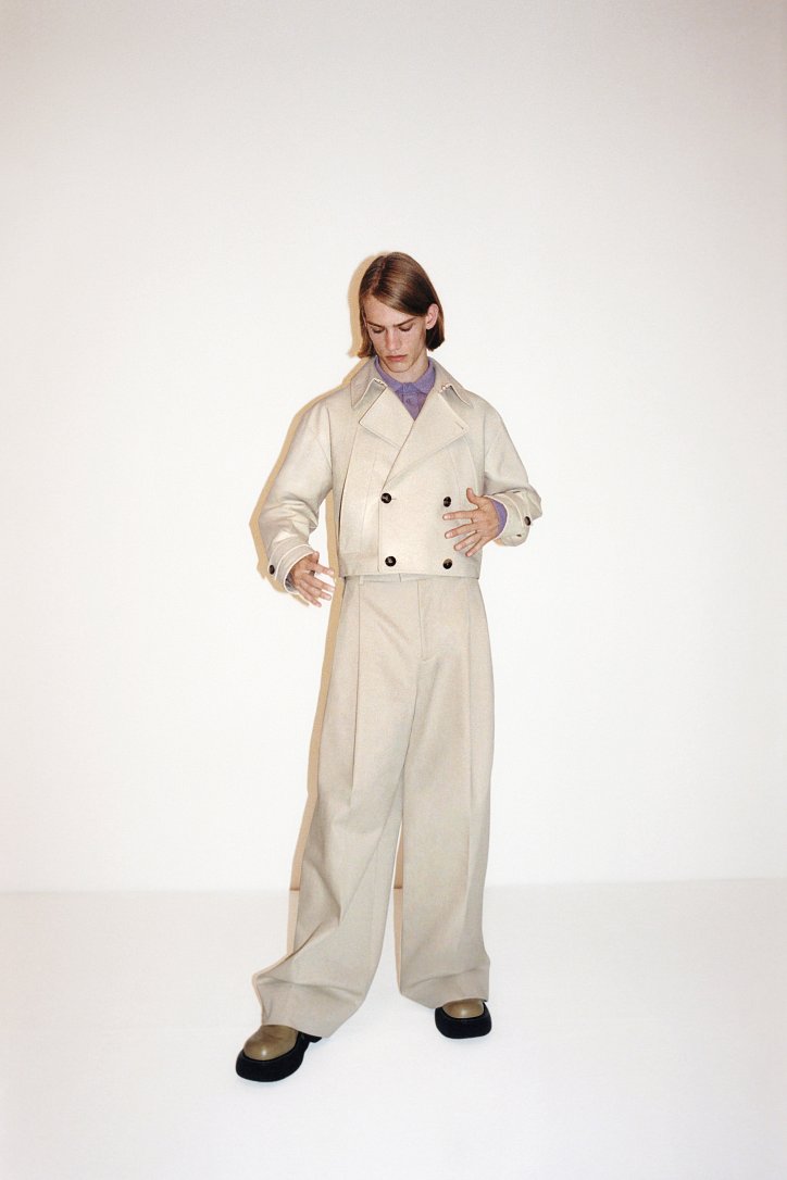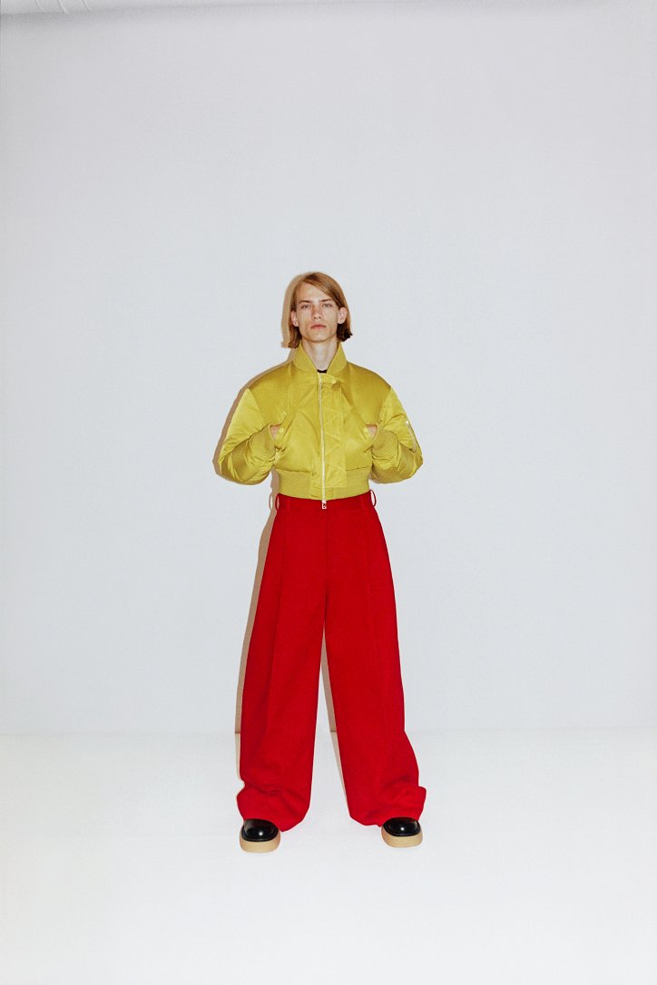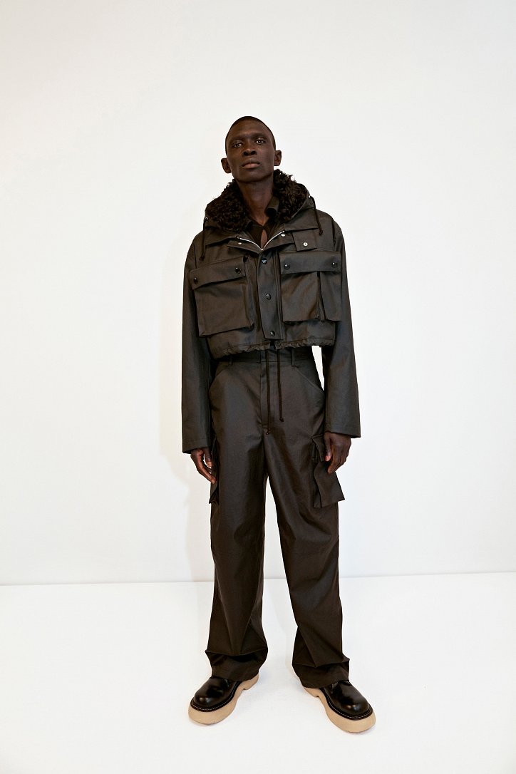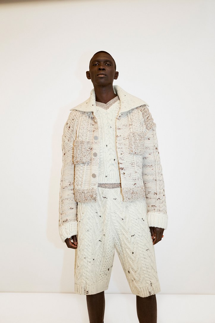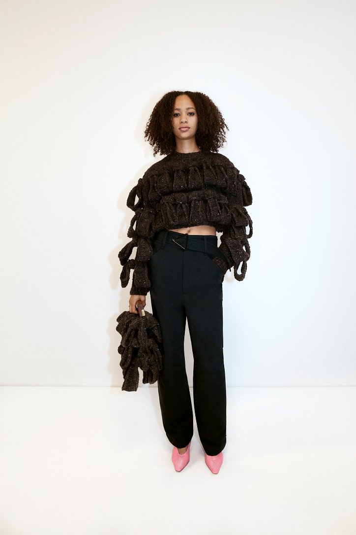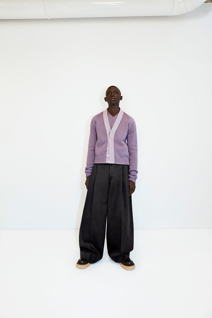 В качестве «мостика» для выхода из карантина дизайнер бренда Дэниел Ли предлагает широкие брюки и трикотаж ручной вязки. Удобные и комфортные модели он облек в авангардные силуэты – ведь смысл в создании новой одежды он видит в том, чтобы создавать вещи, которые нельзя купить больше ни в одном магазине. Еще один акцент – цветовая палитра, состоящая из ярких оттенков лаванды, красного, желтого и бирюзового, которые соединяются в аутфитах в смелый колорблокинг. Уравновешивает это буйство красок черный и оттенки коричневого.
