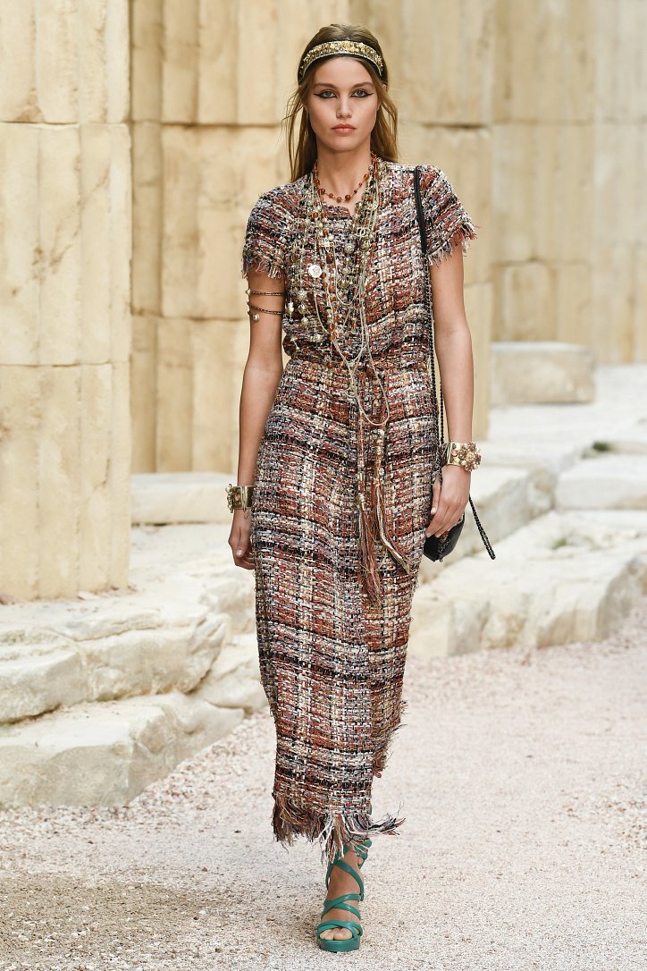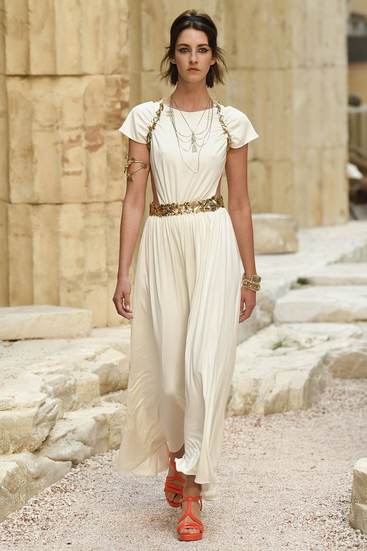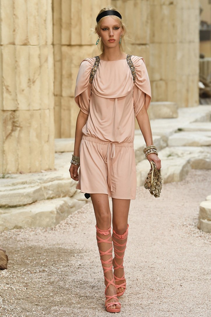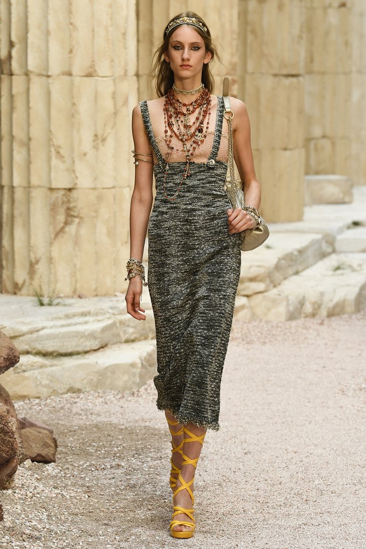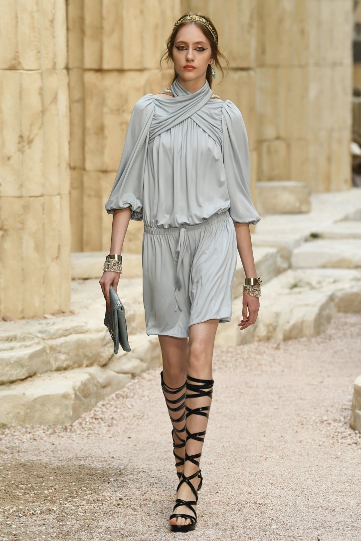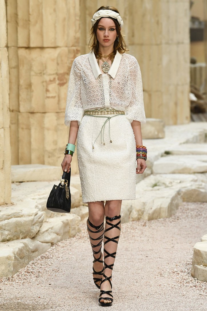 На фоне полуразрушенных колонн и статуй горделиво и чинно выступали модели, демонстрирующие греческий идеал красоты в современной интерпретации Карла Лагерфльда. Круизная коллекция Chanel порадовала поклонниц дома моды светлыми хитонами и твидовыми костюмами (куда же без них!), летящими платьями из шифона в стиле ампир и украшенными драгоценными камнями повязками. Центральным же элементом коллекции стали греческие сандалии всех цветов.