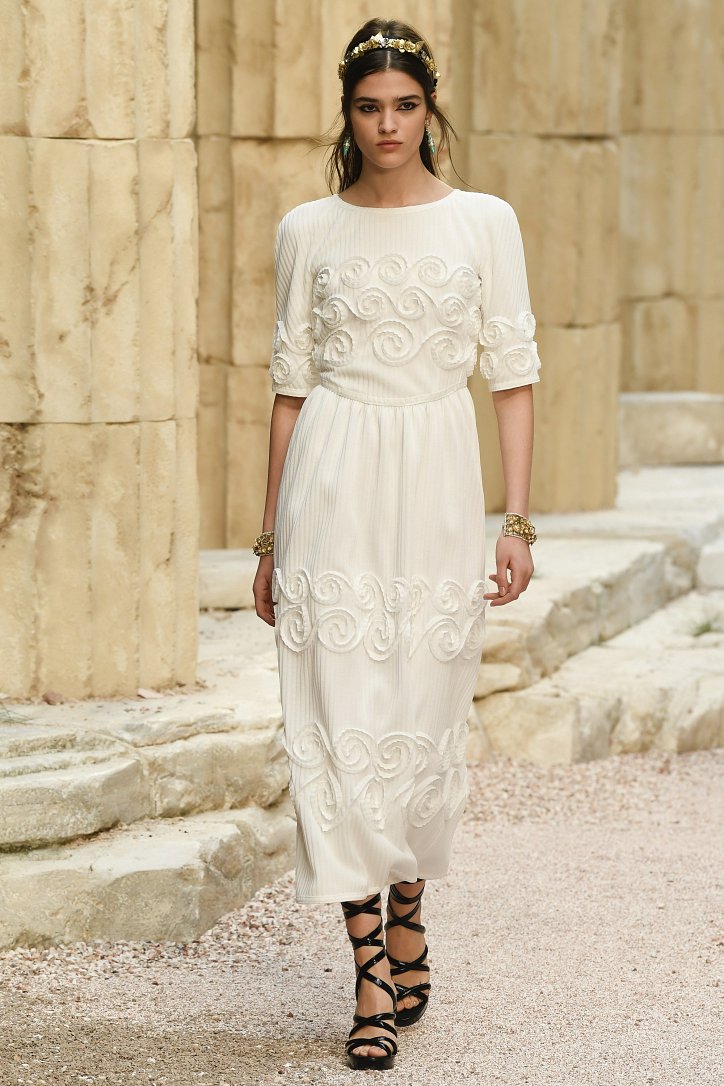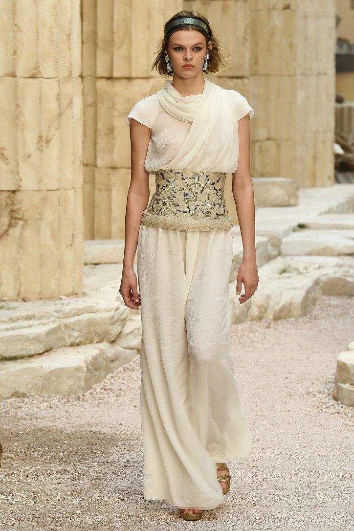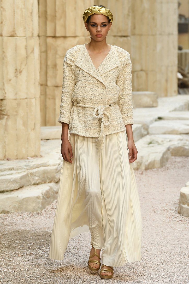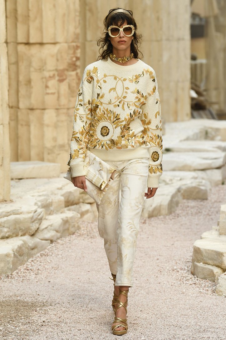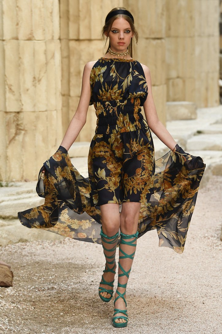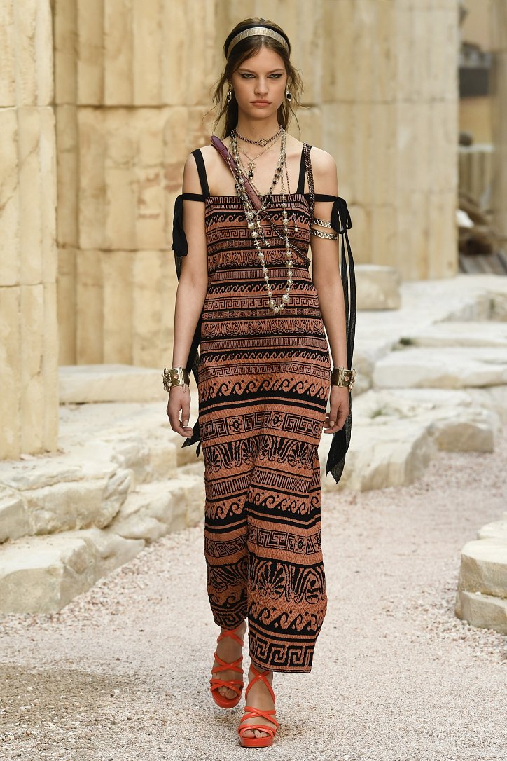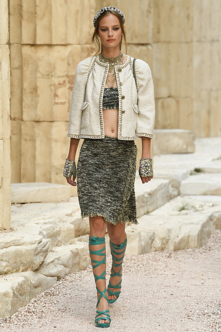 На фоне полуразрушенных колонн и статуй горделиво и чинно выступали модели, демонстрирующие греческий идеал красоты в современной интерпретации Карла Лагерфльда. Круизная коллекция Chanel порадовала поклонниц дома моды светлыми хитонами и твидовыми костюмами (куда же без них!), летящими платьями из шифона в стиле ампир и украшенными драгоценными камнями повязками. Центральным же элементом коллекции стали греческие сандалии всех цветов.