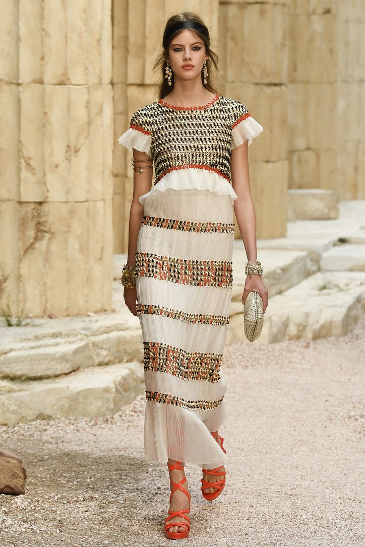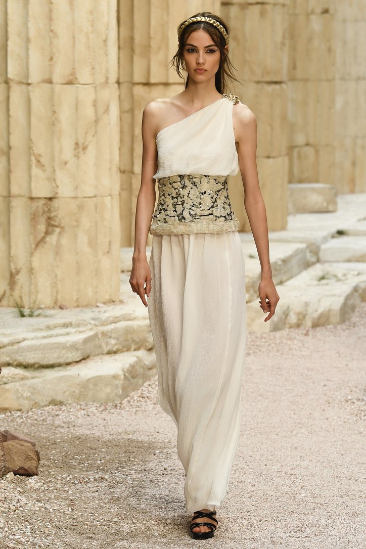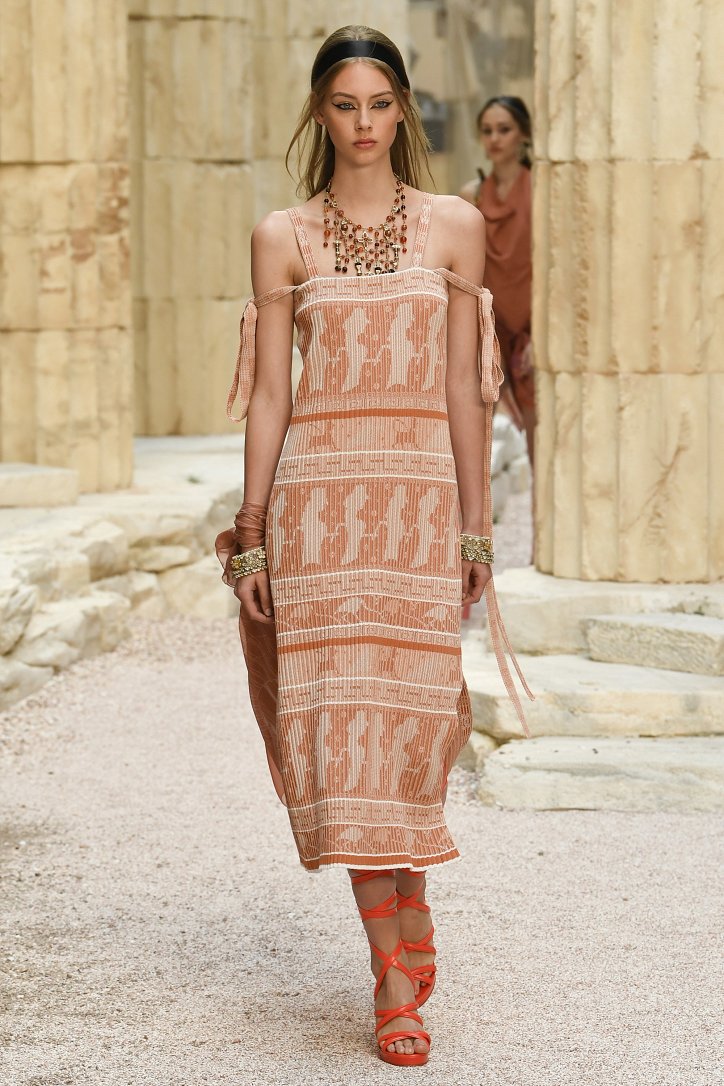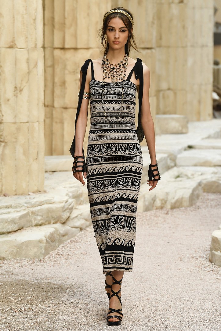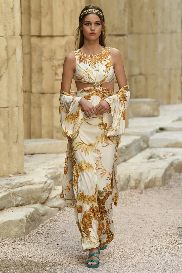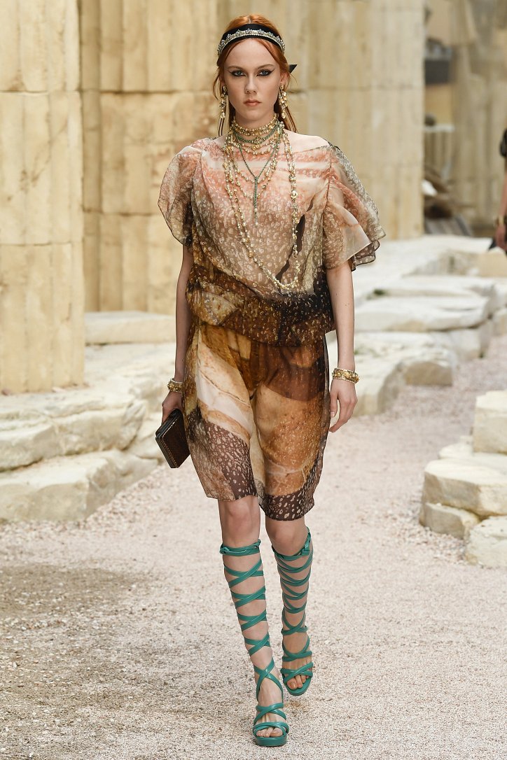 На фоне полуразрушенных колонн и статуй горделиво и чинно выступали модели, демонстрирующие греческий идеал красоты в современной интерпретации Карла Лагерфльда. Круизная коллекция Chanel порадовала поклонниц дома моды светлыми хитонами и твидовыми костюмами (куда же без них!), летящими платьями из шифона в стиле ампир и украшенными драгоценными камнями повязками. Центральным же элементом коллекции стали греческие сандалии всех цветов.