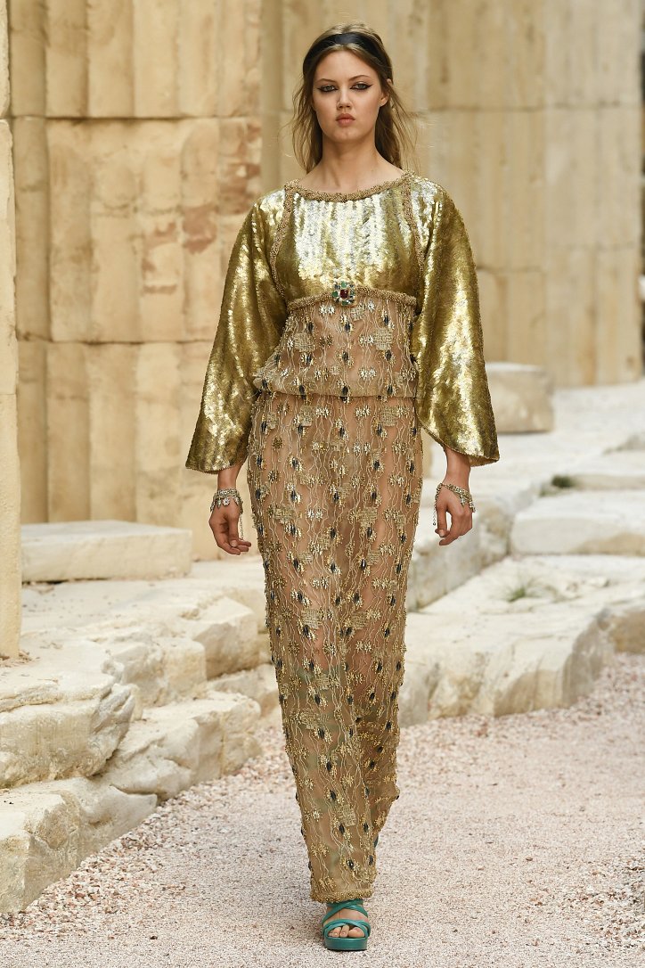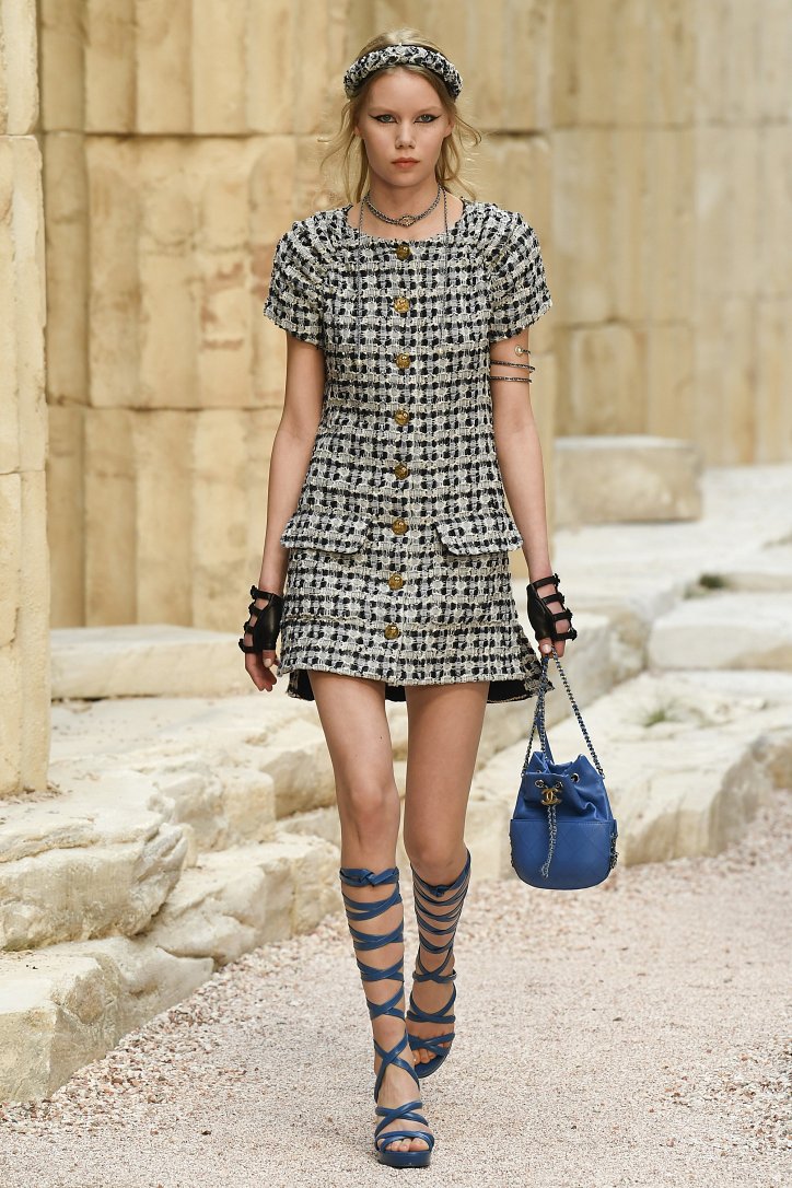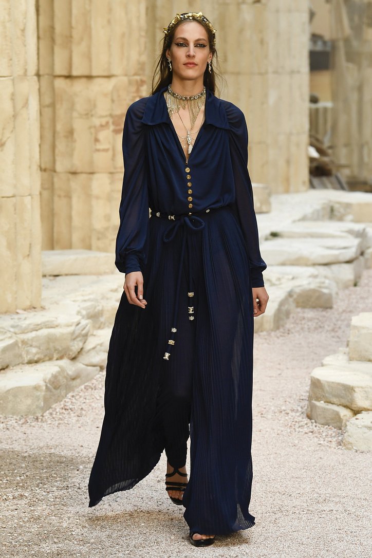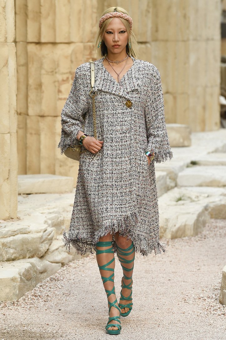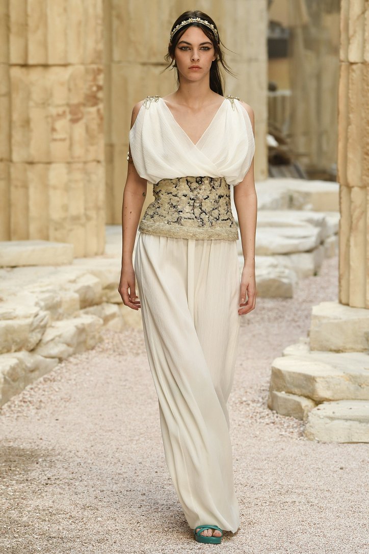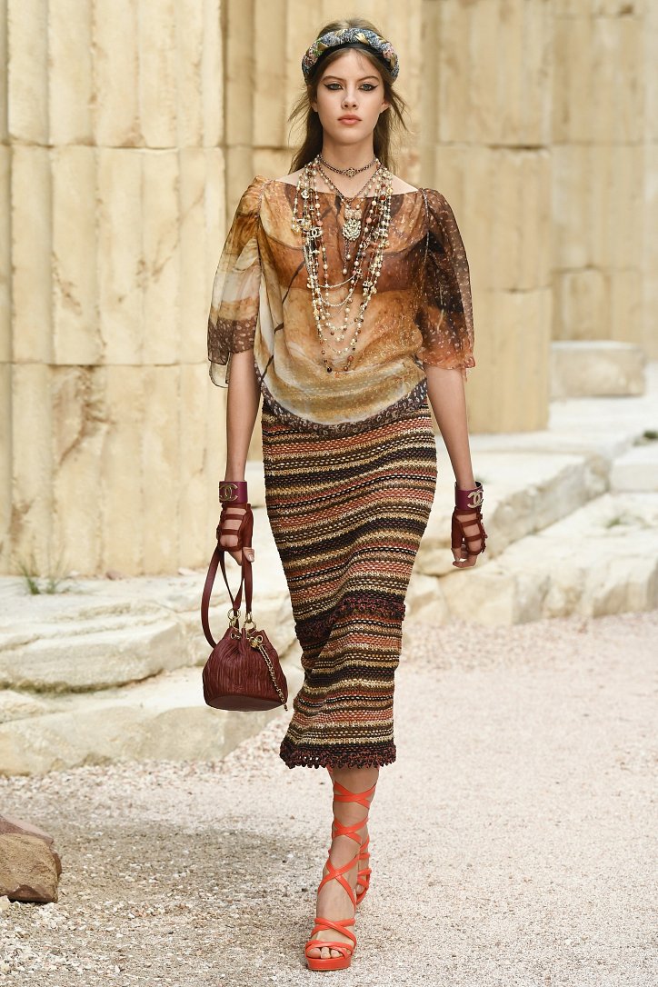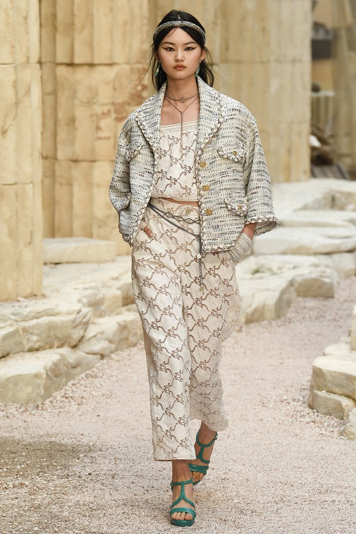 На фоне полуразрушенных колонн и статуй горделиво и чинно выступали модели, демонстрирующие греческий идеал красоты в современной интерпретации Карла Лагерфльда. Круизная коллекция Chanel порадовала поклонниц дома моды светлыми хитонами и твидовыми костюмами (куда же без них!), летящими платьями из шифона в стиле ампир и украшенными драгоценными камнями повязками. Центральным же элементом коллекции стали греческие сандалии всех цветов.