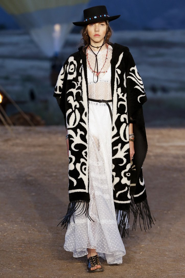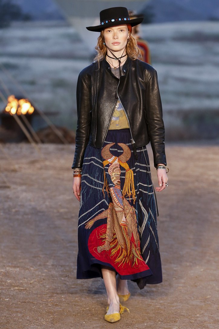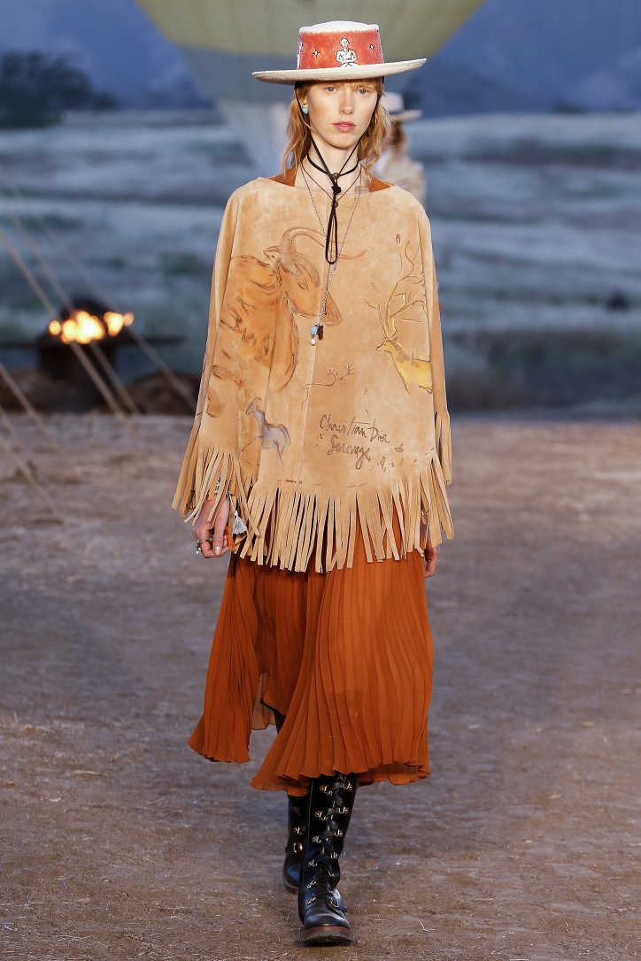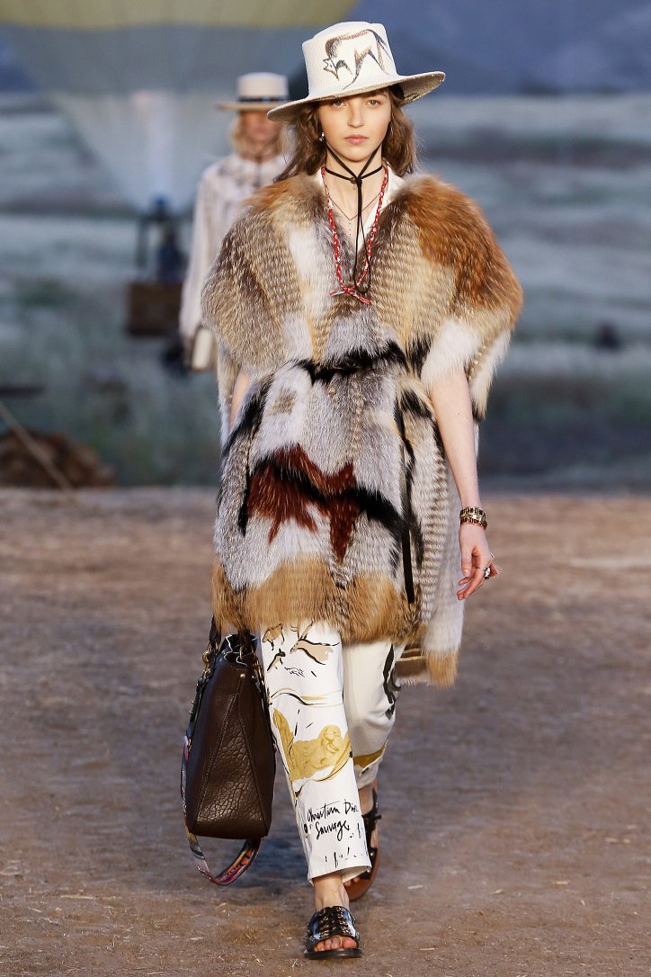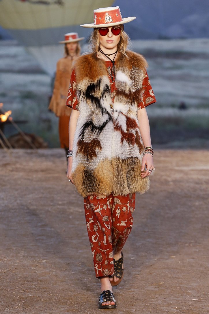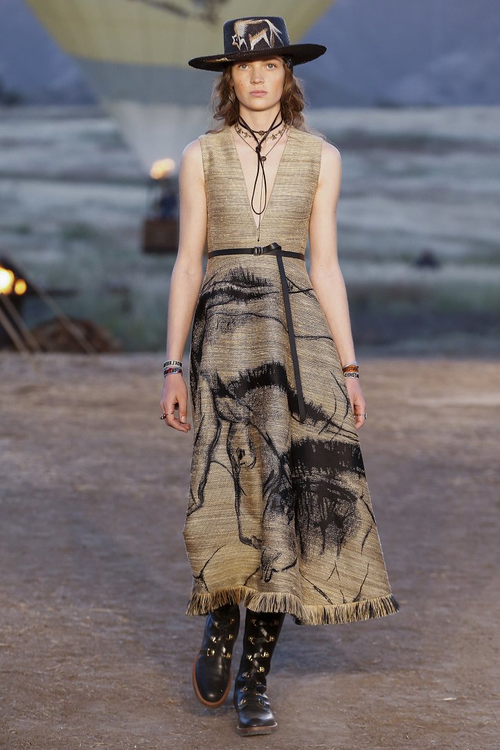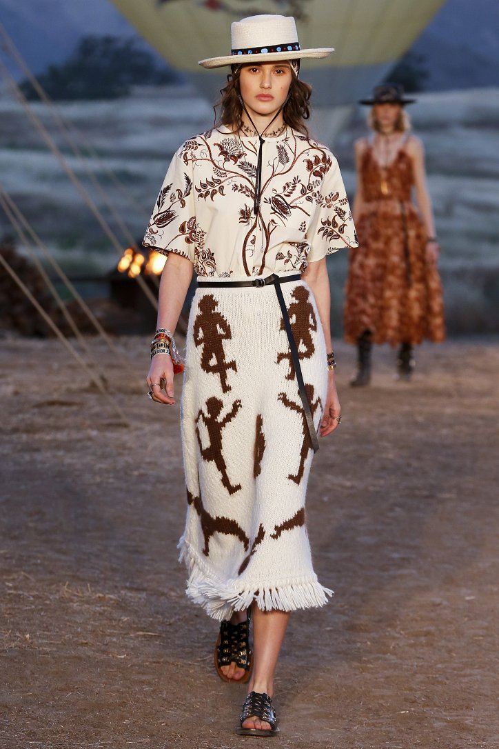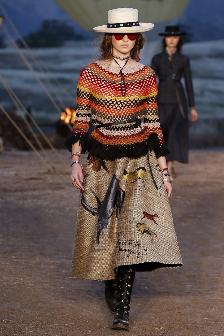 Круизная коллекция Christian Dior словно призывает женщин вспомнить о природной магии, интуиции и тех глубоких архетипических образах, который в современной жизни так часто бывают забыты. Об этой связи с духом природы дизайнер напоминает с помощью принтов, похожих на наскальные рисунки из пещеры Ласко. «Первобытные» рисунки на шелковых и хлопковых платьях, юбках и пончо сочетаются в коллекции с широкополыми шляпами, без которых не обойтись в жаркой пустыне, «индейскими» накидками, бахромой и украшениями из бусин.