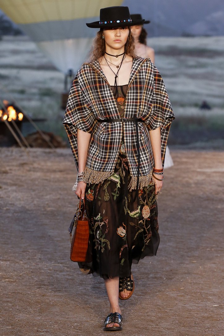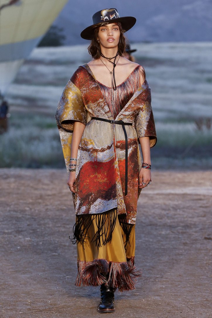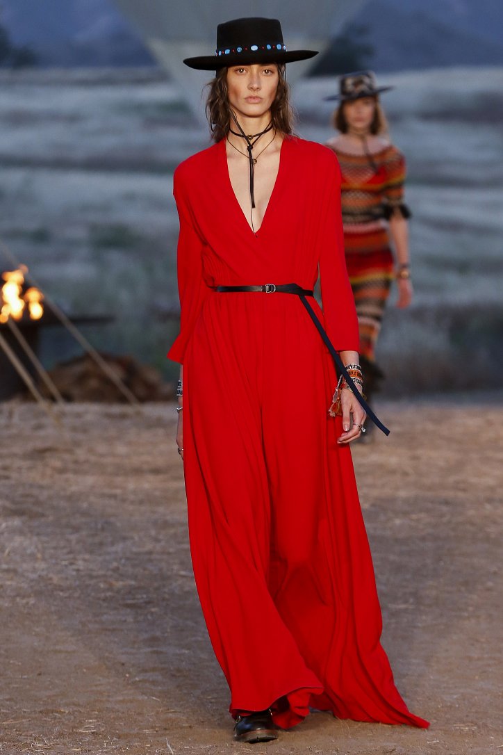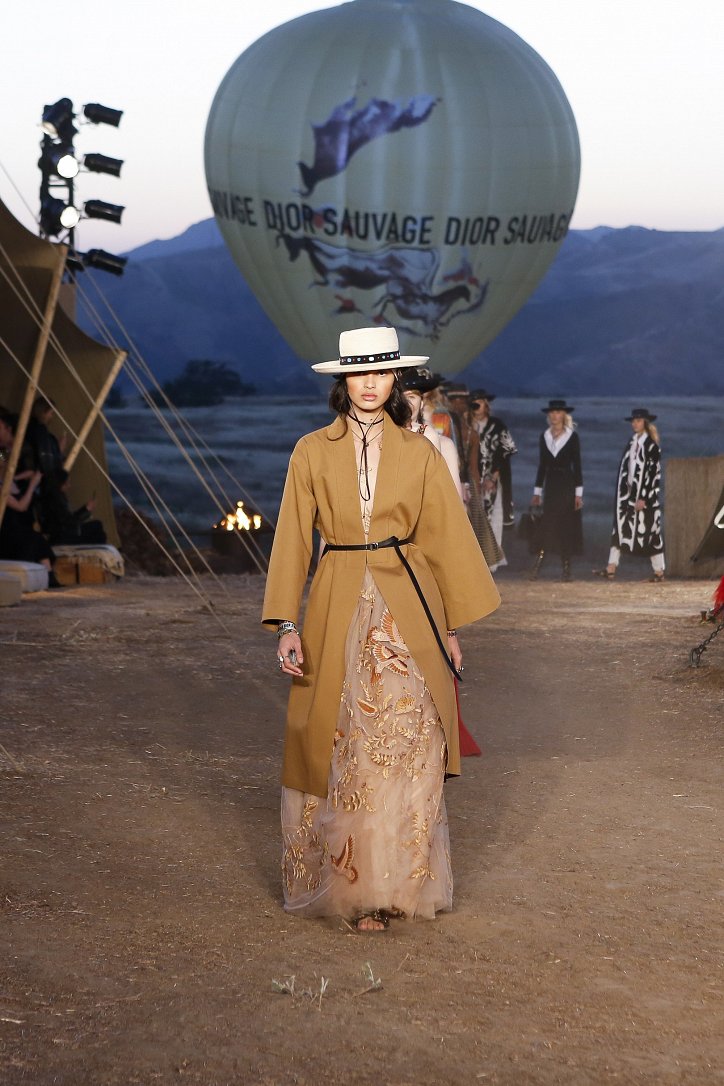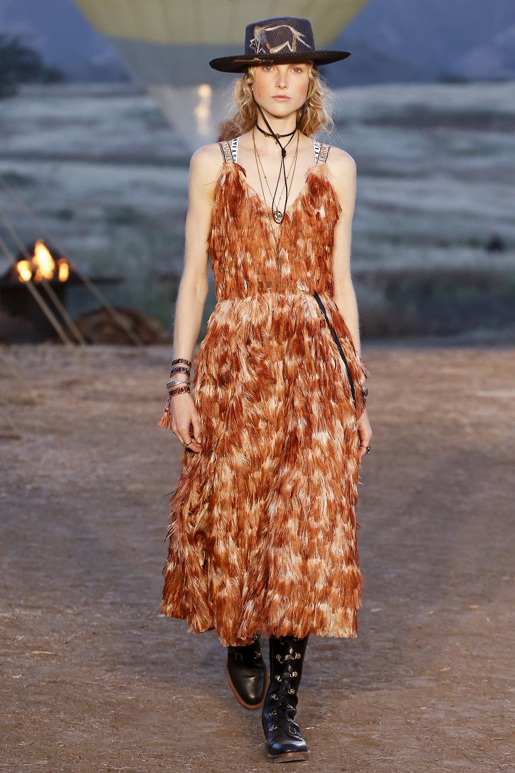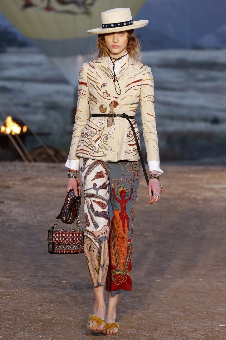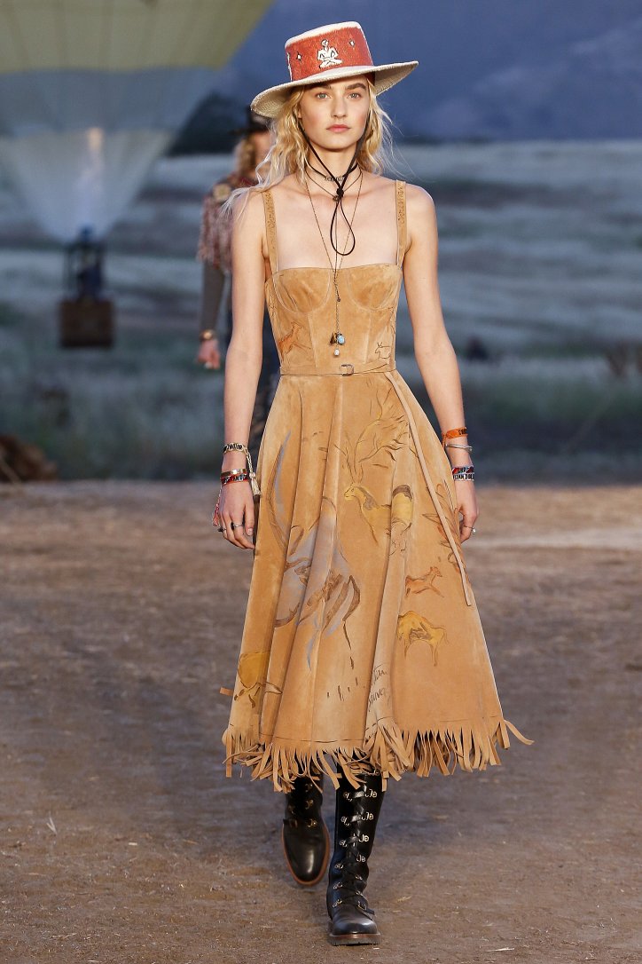Круизная коллекция Christian Dior словно призывает женщин вспомнить о природной магии, интуиции и тех глубоких архетипических образах, который в современной жизни так часто бывают забыты. Об этой связи с духом природы дизайнер напоминает с помощью принтов, похожих на наскальные рисунки из пещеры Ласко. «Первобытные» рисунки на шелковых и хлопковых платьях, юбках и пончо сочетаются в коллекции с широкополыми шляпами, без которых не обойтись в жаркой пустыне, «индейскими» накидками, бахромой и украшениями из бусин.