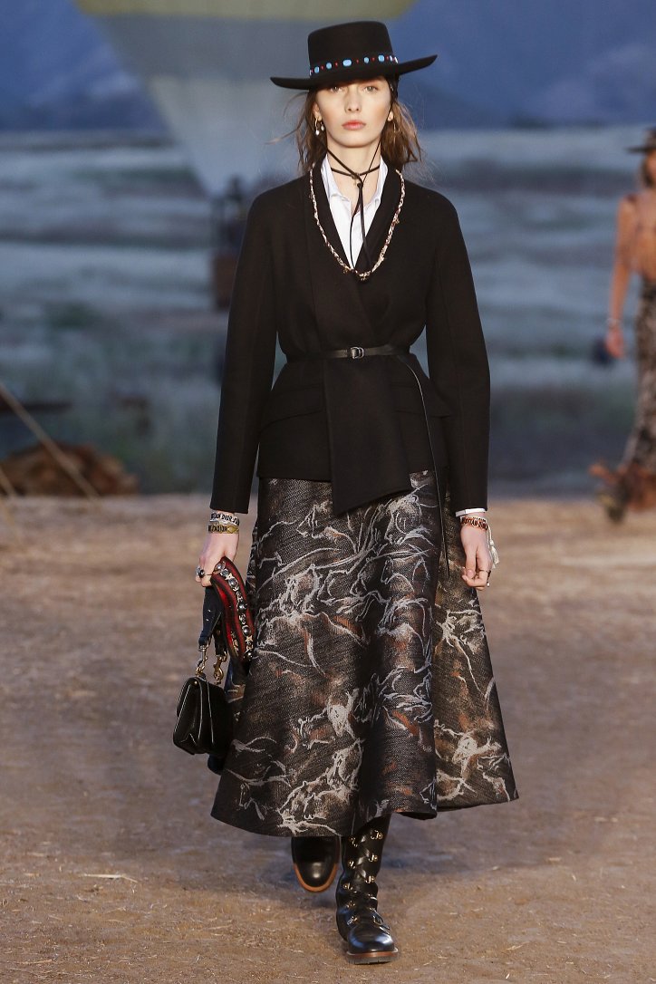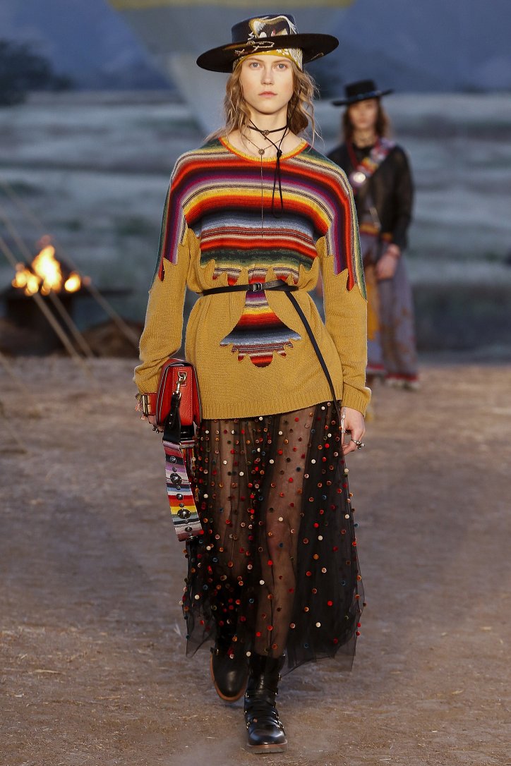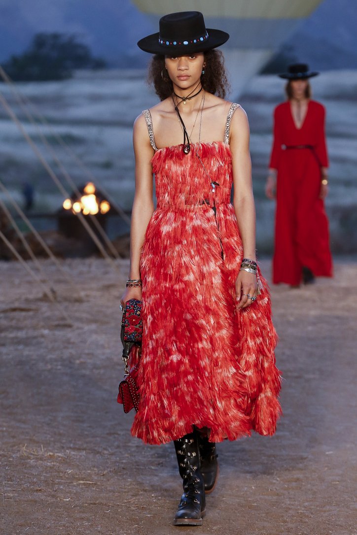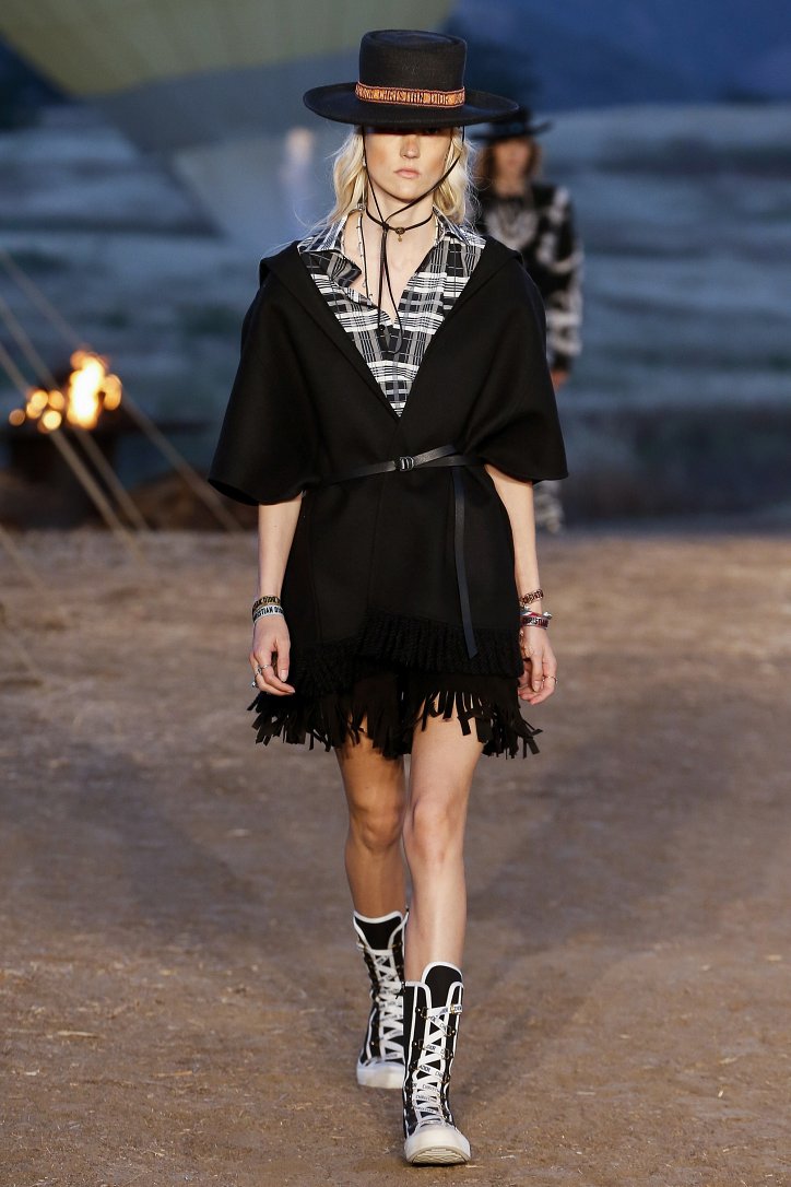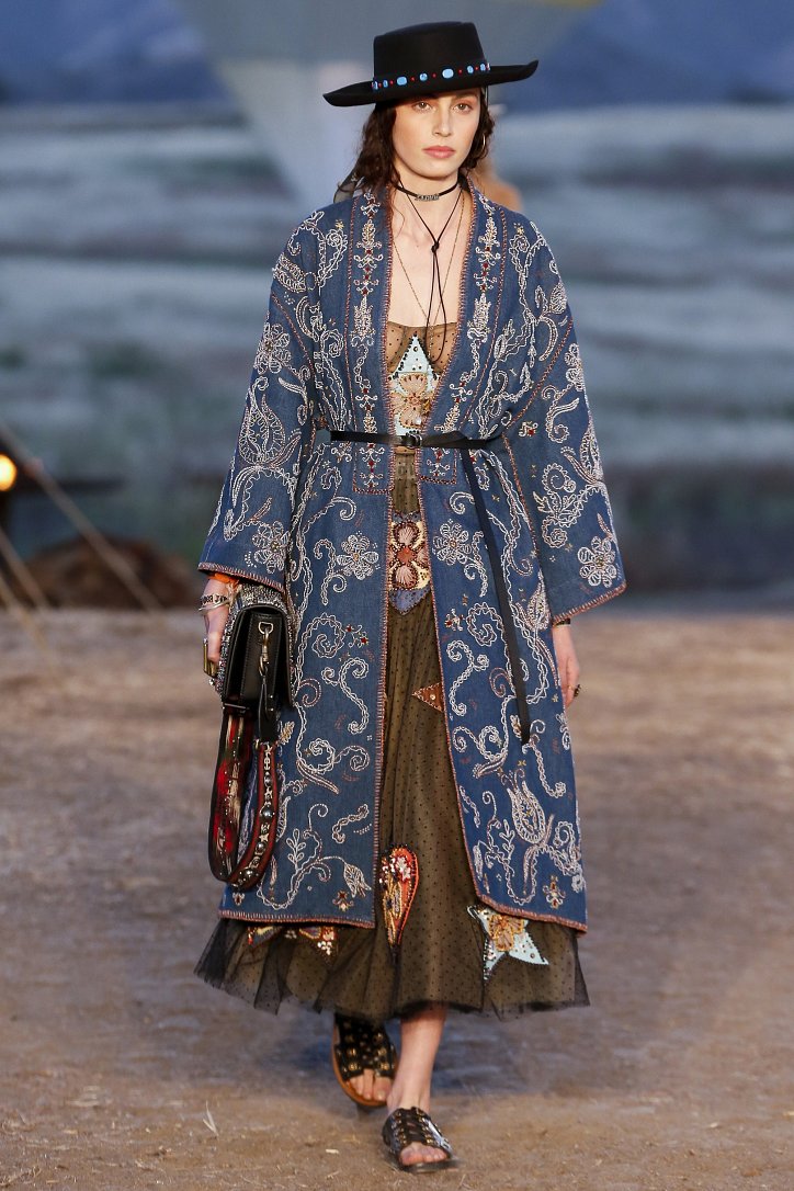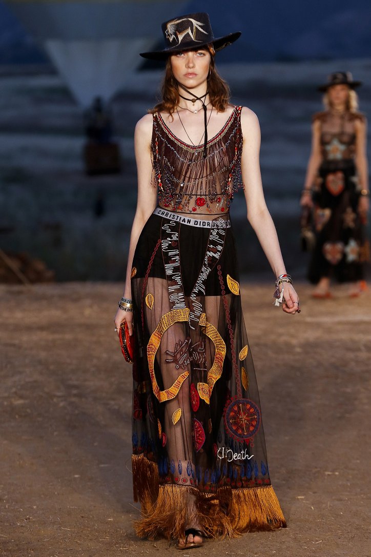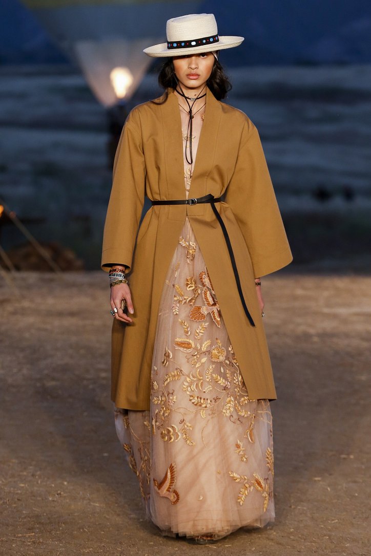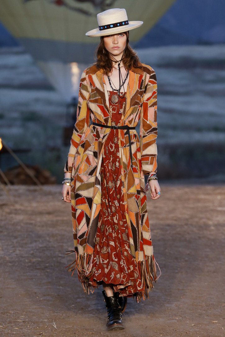 Круизная коллекция Christian Dior словно призывает женщин вспомнить о природной магии, интуиции и тех глубоких архетипических образах, который в современной жизни так часто бывают забыты. Об этой связи с духом природы дизайнер напоминает с помощью принтов, похожих на наскальные рисунки из пещеры Ласко. «Первобытные» рисунки на шелковых и хлопковых платьях, юбках и пончо сочетаются в коллекции с широкополыми шляпами, без которых не обойтись в жаркой пустыне, «индейскими» накидками, бахромой и украшениями из бусин.