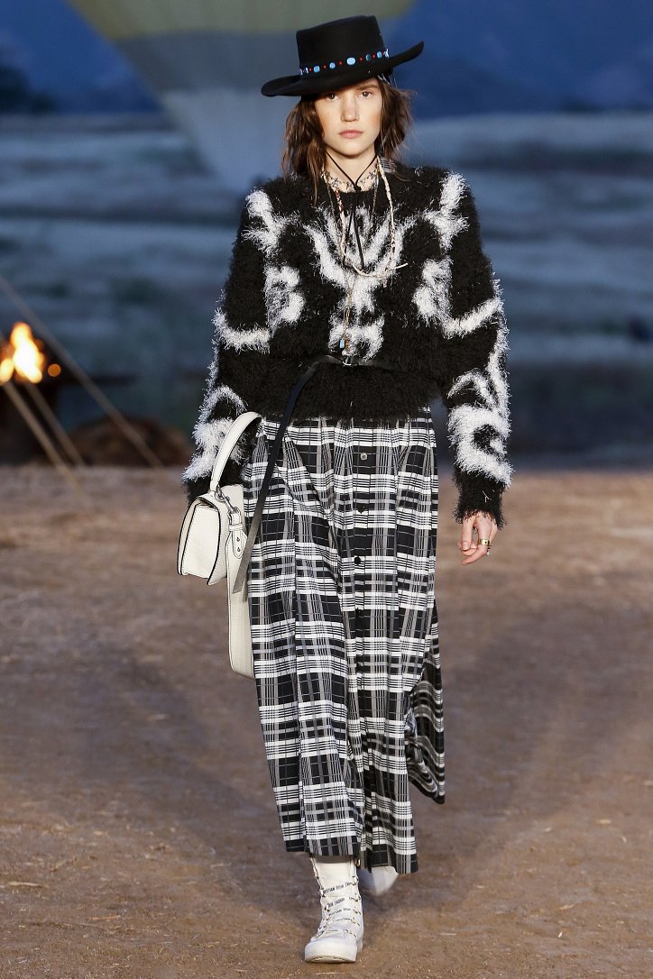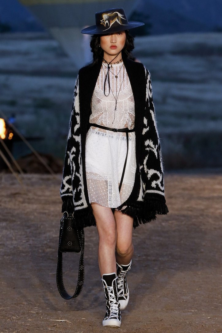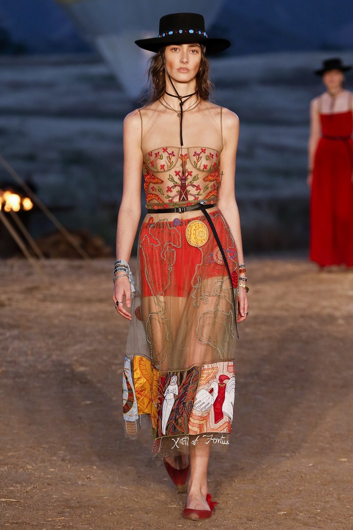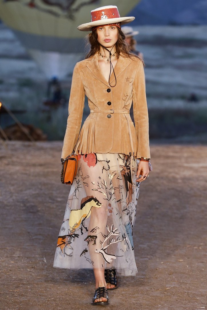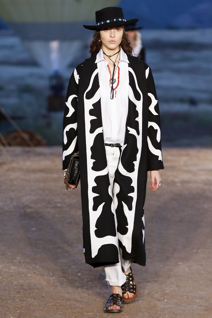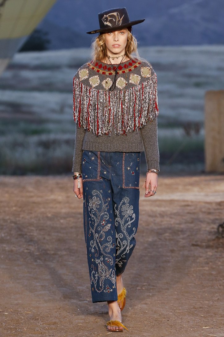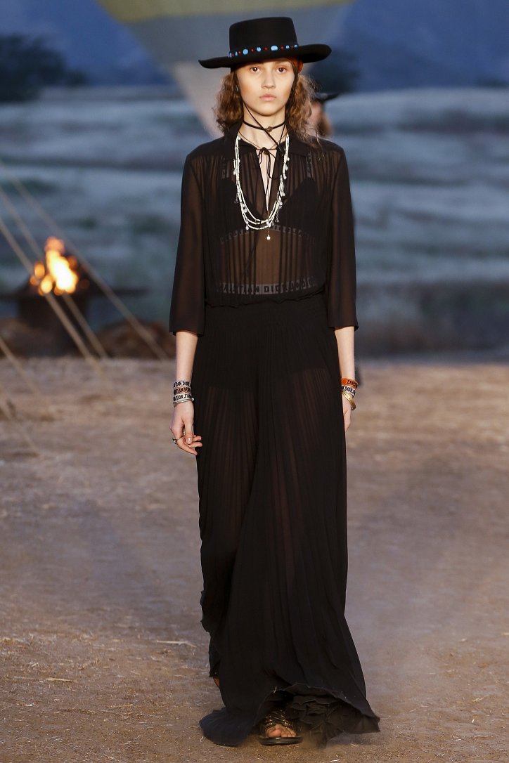 Круизная коллекция Christian Dior словно призывает женщин вспомнить о природной магии, интуиции и тех глубоких архетипических образах, который в современной жизни так часто бывают забыты. Об этой связи с духом природы дизайнер напоминает с помощью принтов, похожих на наскальные рисунки из пещеры Ласко. «Первобытные» рисунки на шелковых и хлопковых платьях, юбках и пончо сочетаются в коллекции с широкополыми шляпами, без которых не обойтись в жаркой пустыне, «индейскими» накидками, бахромой и украшениями из бусин.