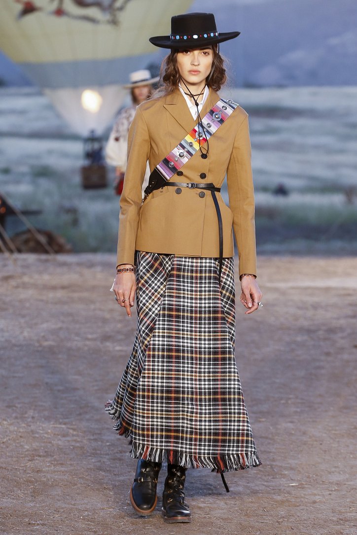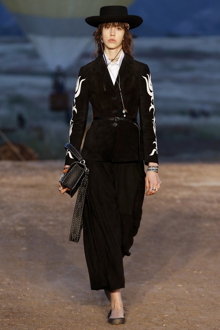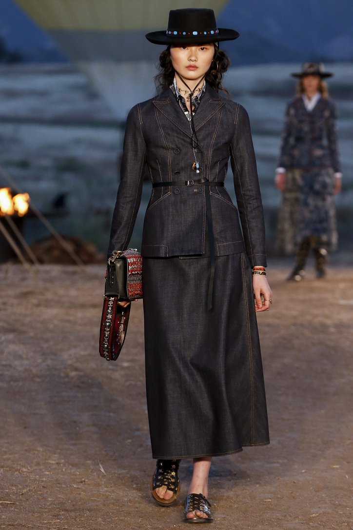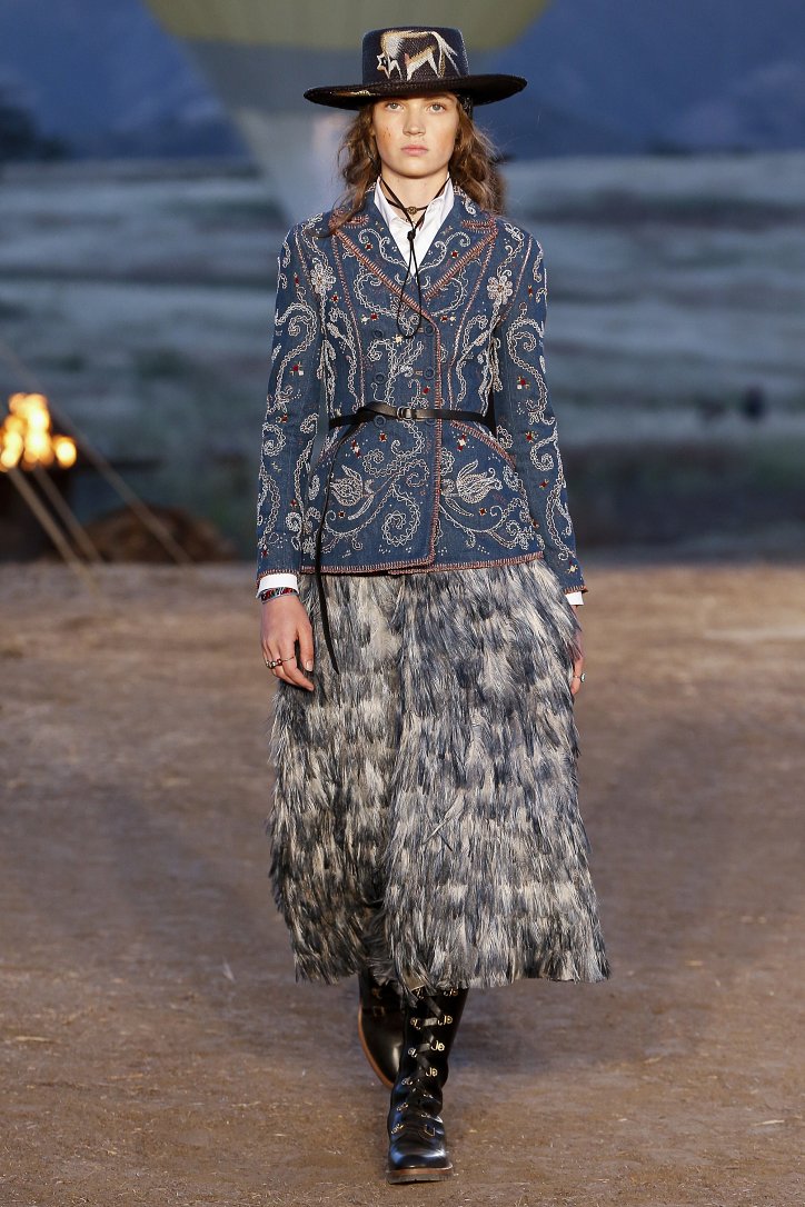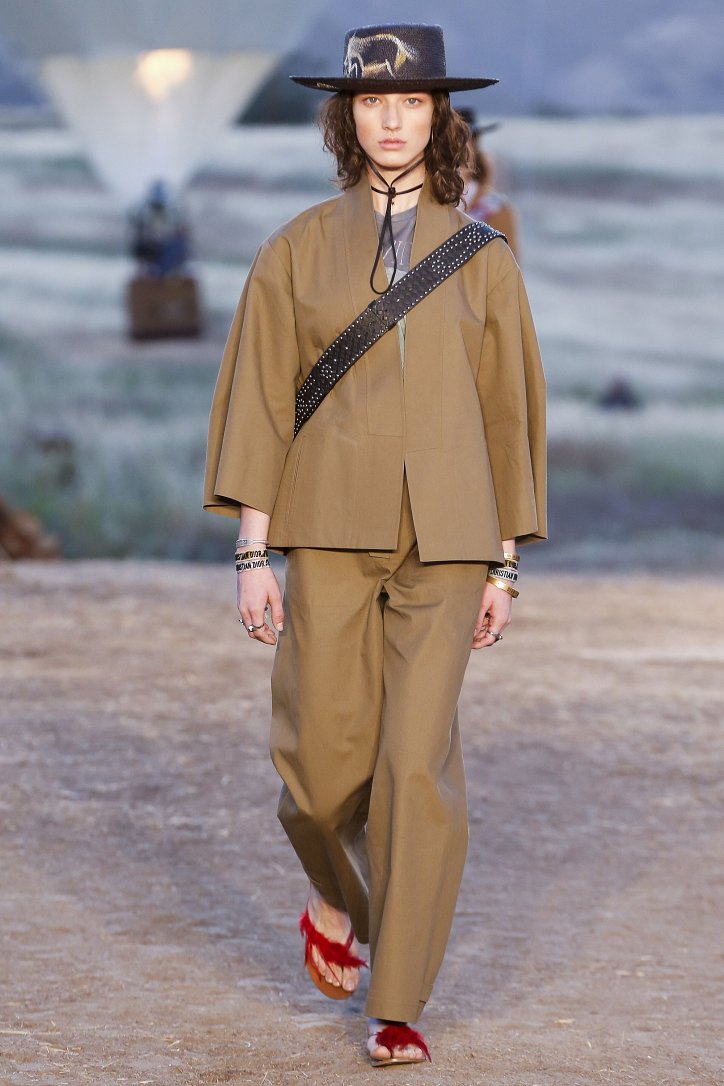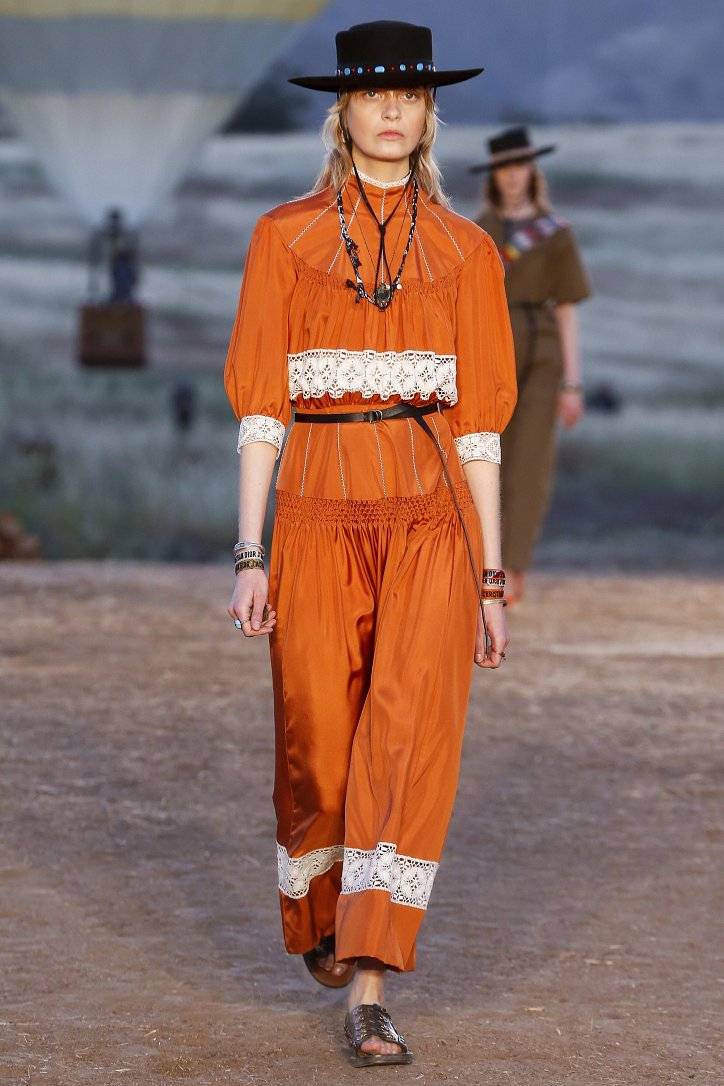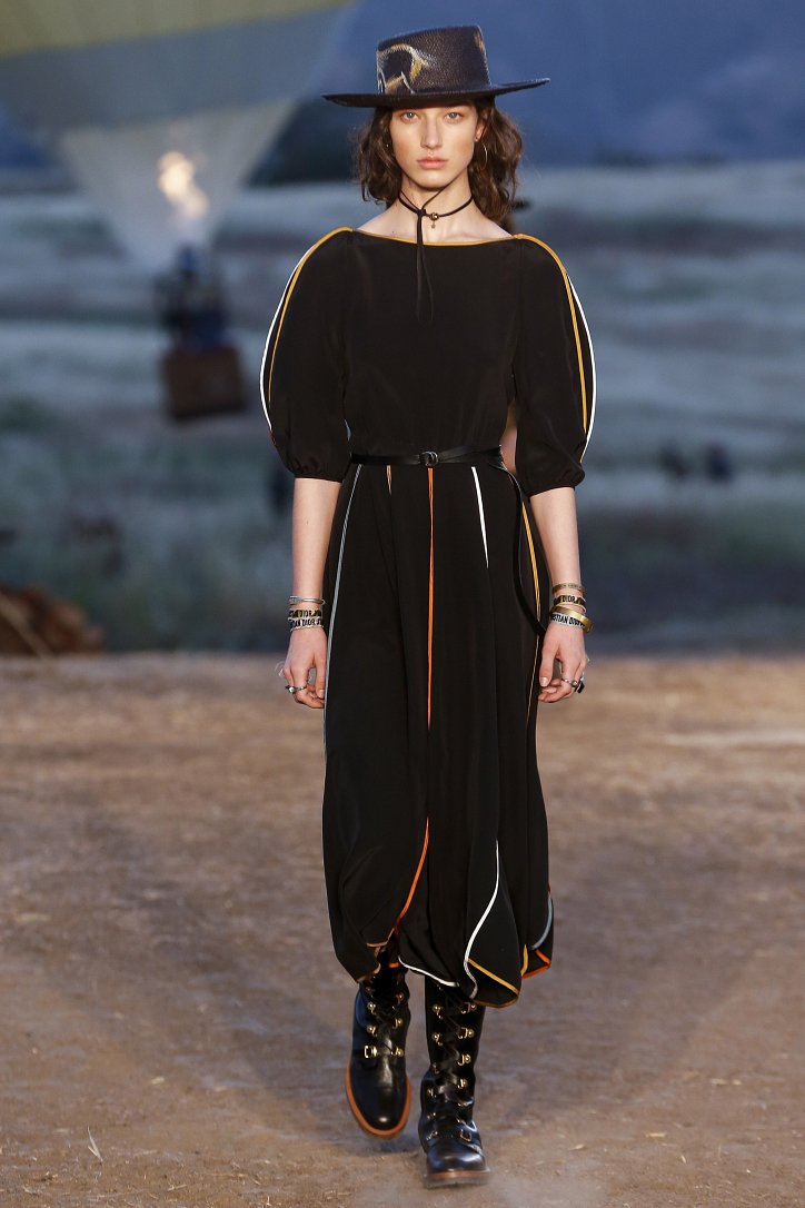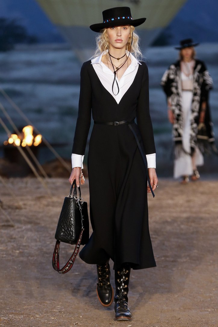 Круизная коллекция Christian Dior словно призывает женщин вспомнить о природной магии, интуиции и тех глубоких архетипических образах, который в современной жизни так часто бывают забыты. Об этой связи с духом природы дизайнер напоминает с помощью принтов, похожих на наскальные рисунки из пещеры Ласко. «Первобытные» рисунки на шелковых и хлопковых платьях, юбках и пончо сочетаются в коллекции с широкополыми шляпами, без которых не обойтись в жаркой пустыне, «индейскими» накидками, бахромой и украшениями из бусин.