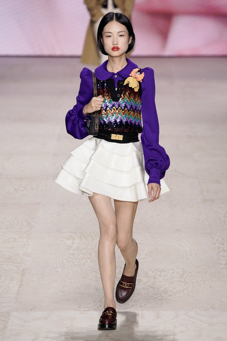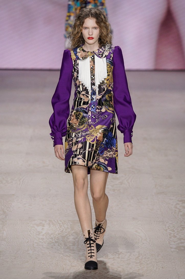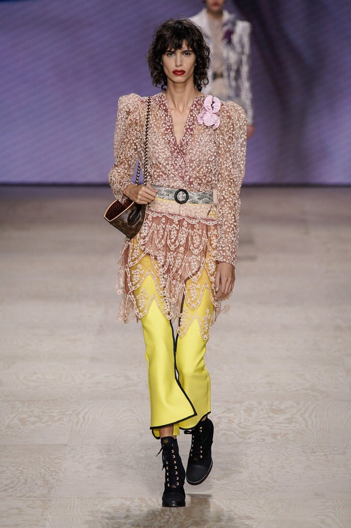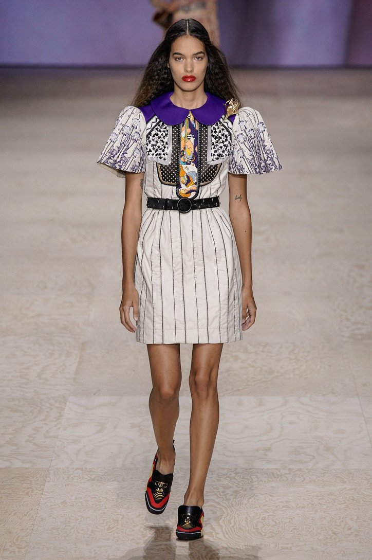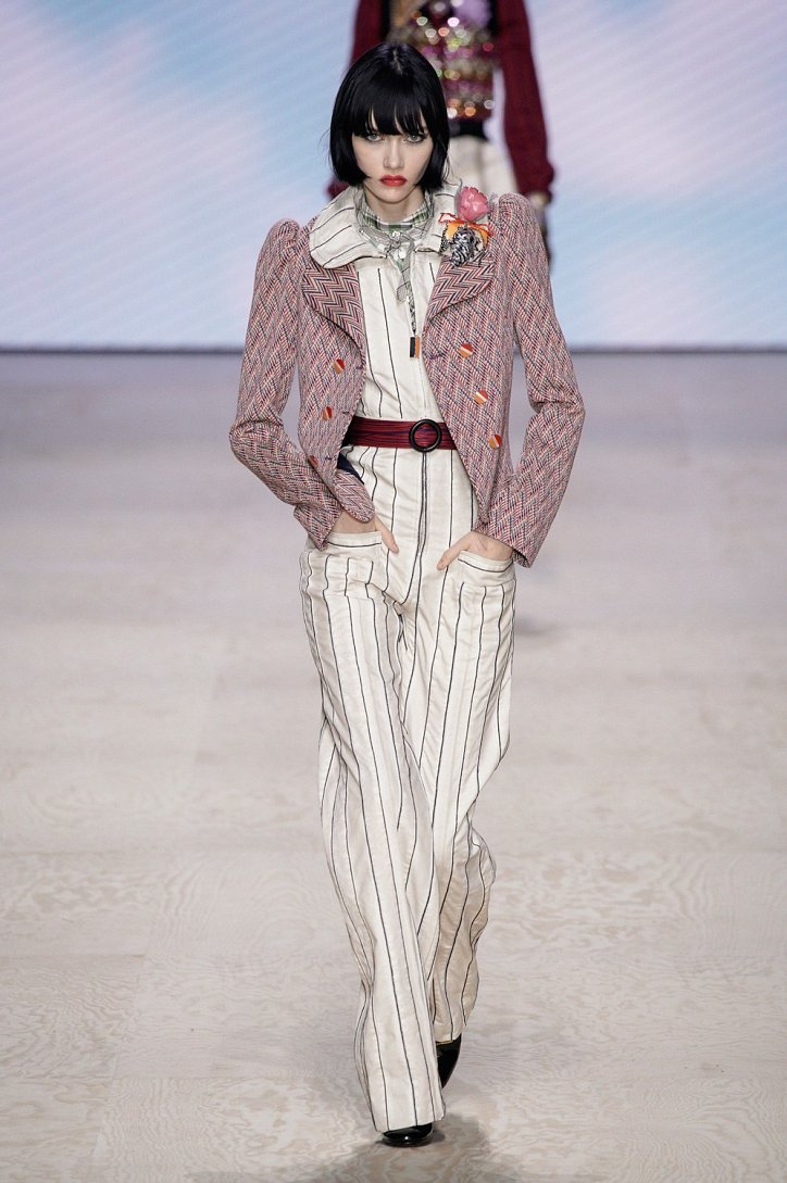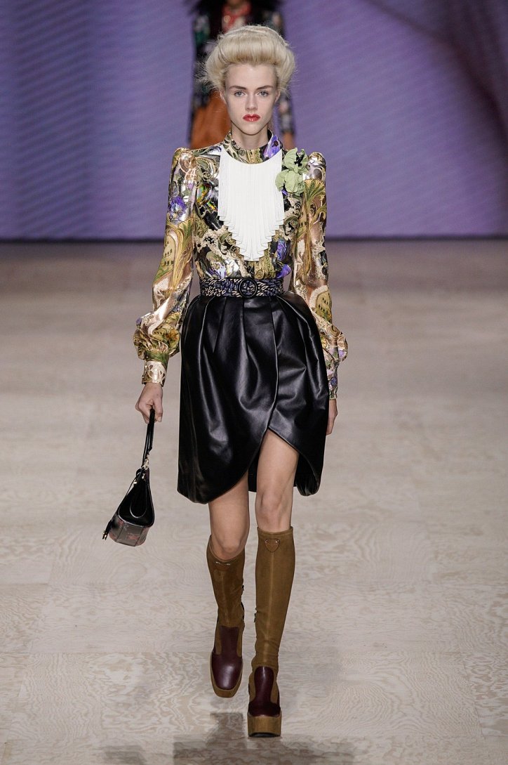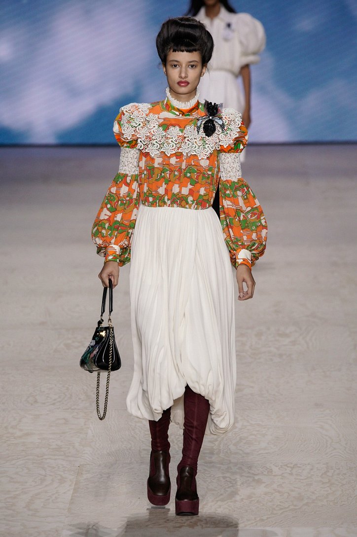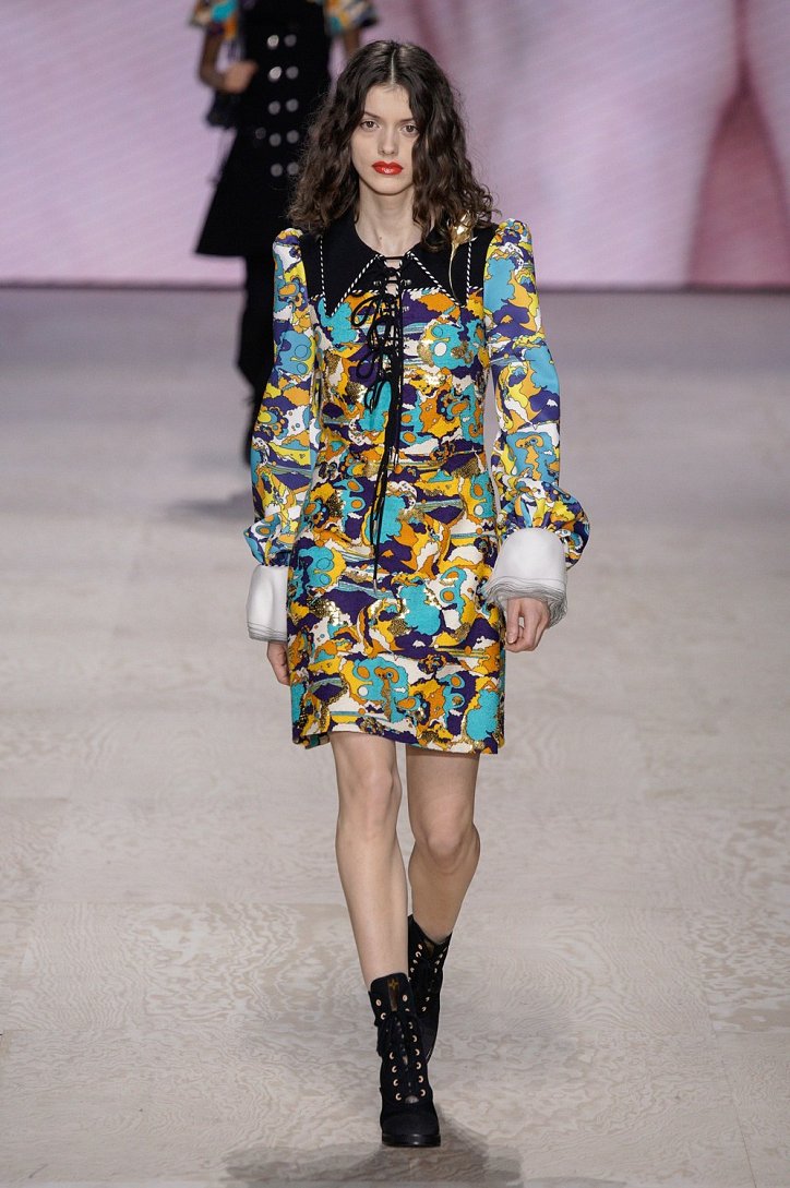 Отсылок к Прекрасной эпохе было множество: рукава-буфы на блузах и рубашках, живописные цветочные принты на платьях, «ангельские» лица на кожаной куртке, психоделические завитки на жаккардовых пальто. Вошли в коллекцию и множество различных моделей мини-юбок, и кожаный тренч, и широкие брюки.