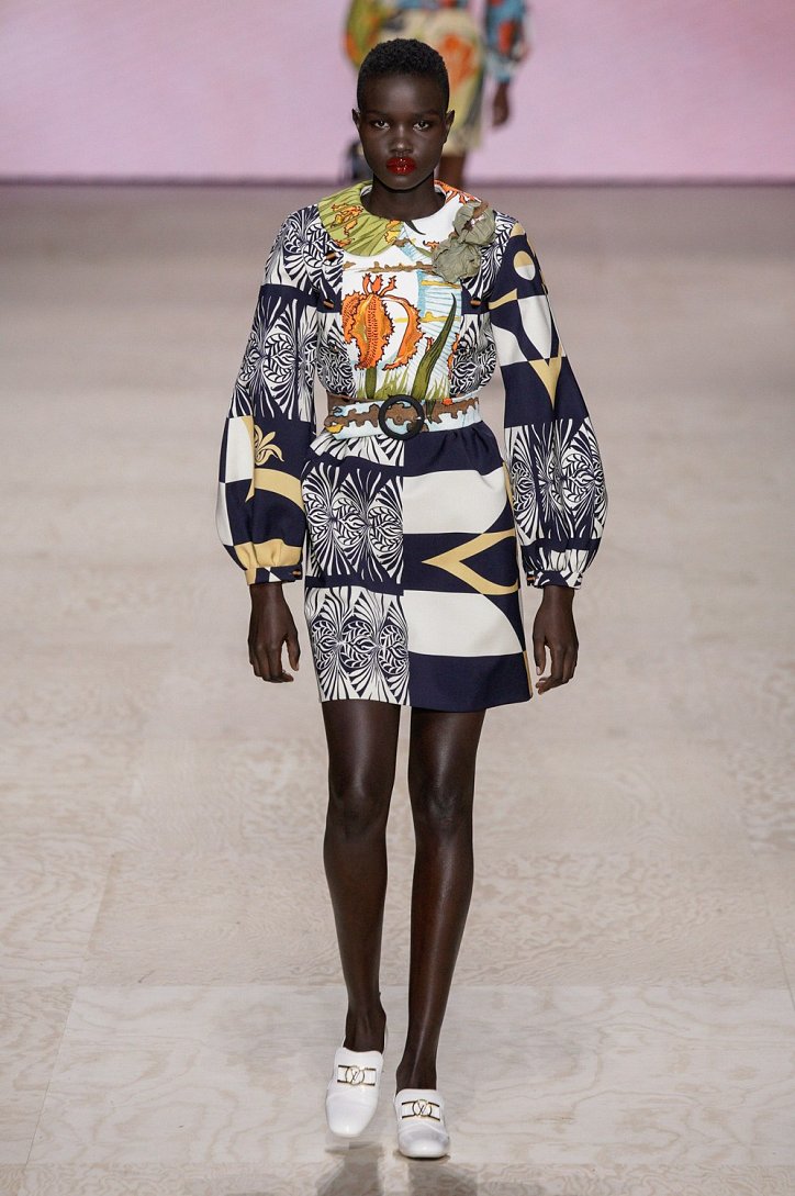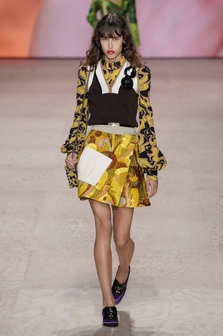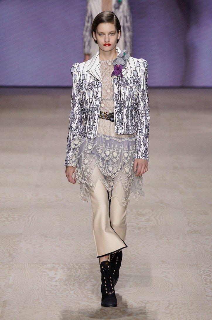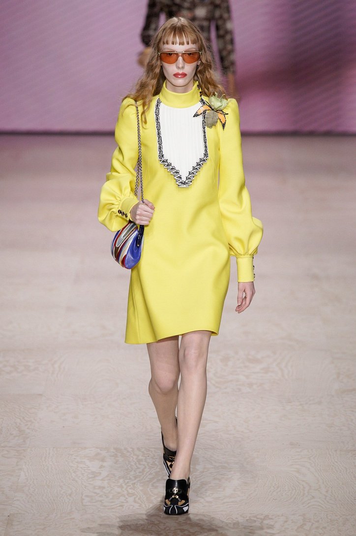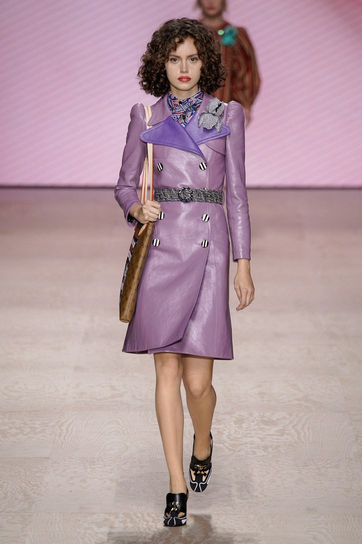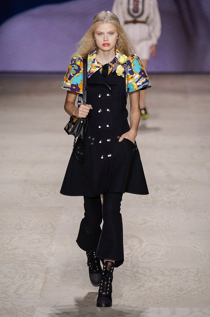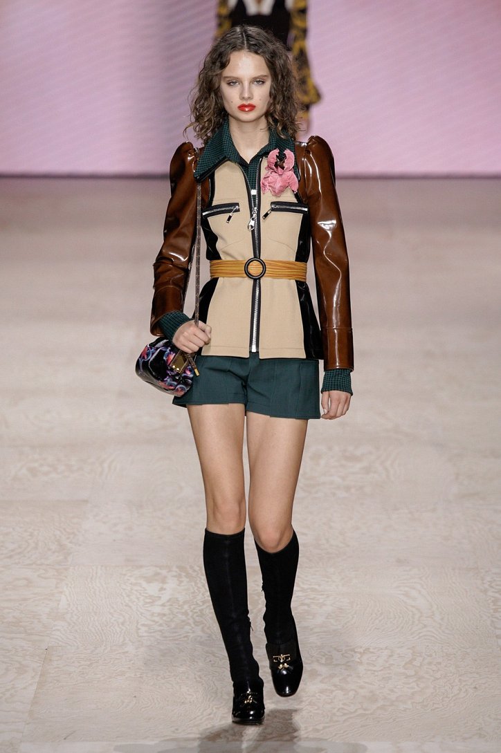 Отсылок к Прекрасной эпохе было множество: рукава-буфы на блузах и рубашках, живописные цветочные принты на платьях, «ангельские» лица на кожаной куртке, психоделические завитки на жаккардовых пальто. Вошли в коллекцию и множество различных моделей мини-юбок, и кожаный тренч, и широкие брюки.