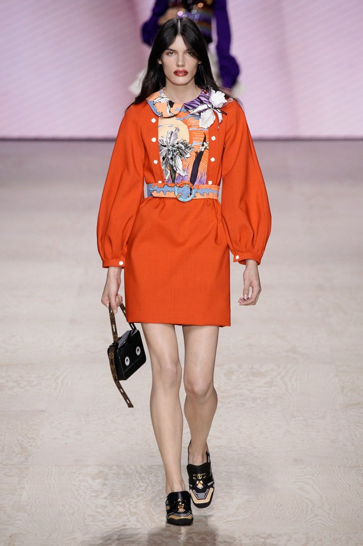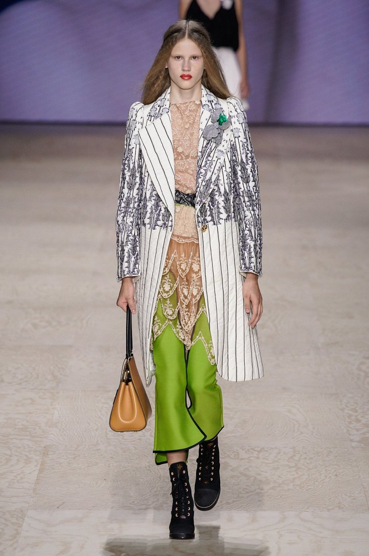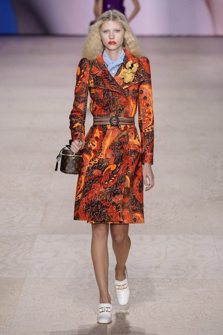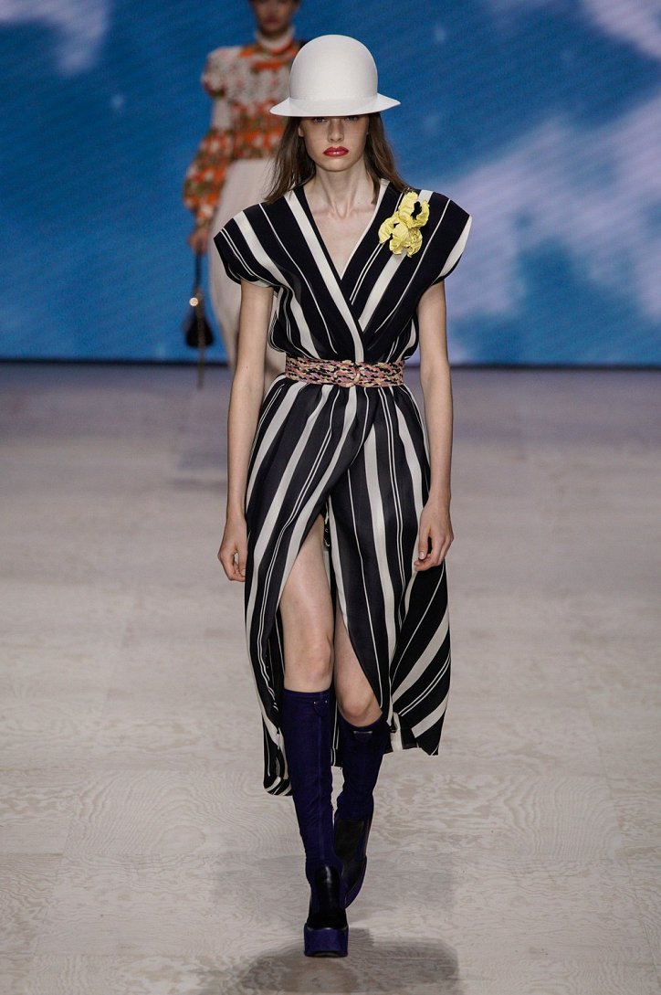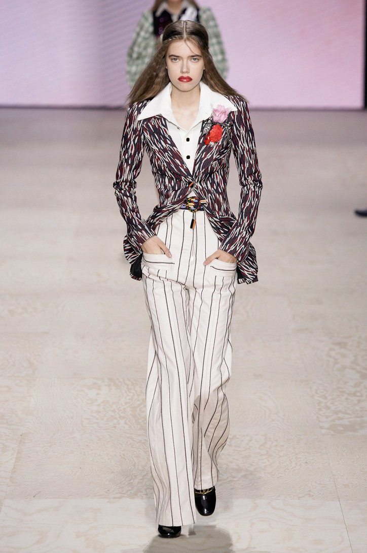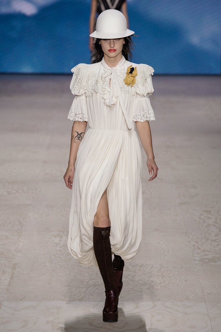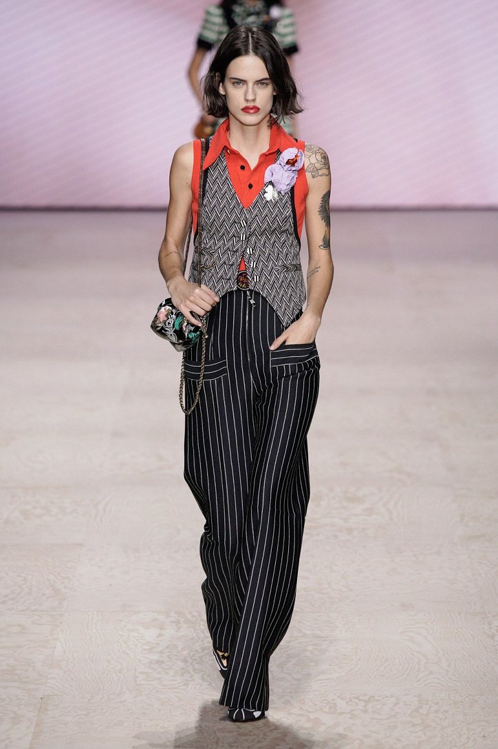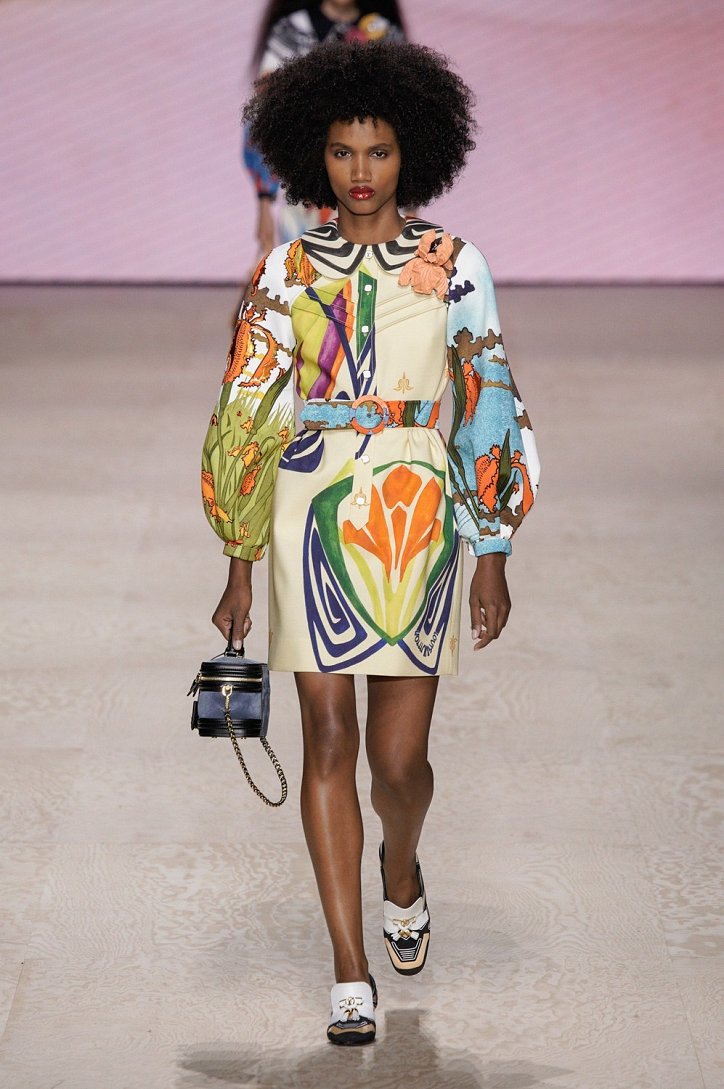 Отсылок к Прекрасной эпохе было множество: рукава-буфы на блузах и рубашках, живописные цветочные принты на платьях, «ангельские» лица на кожаной куртке, психоделические завитки на жаккардовых пальто. Вошли в коллекцию и множество различных моделей мини-юбок, и кожаный тренч, и широкие брюки.
