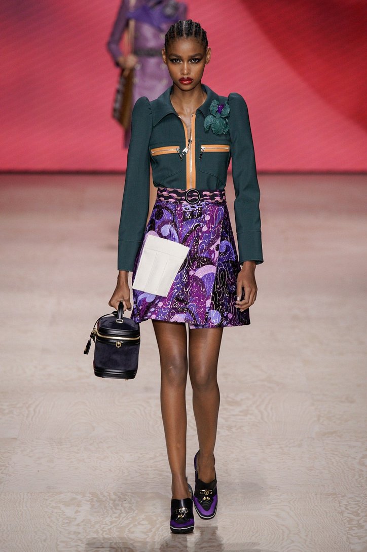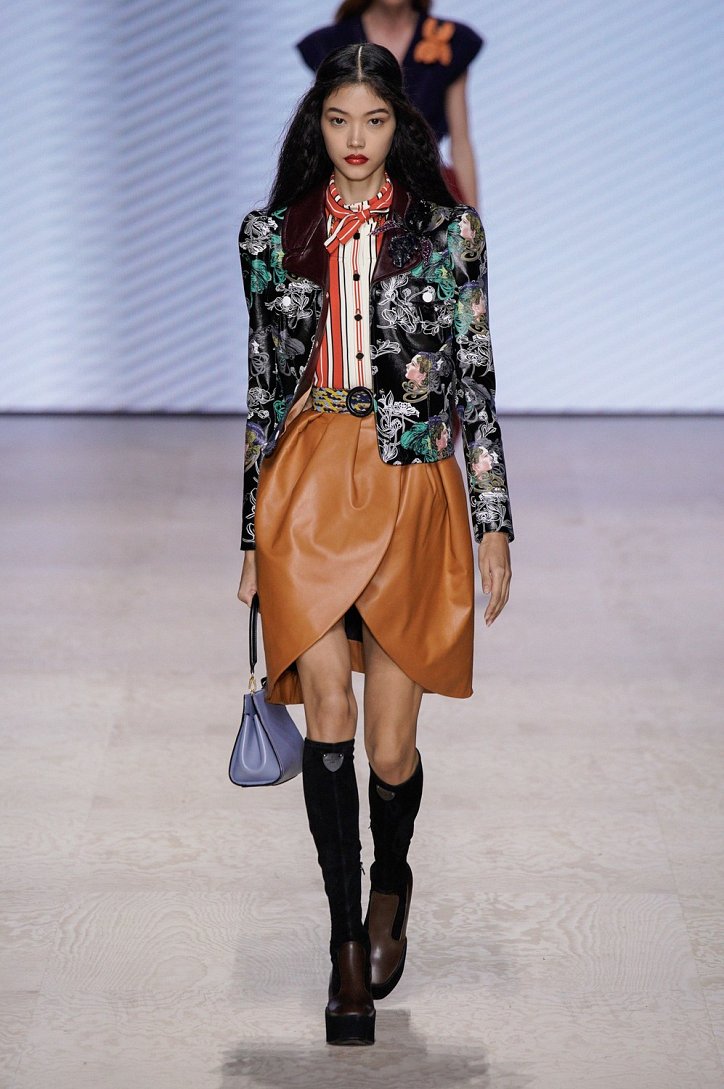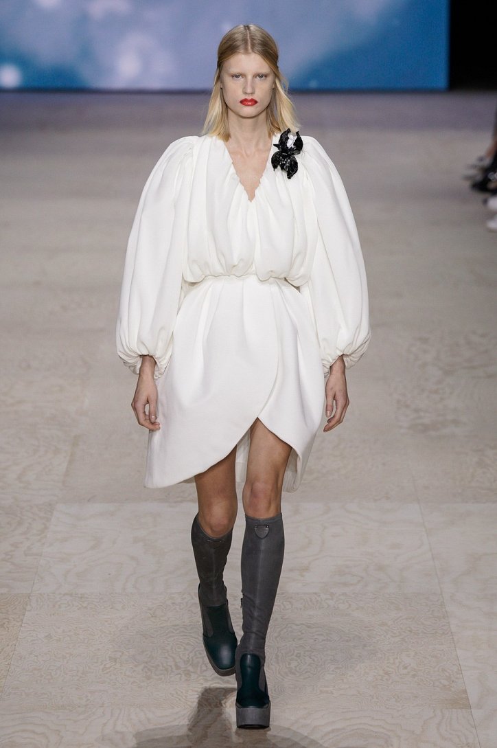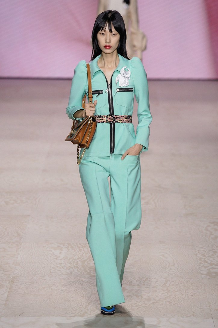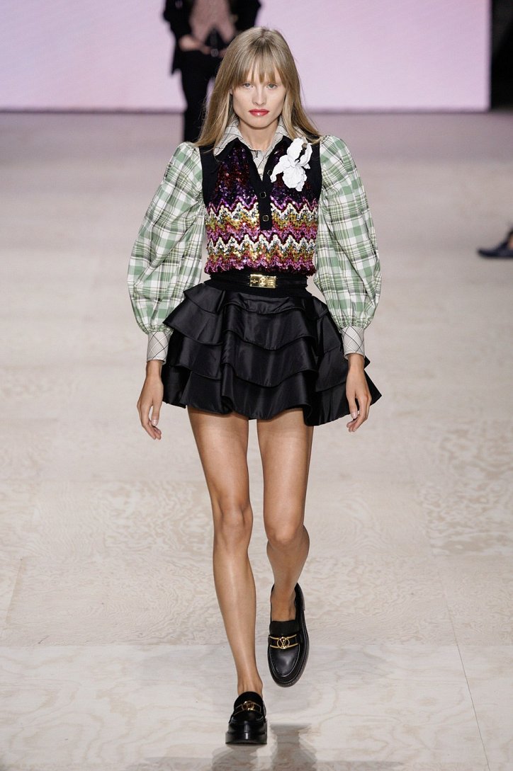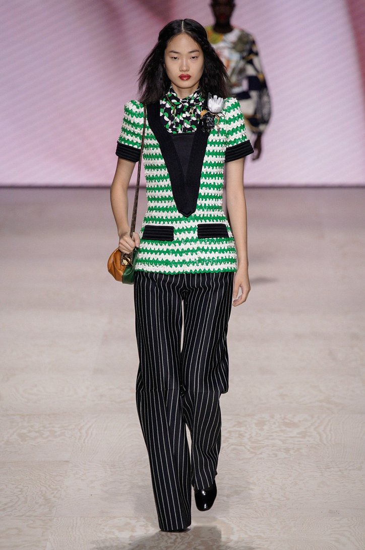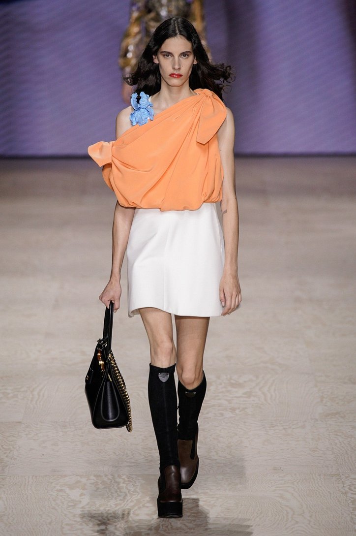 Отсылок к Прекрасной эпохе было множество: рукава-буфы на блузах и рубашках, живописные цветочные принты на платьях, «ангельские» лица на кожаной куртке, психоделические завитки на жаккардовых пальто. Вошли в коллекцию и множество различных моделей мини-юбок, и кожаный тренч, и широкие брюки.