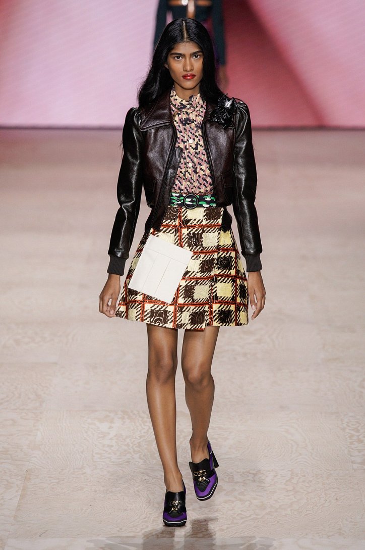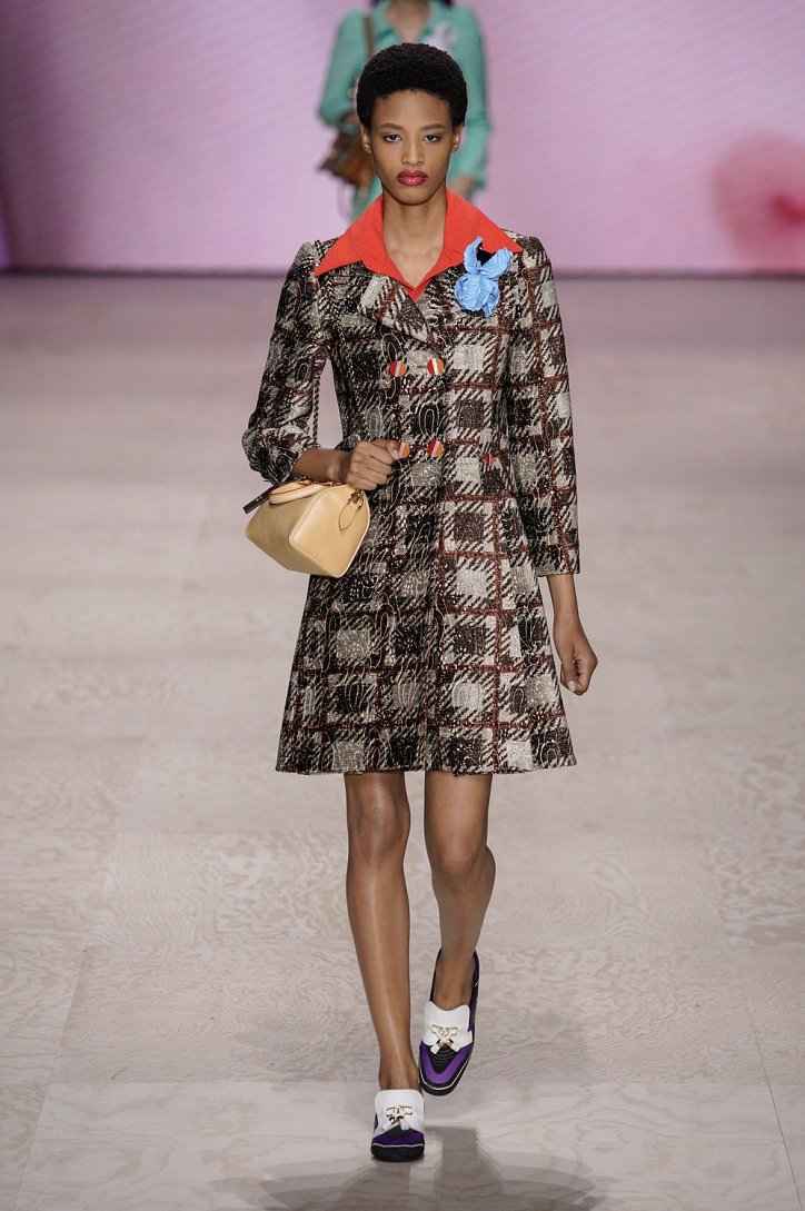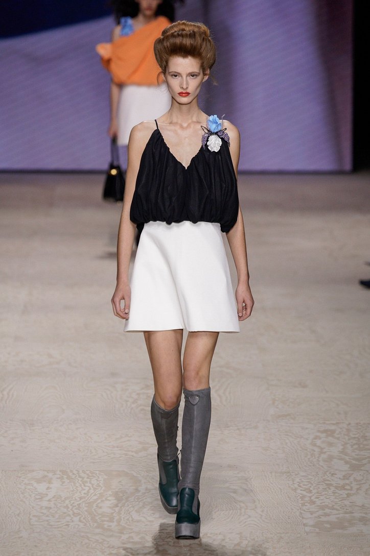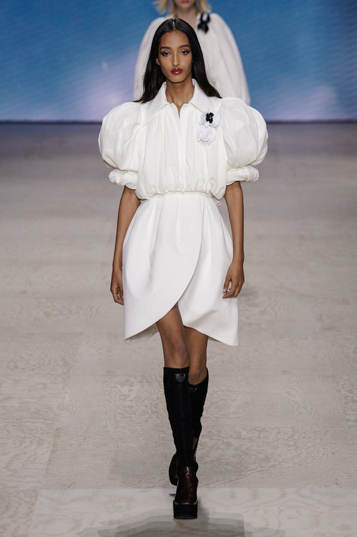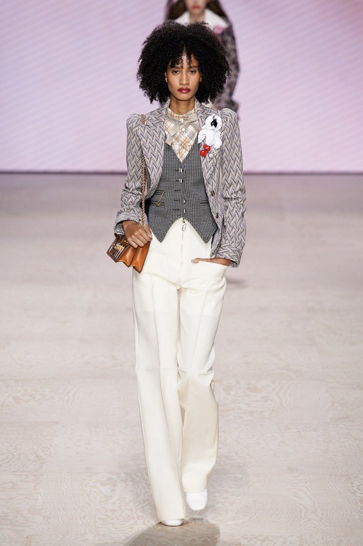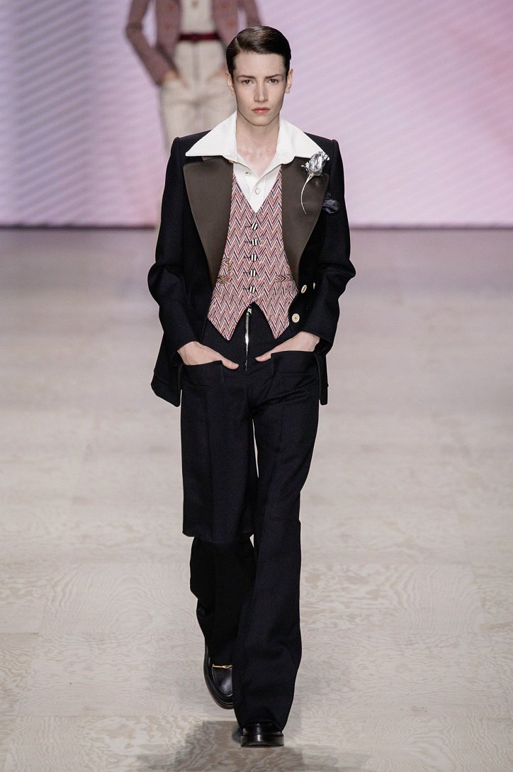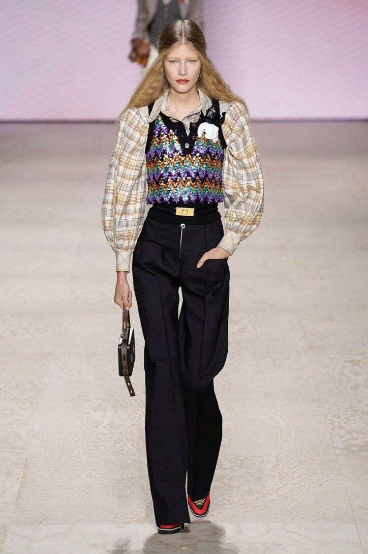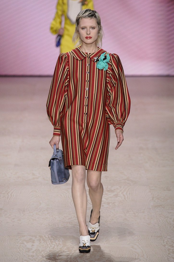 Отсылок к Прекрасной эпохе было множество: рукава-буфы на блузах и рубашках, живописные цветочные принты на платьях, «ангельские» лица на кожаной куртке, психоделические завитки на жаккардовых пальто. Вошли в коллекцию и множество различных моделей мини-юбок, и кожаный тренч, и широкие брюки.