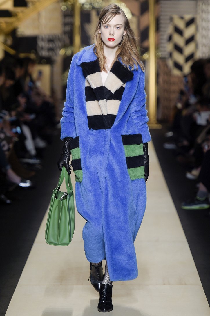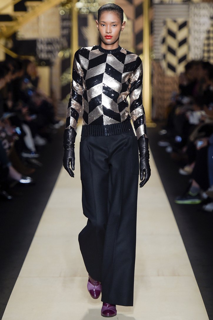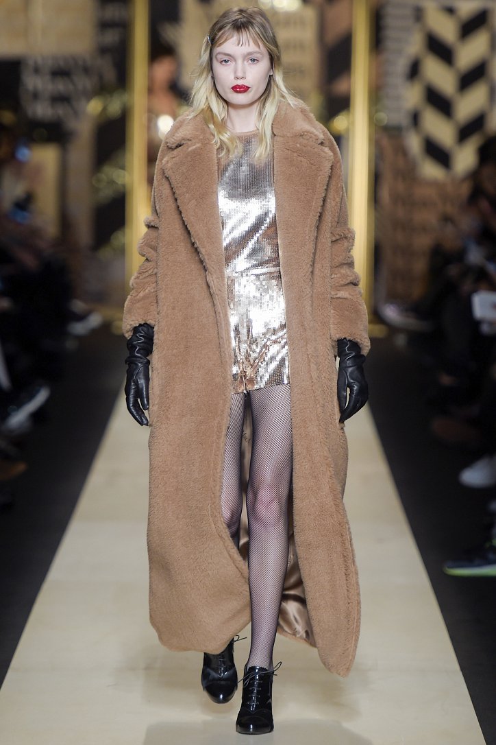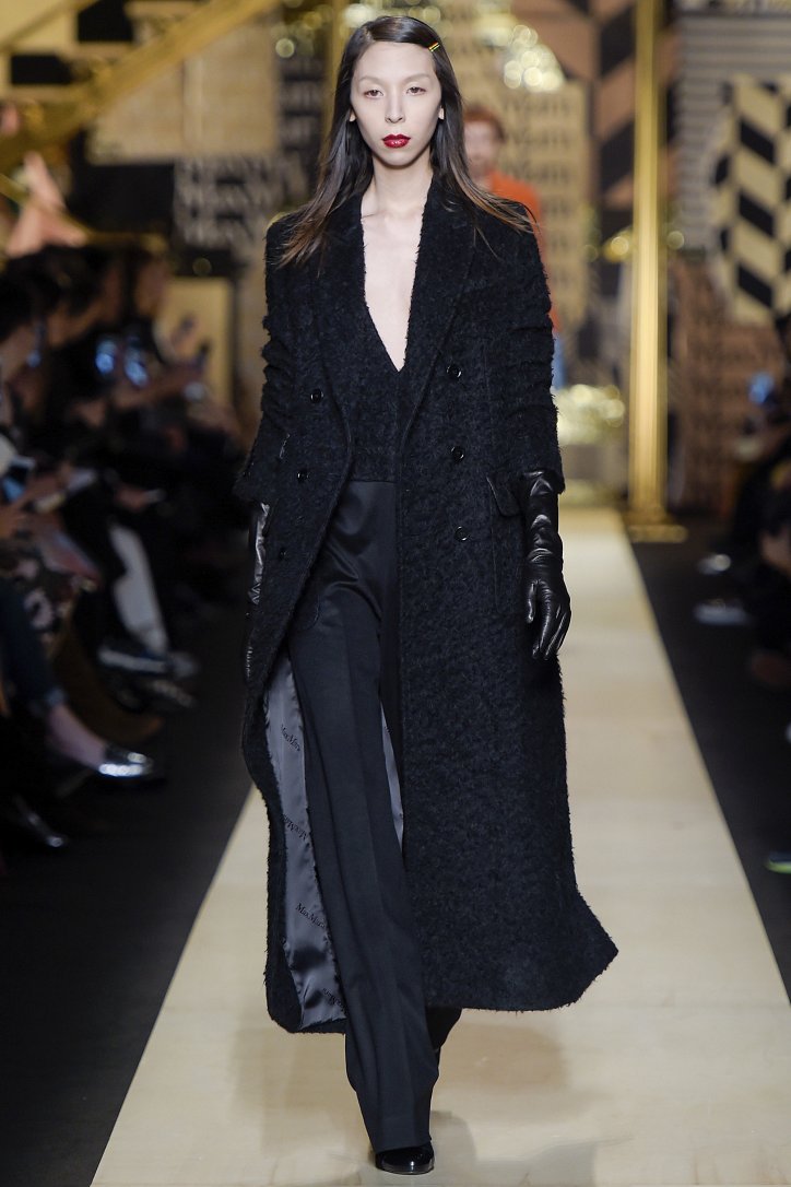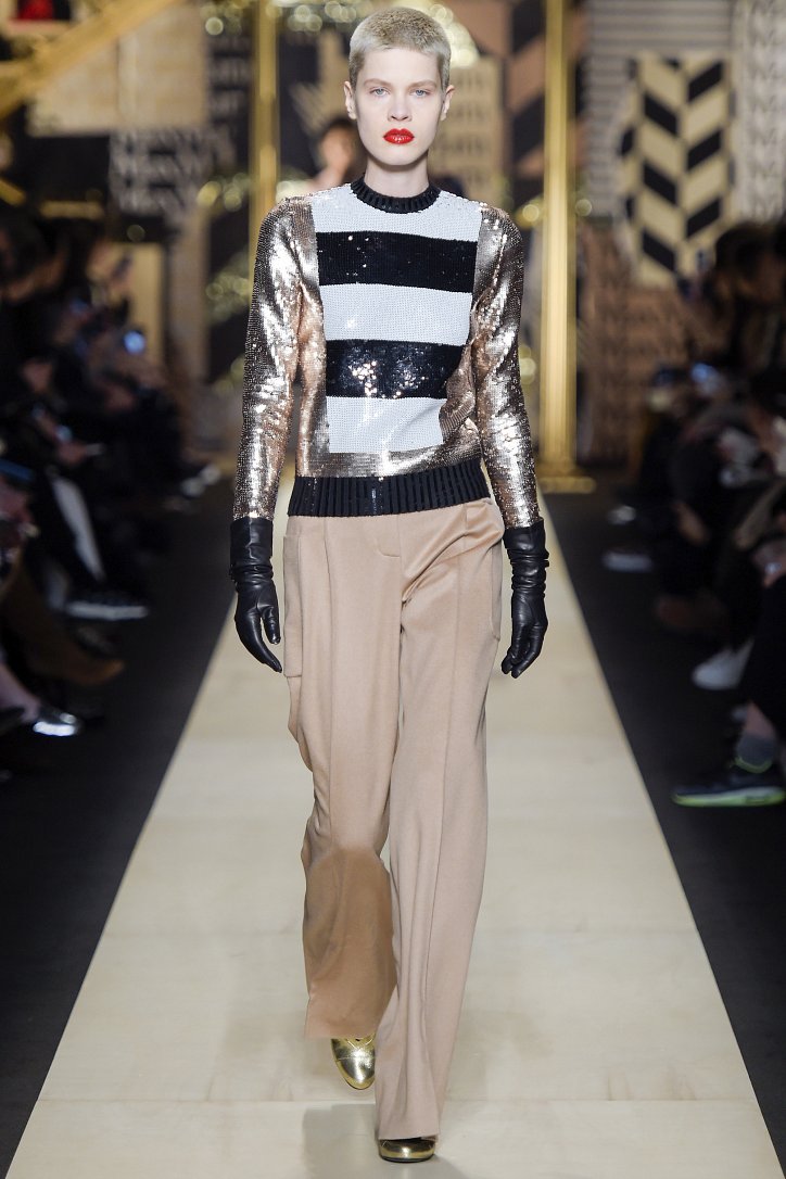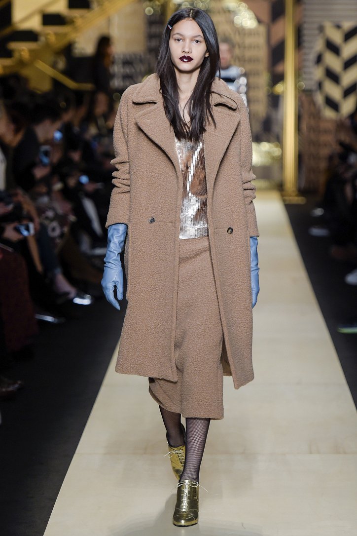 Ничто не предвещало неожиданностей: «фирменные» пальто цвета camel открыли показ новой коллекции Max Mara осень-зима 2016-2017. Но затем гости дефиле с удивлением стали замечать, что модели в бежевых пальто как-то странно поблескивают… Вначале мерцание исходило от обуви, а затем и мини-комбинезон под классическим пальто вспыхнул золотом! Дальше начался настоящий хоровод из расшитых пайетками пуловеров и «позолоченных» длинных пальто, ярких «мазков» оранжевого и голубого в верхней одежде, трикотаже и обуви, смелых сочетаний синего и зеленого в образах, комбинировании фактур и всевозможных полосок!