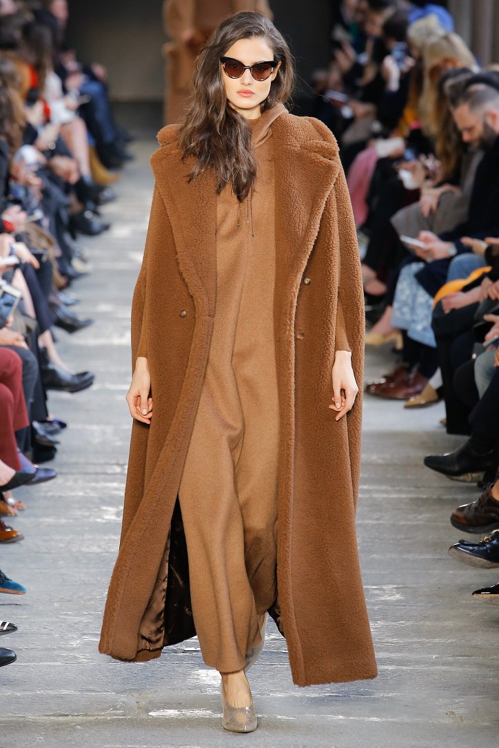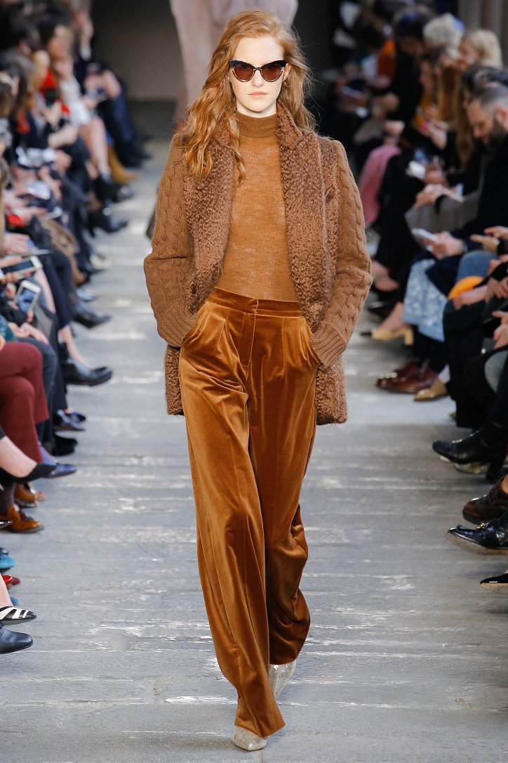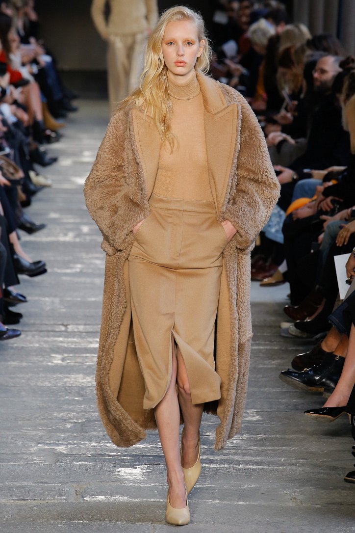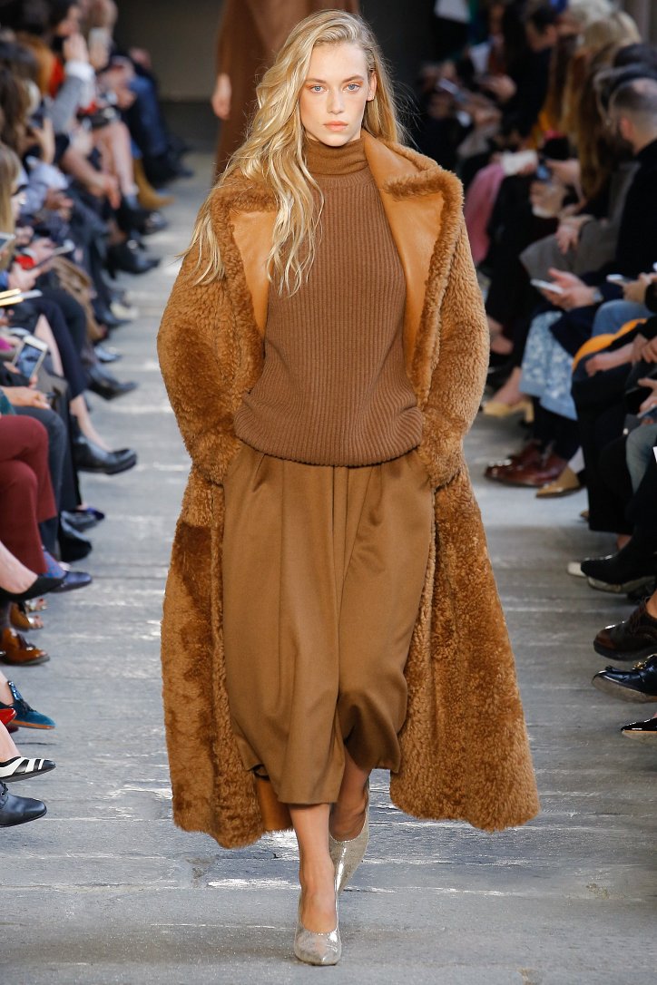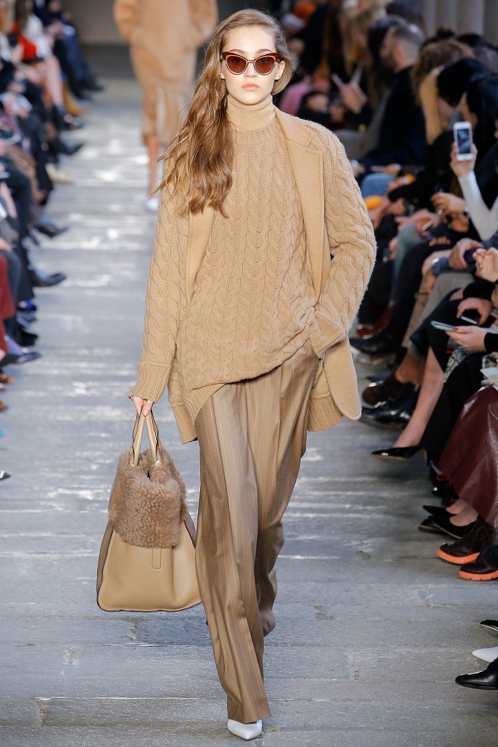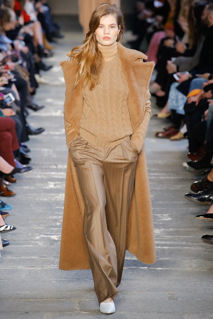 Что может быть лучше и уютнее бежево-коричневой палитры? Только несколько оттенков коричневого, собранных в одном образе! Любовь Max Mara к этой цветовой гамме всем давно известна, а новая коллекция Max Mara осень-зима 2017-2018 стала тому еще одним подтверждением. Модели демонстрировали «фирменные» длинные пальто свободного (и очень свободного) силуэта, мягкие пуловеры с косами, широкие брюки, полупрозрачные водолазки, костюмы и юбки-карандаш – все это выглядело невероятно уютно, тепло и «вкусно» - благодаря сочетанию оттенков карамели, коньяка, молочного шоколада, ванили и других теплых оттенков коричневого, которые дизайнеры немного «разбавили» красными, черными и серыми луками.