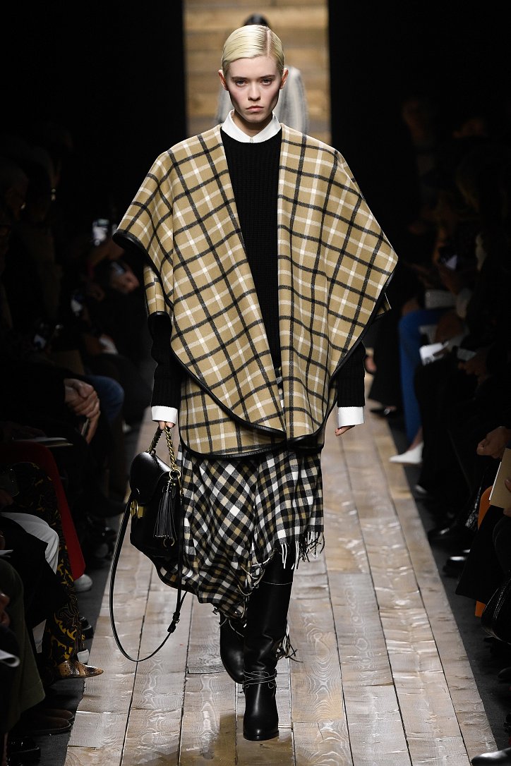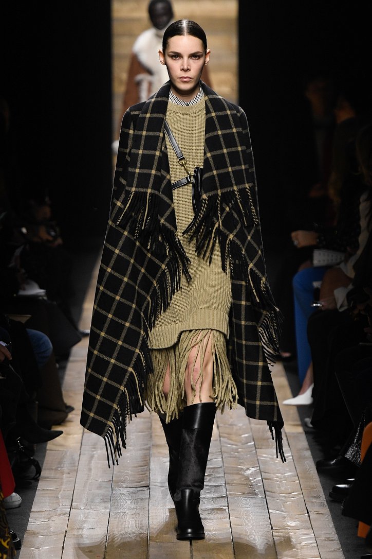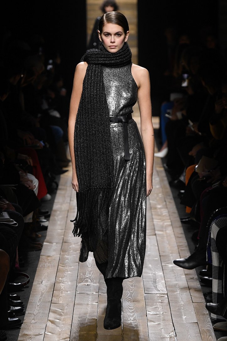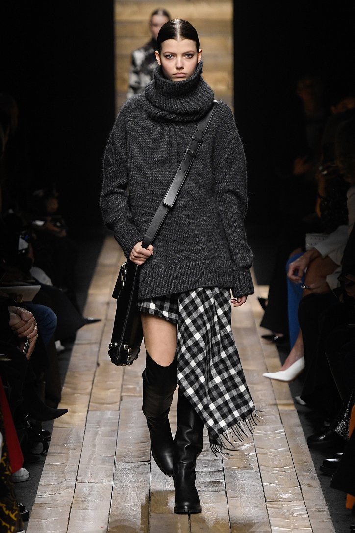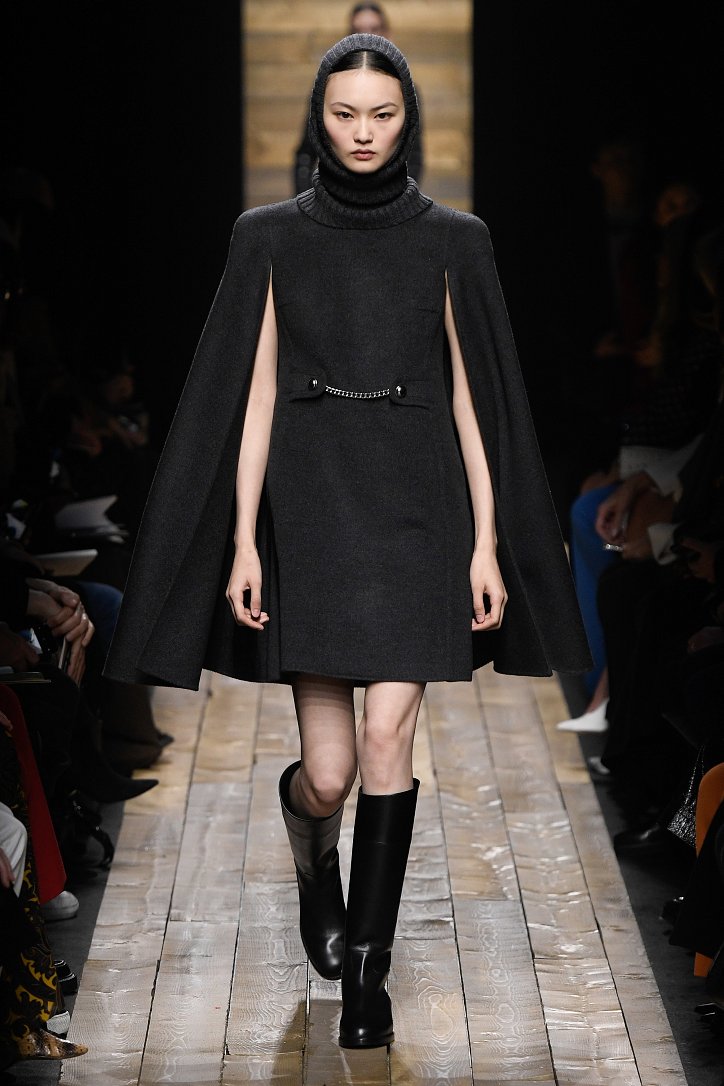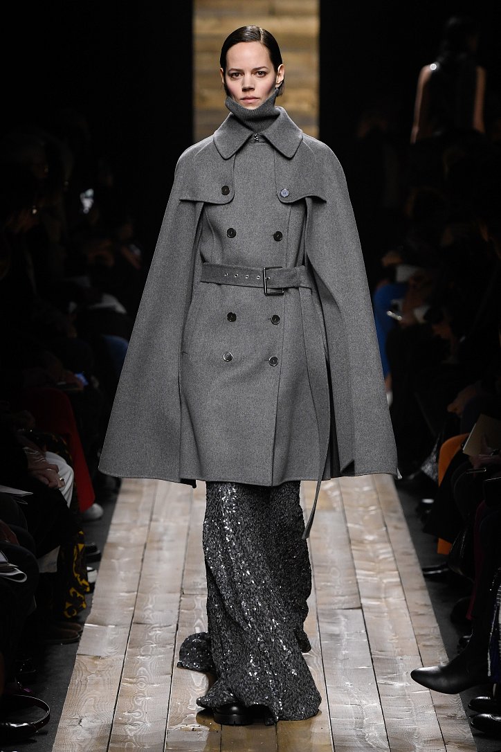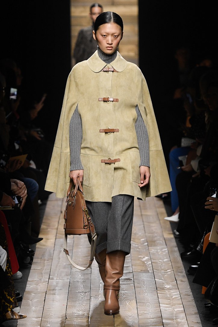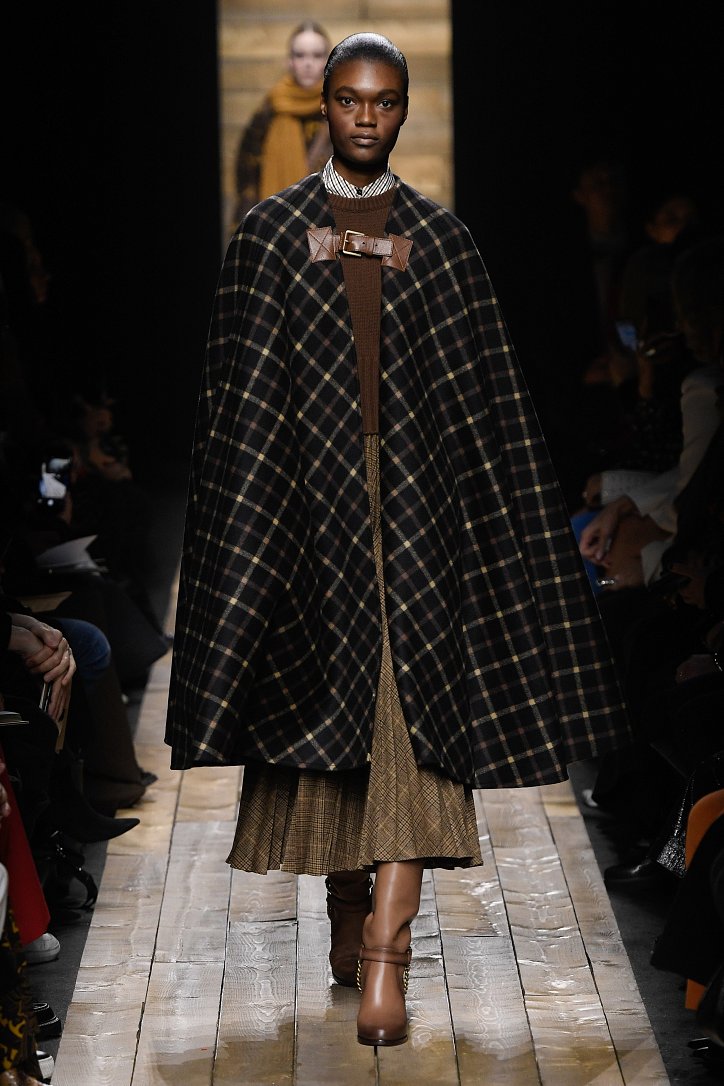 Кейпы и накидки, юбки миди и вязаные свитеры оверсайз, плиссированные вечерние платья и повседневные юбки, уютные дубленки и шубы из экомеха, свободного кроя брючные костюмы и подчеркнуто женственные – с юбками, кожа с «коровьим» принтом и шифон с неброским «пейсли», много-много разной клетки и спокойная цветовая палитра, лишь изредка вспыхивающая моделями в красном и оранжевом цвете, широкие и длинные шарфы и высокие сапоги – новая осенне-зимняя коллекция Michael Kors Collection стала неким возвратом в прошлое, к истокам.