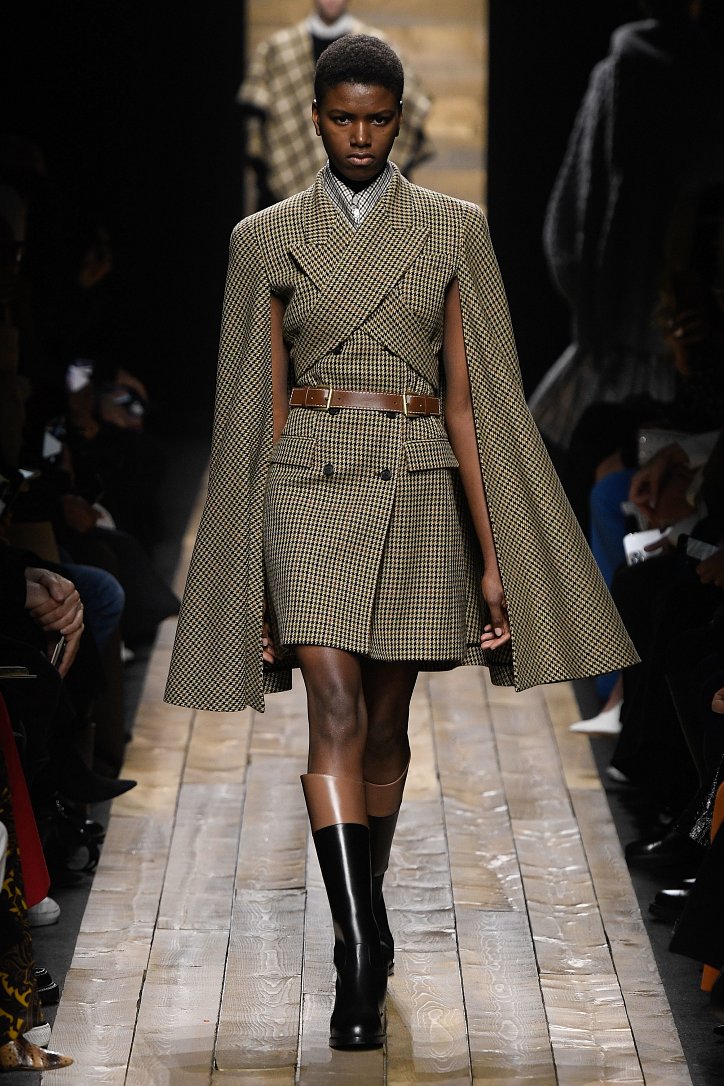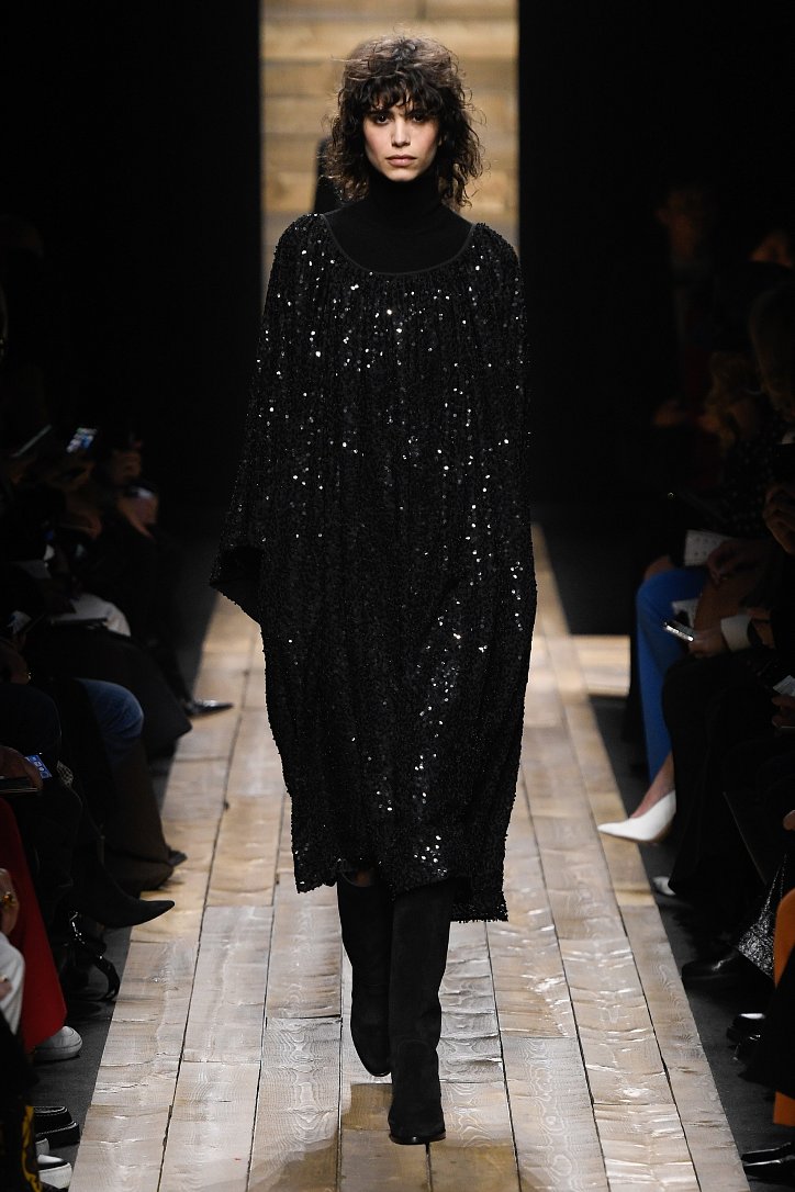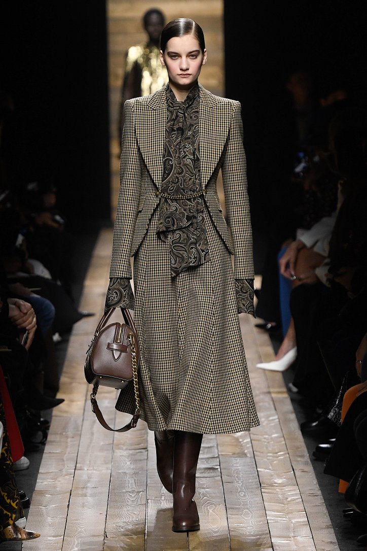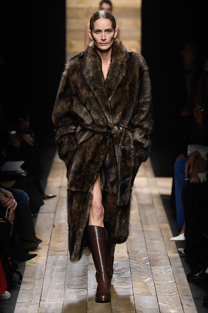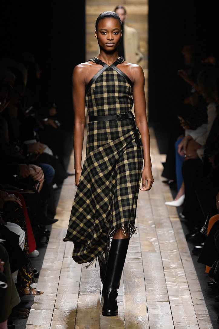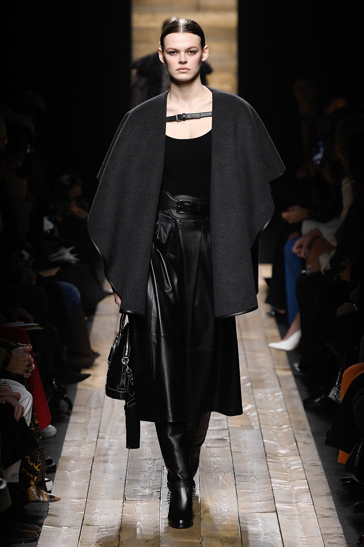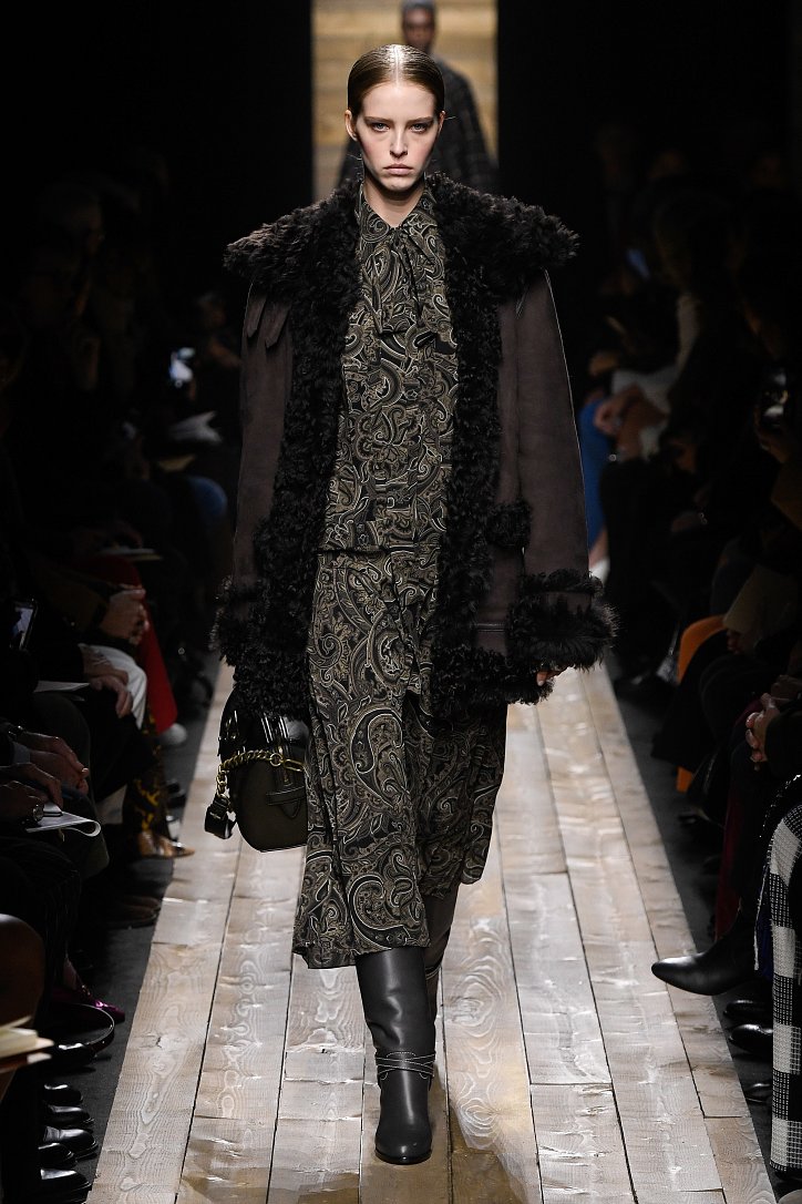 Кейпы и накидки, юбки миди и вязаные свитеры оверсайз, плиссированные вечерние платья и повседневные юбки, уютные дубленки и шубы из экомеха, свободного кроя брючные костюмы и подчеркнуто женственные – с юбками, кожа с «коровьим» принтом и шифон с неброским «пейсли», много-много разной клетки и спокойная цветовая палитра, лишь изредка вспыхивающая моделями в красном и оранжевом цвете, широкие и длинные шарфы и высокие сапоги – новая осенне-зимняя коллекция Michael Kors Collection стала неким возвратом в прошлое, к истокам.