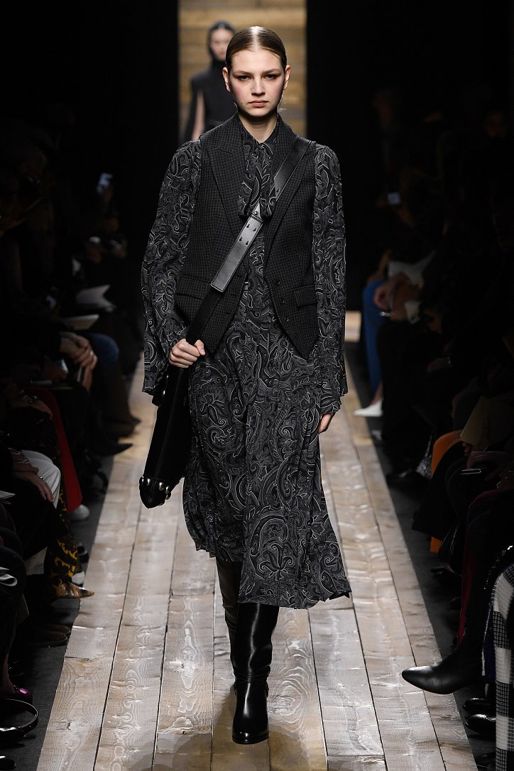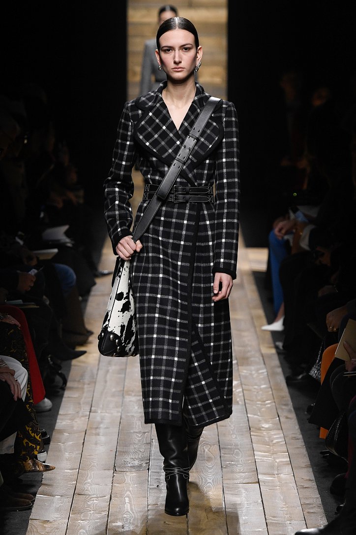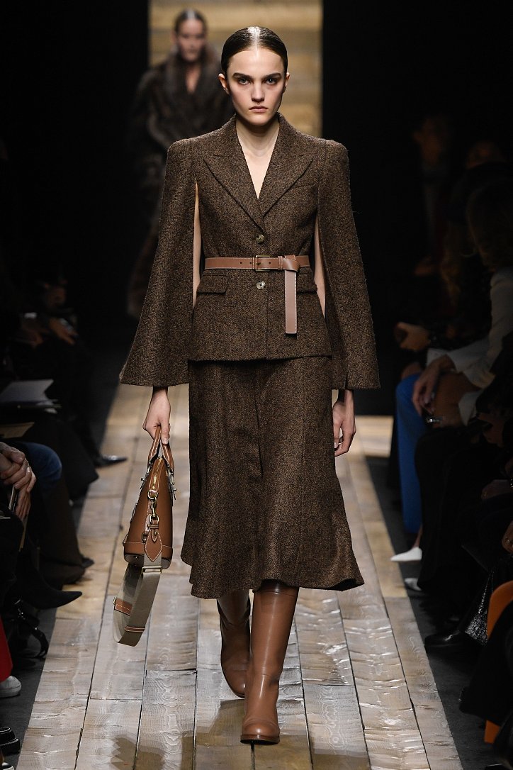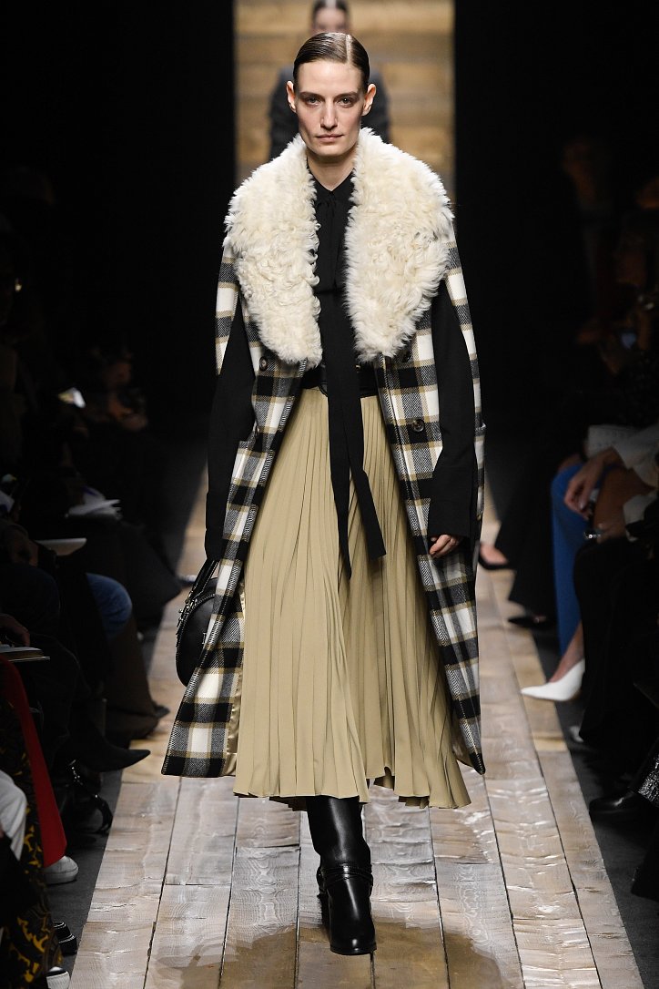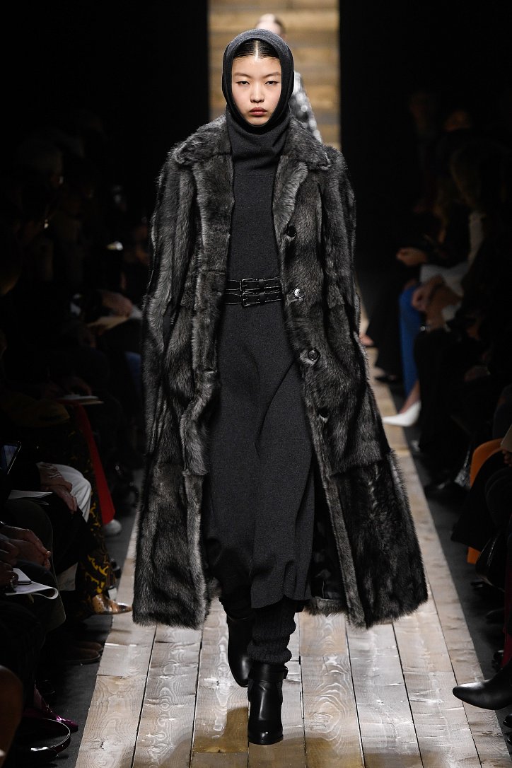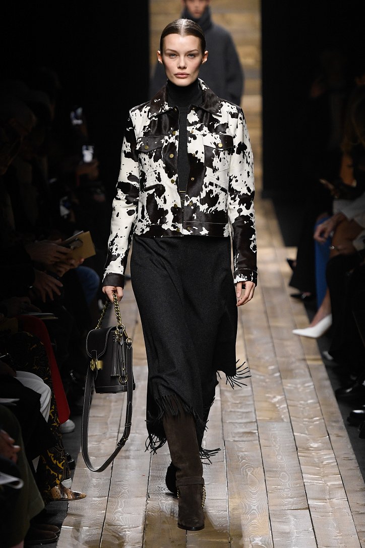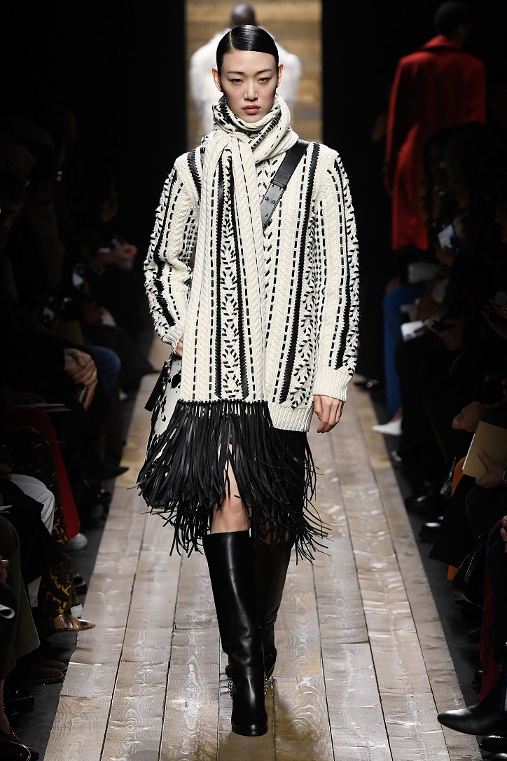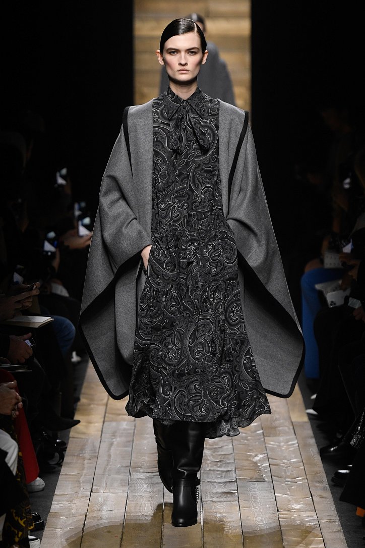 Кейпы и накидки, юбки миди и вязаные свитеры оверсайз, плиссированные вечерние платья и повседневные юбки, уютные дубленки и шубы из экомеха, свободного кроя брючные костюмы и подчеркнуто женственные – с юбками, кожа с «коровьим» принтом и шифон с неброским «пейсли», много-много разной клетки и спокойная цветовая палитра, лишь изредка вспыхивающая моделями в красном и оранжевом цвете, широкие и длинные шарфы и высокие сапоги – новая осенне-зимняя коллекция Michael Kors Collection стала неким возвратом в прошлое, к истокам.