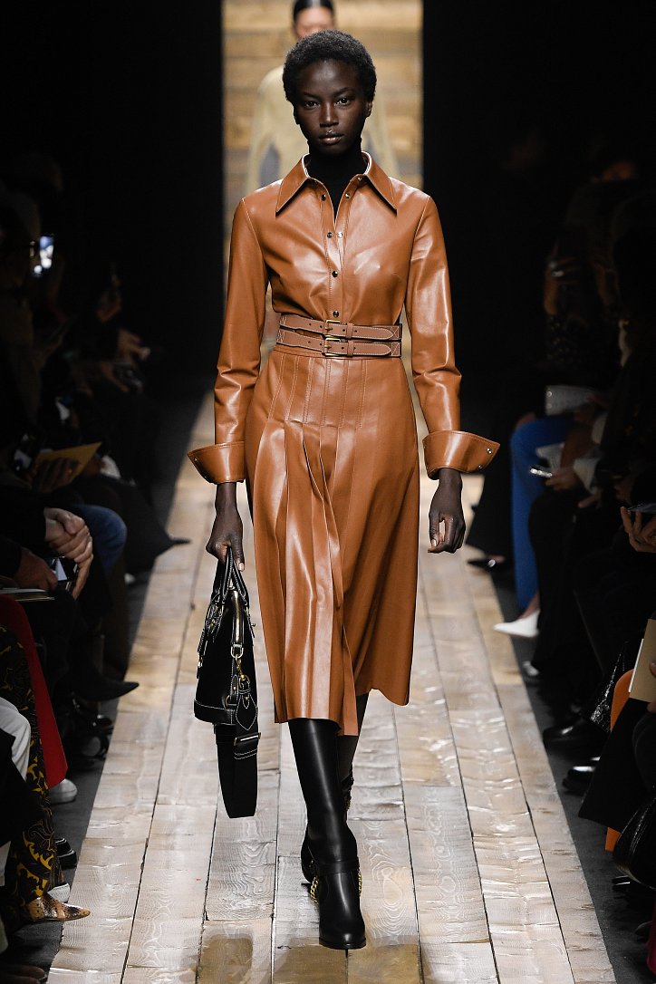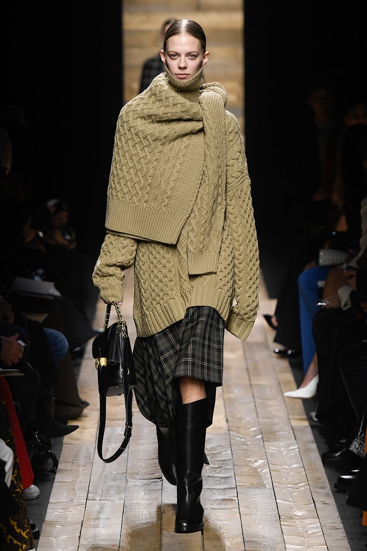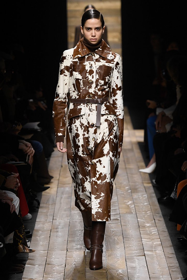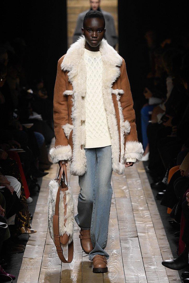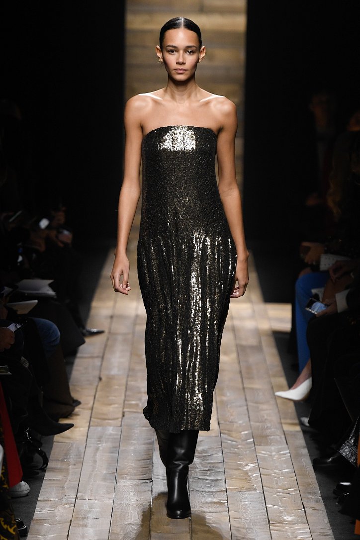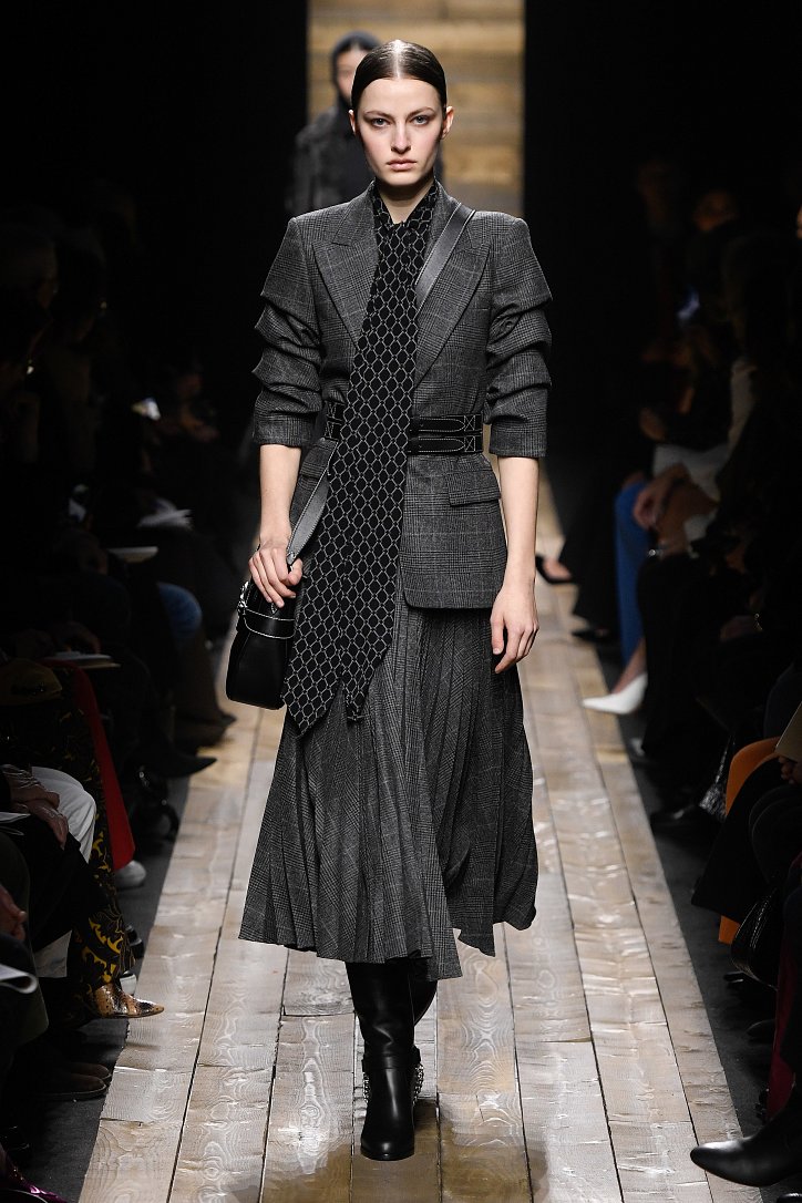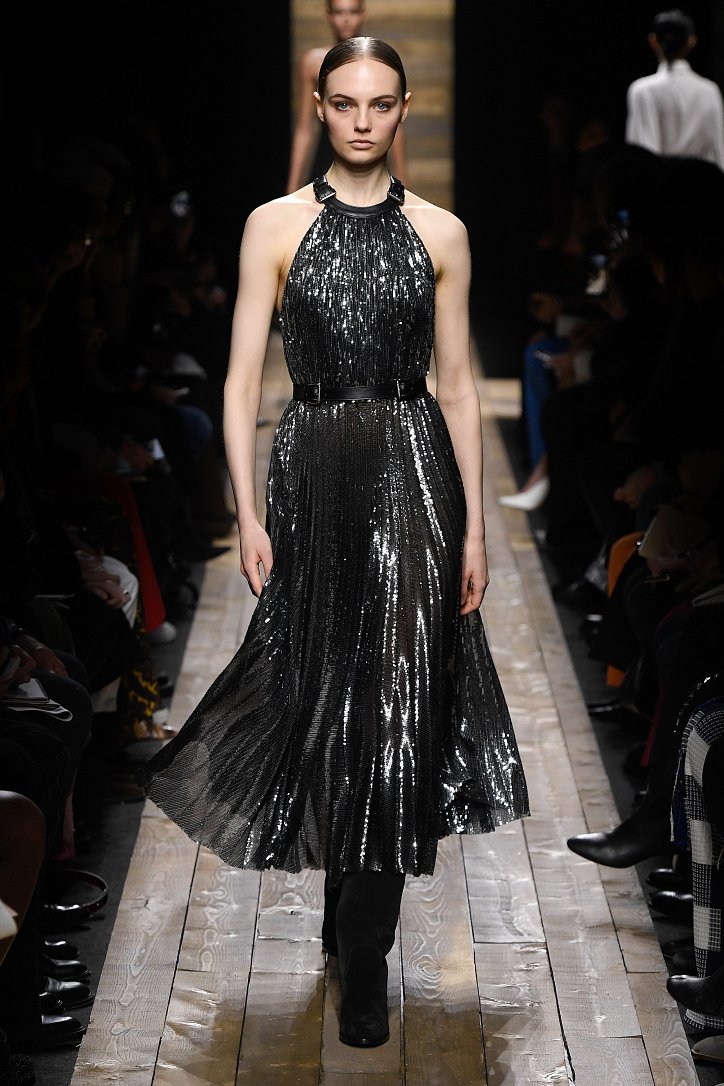 Кейпы и накидки, юбки миди и вязаные свитеры оверсайз, плиссированные вечерние платья и повседневные юбки, уютные дубленки и шубы из экомеха, свободного кроя брючные костюмы и подчеркнуто женственные – с юбками, кожа с «коровьим» принтом и шифон с неброским «пейсли», много-много разной клетки и спокойная цветовая палитра, лишь изредка вспыхивающая моделями в красном и оранжевом цвете, широкие и длинные шарфы и высокие сапоги – новая осенне-зимняя коллекция Michael Kors Collection стала неким возвратом в прошлое, к истокам.
