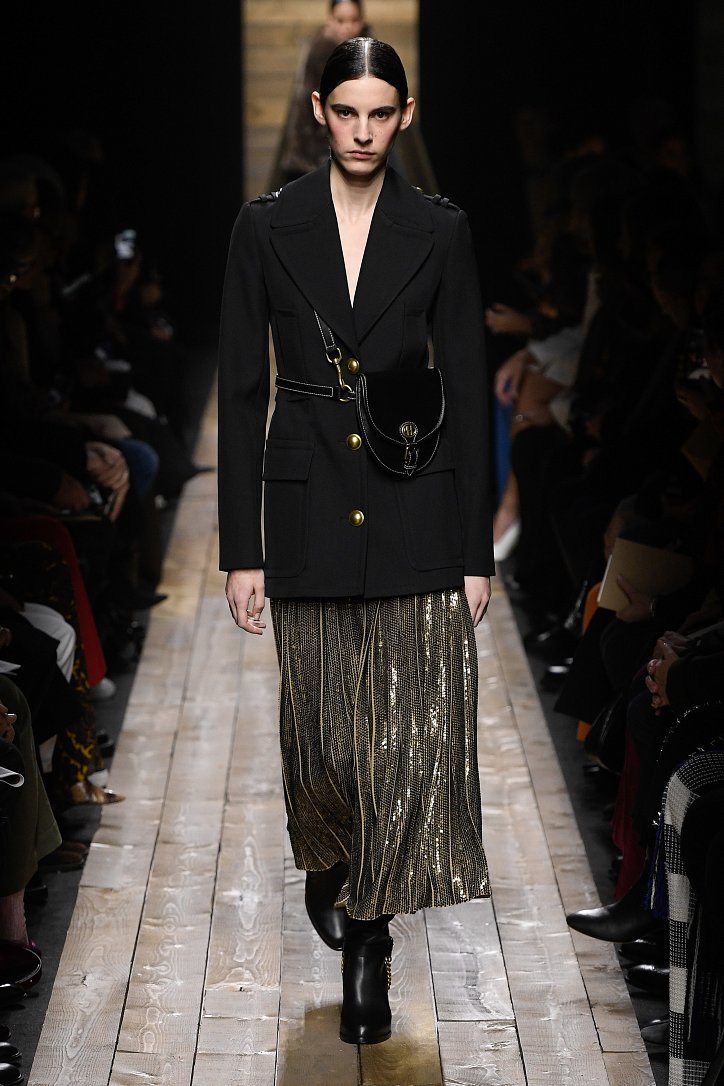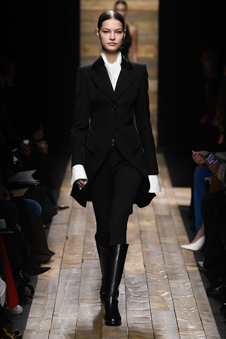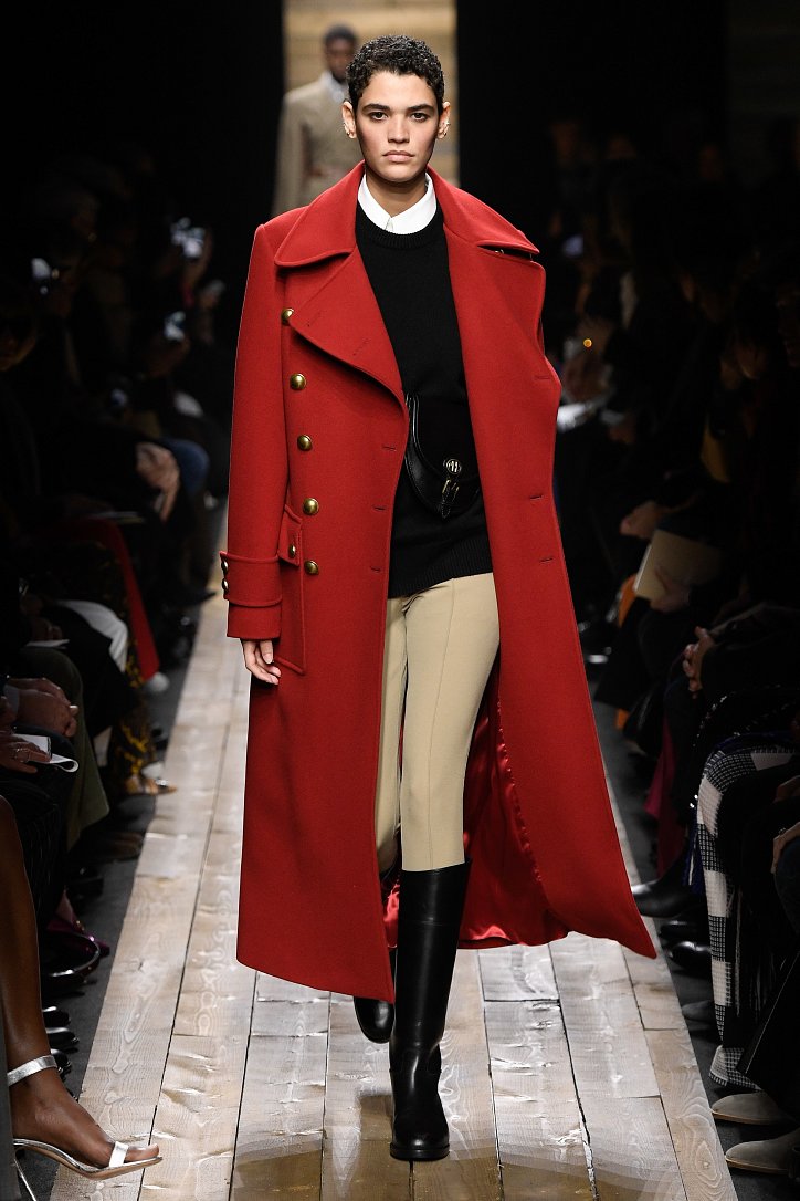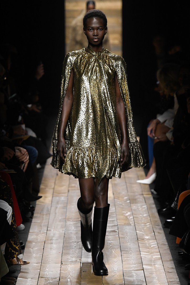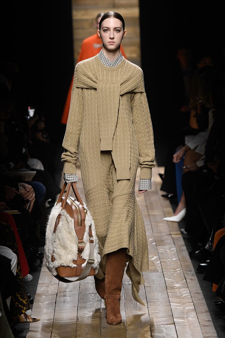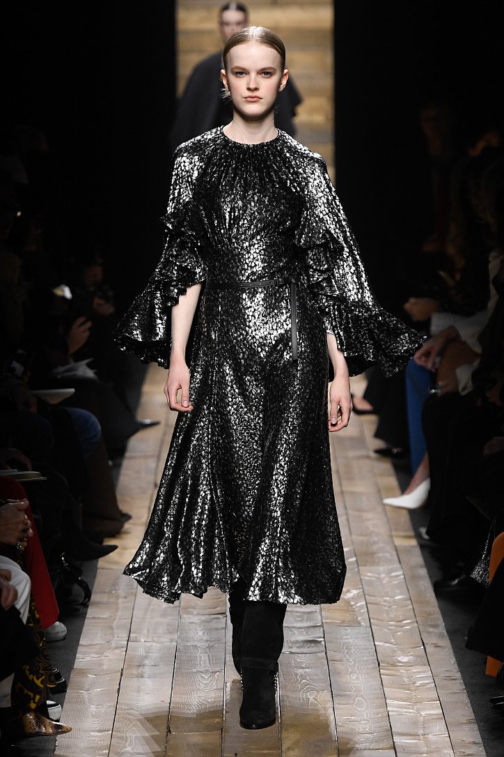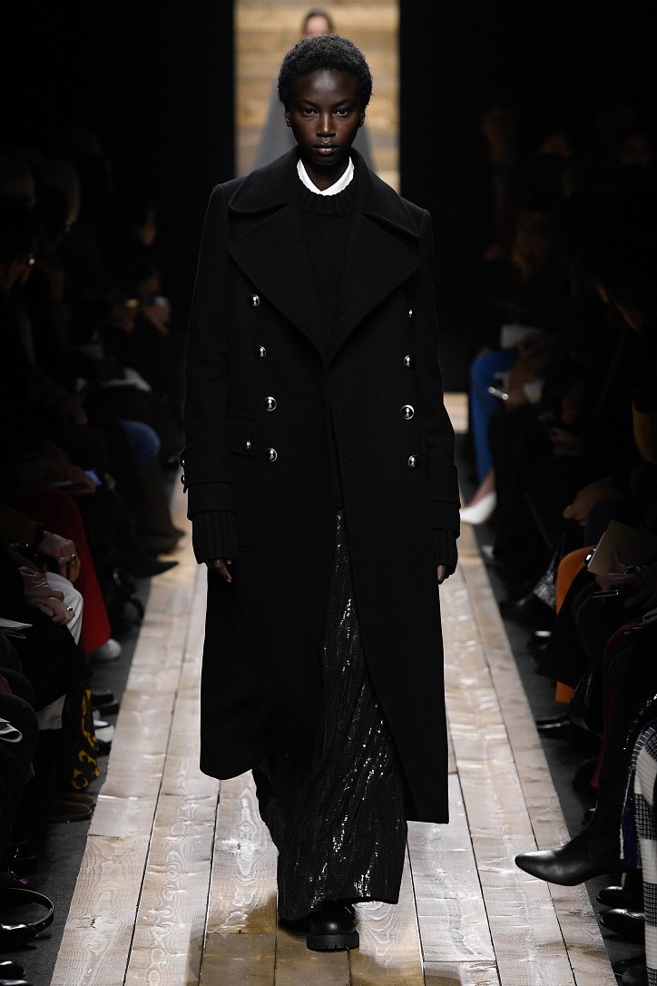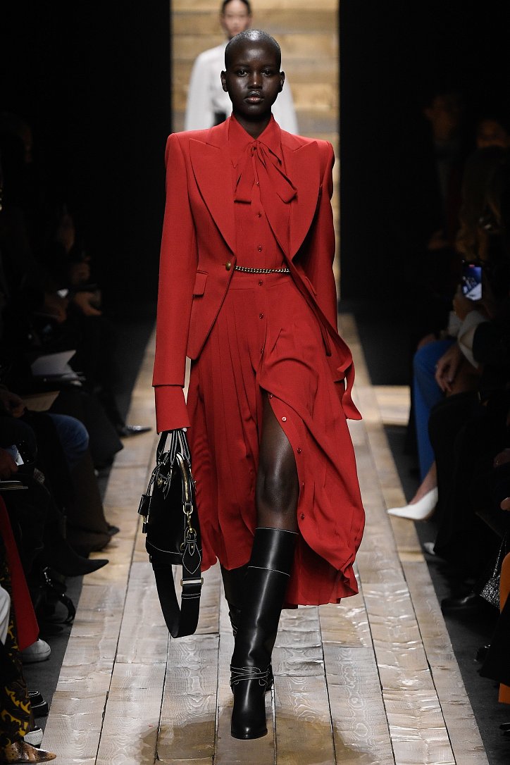 Кейпы и накидки, юбки миди и вязаные свитеры оверсайз, плиссированные вечерние платья и повседневные юбки, уютные дубленки и шубы из экомеха, свободного кроя брючные костюмы и подчеркнуто женственные – с юбками, кожа с «коровьим» принтом и шифон с неброским «пейсли», много-много разной клетки и спокойная цветовая палитра, лишь изредка вспыхивающая моделями в красном и оранжевом цвете, широкие и длинные шарфы и высокие сапоги – новая осенне-зимняя коллекция Michael Kors Collection стала неким возвратом в прошлое, к истокам.