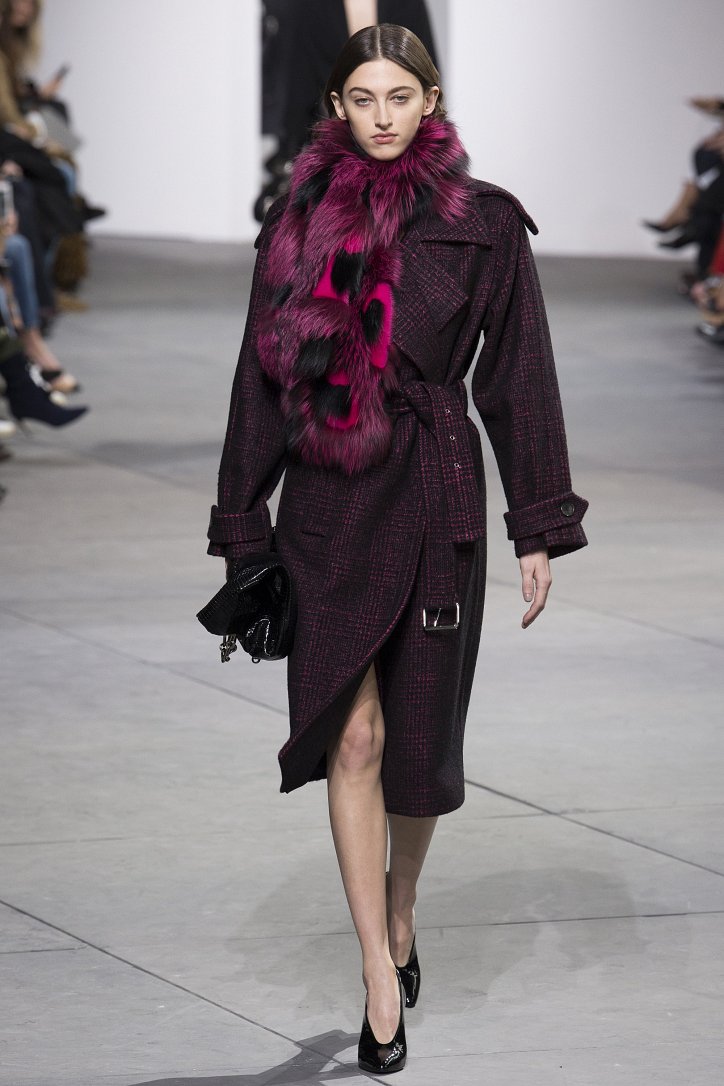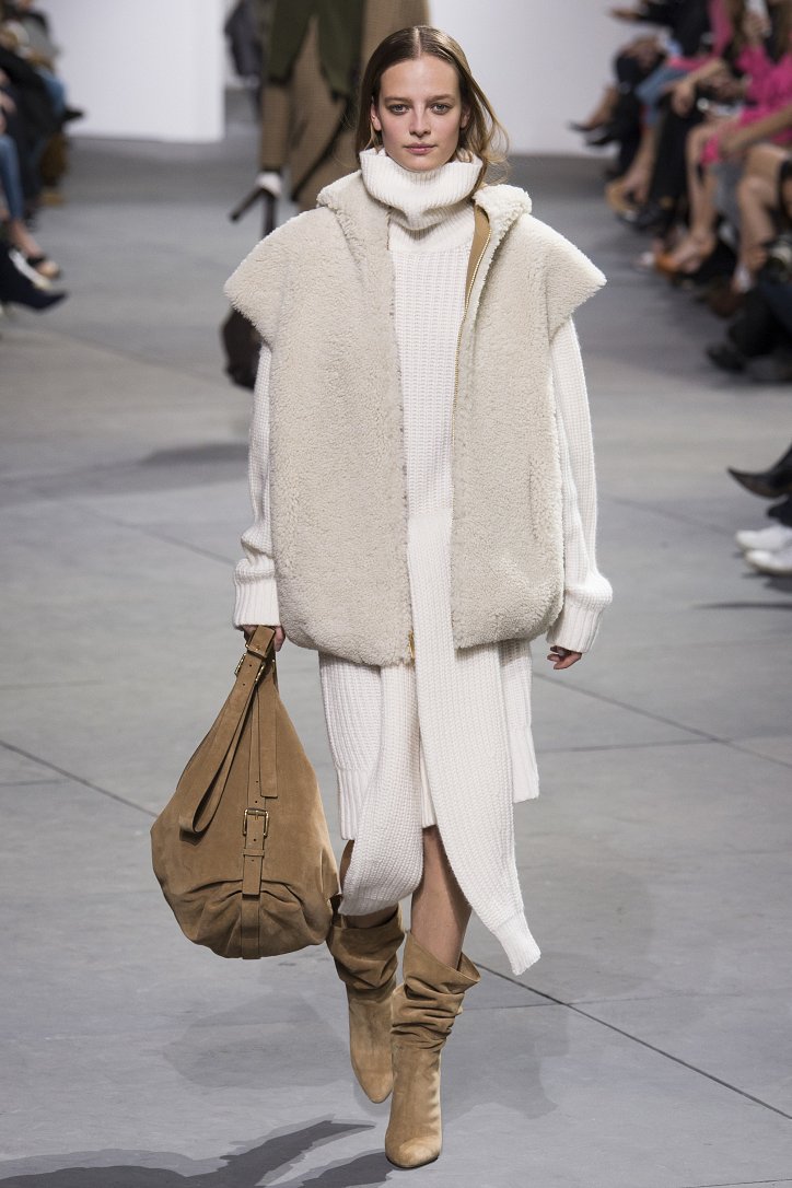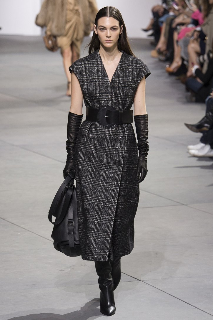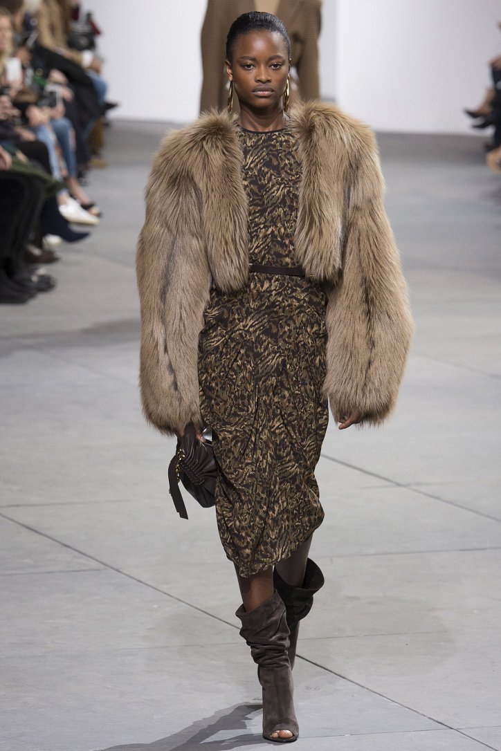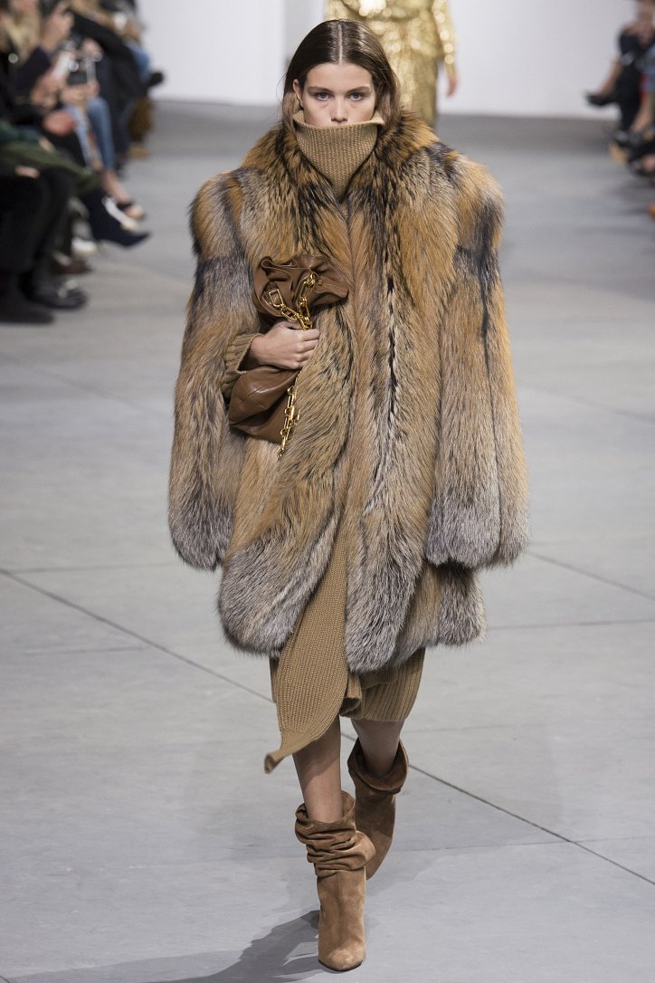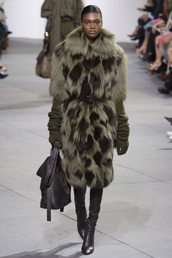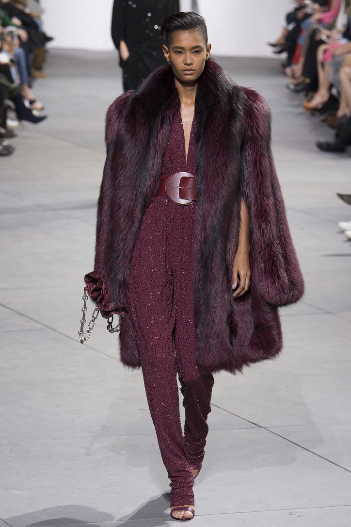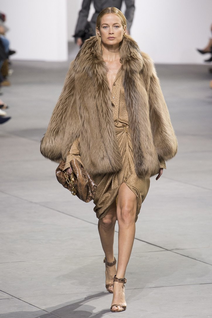 Излюбленный стиль Майкла Корса – настоящая «американская» классика – простая и элегантная. Такой получилась и новая коллекция для сезона осень-зима 2017-2018, которую дизайнер создал для современных женщин – уверенно делающий карьеру и при этом не теряющих своего шарма и женственности. Оглянувшись в прошлое, Майкл Корс взял за основу моду 70-ых, и создал идеальный повседневный гардероб для осени и зимы. В нем были идеально скроенные шерстяные костюмы и пальто, трикотажные платья и приталенные рубашки, кожаные плащи и роскошные шубы, широкие брюки и юбки-миди. Элегантность и стиль одежды и аксессуаров подчеркивала и цветовая палитра, в которой преобладали бежевый, винный и серые оттенки.