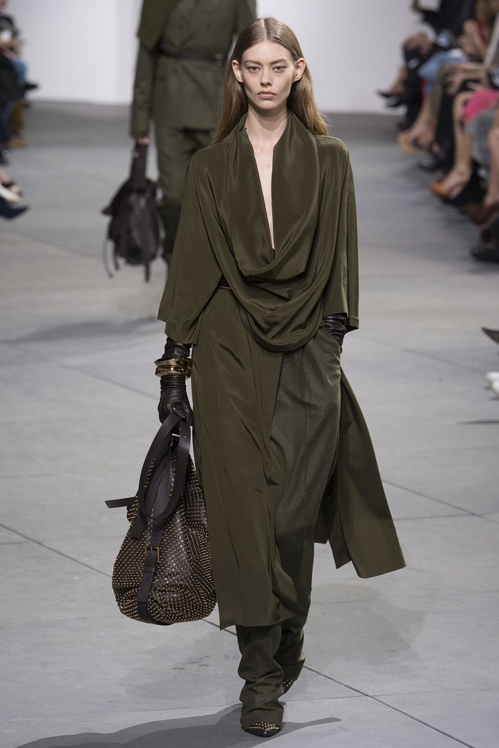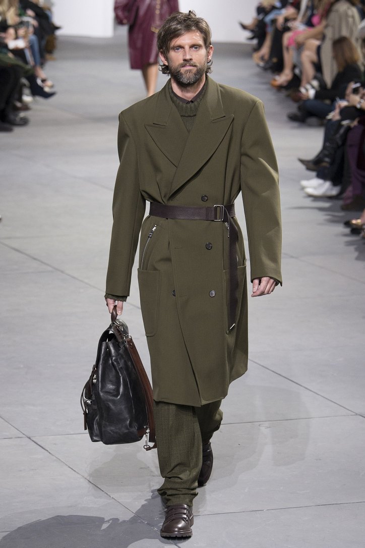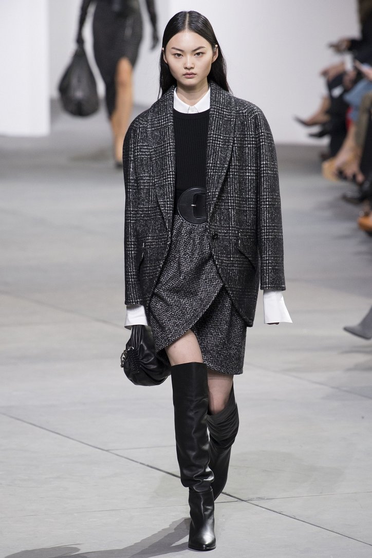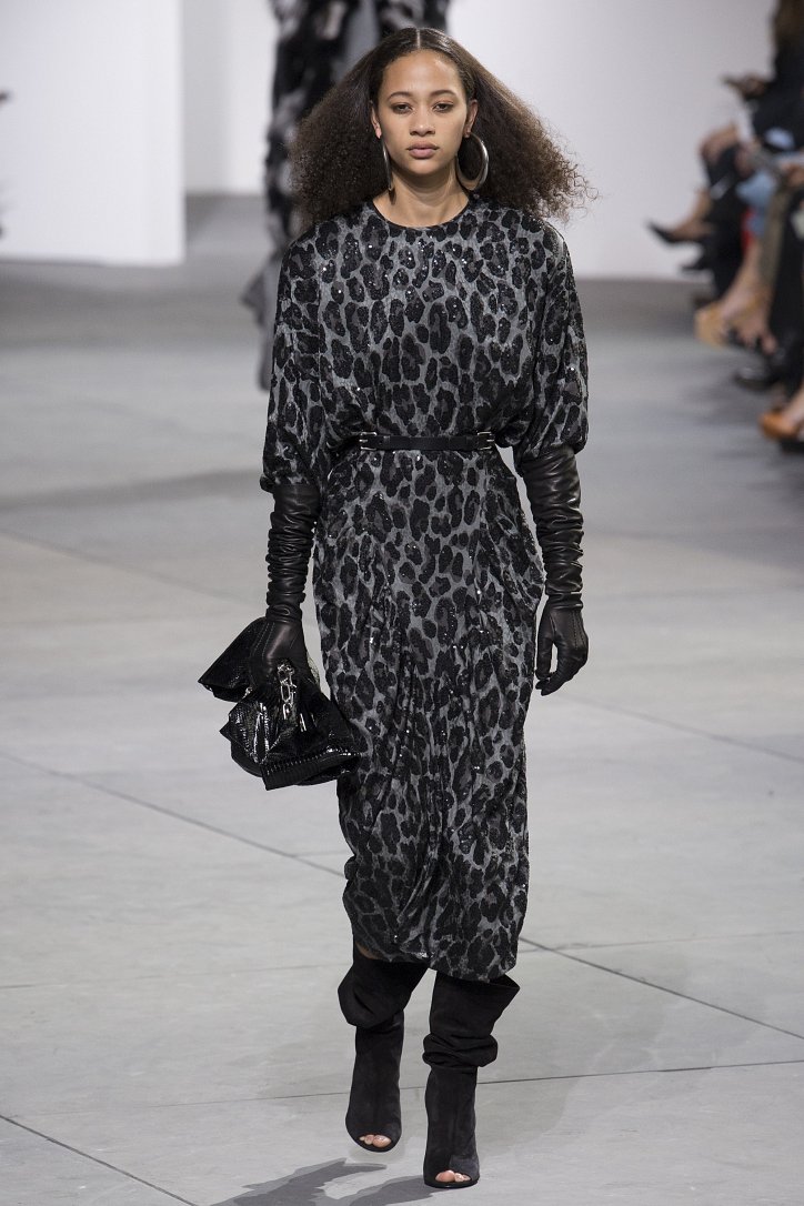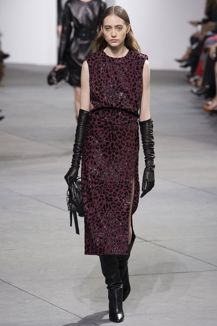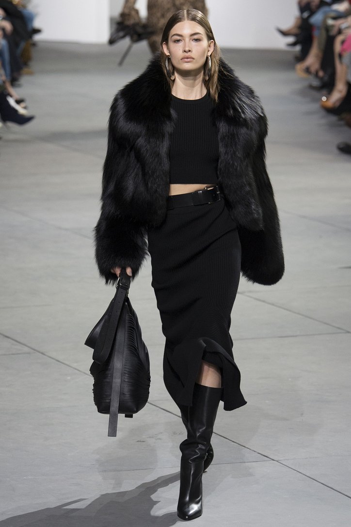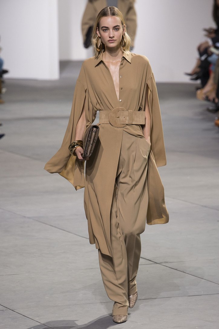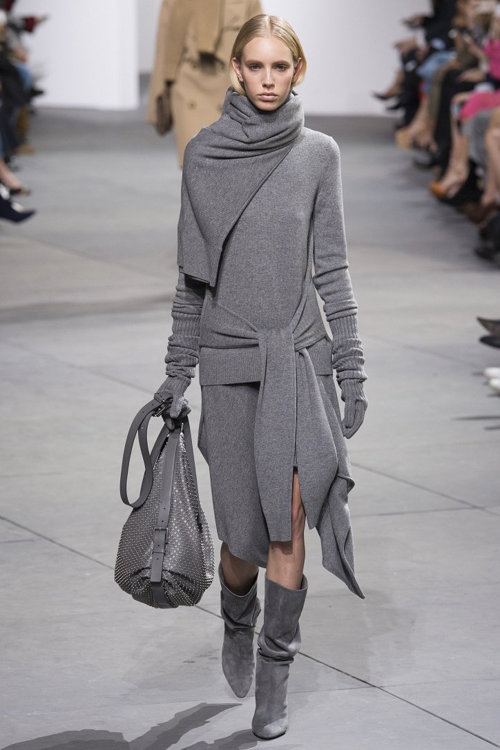 Излюбленный стиль Майкла Корса – настоящая «американская» классика – простая и элегантная. Такой получилась и новая коллекция для сезона осень-зима 2017-2018, которую дизайнер создал для современных женщин – уверенно делающий карьеру и при этом не теряющих своего шарма и женственности. Оглянувшись в прошлое, Майкл Корс взял за основу моду 70-ых, и создал идеальный повседневный гардероб для осени и зимы. В нем были идеально скроенные шерстяные костюмы и пальто, трикотажные платья и приталенные рубашки, кожаные плащи и роскошные шубы, широкие брюки и юбки-миди. Элегантность и стиль одежды и аксессуаров подчеркивала и цветовая палитра, в которой преобладали бежевый, винный и серые оттенки.