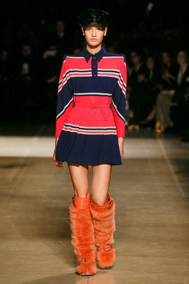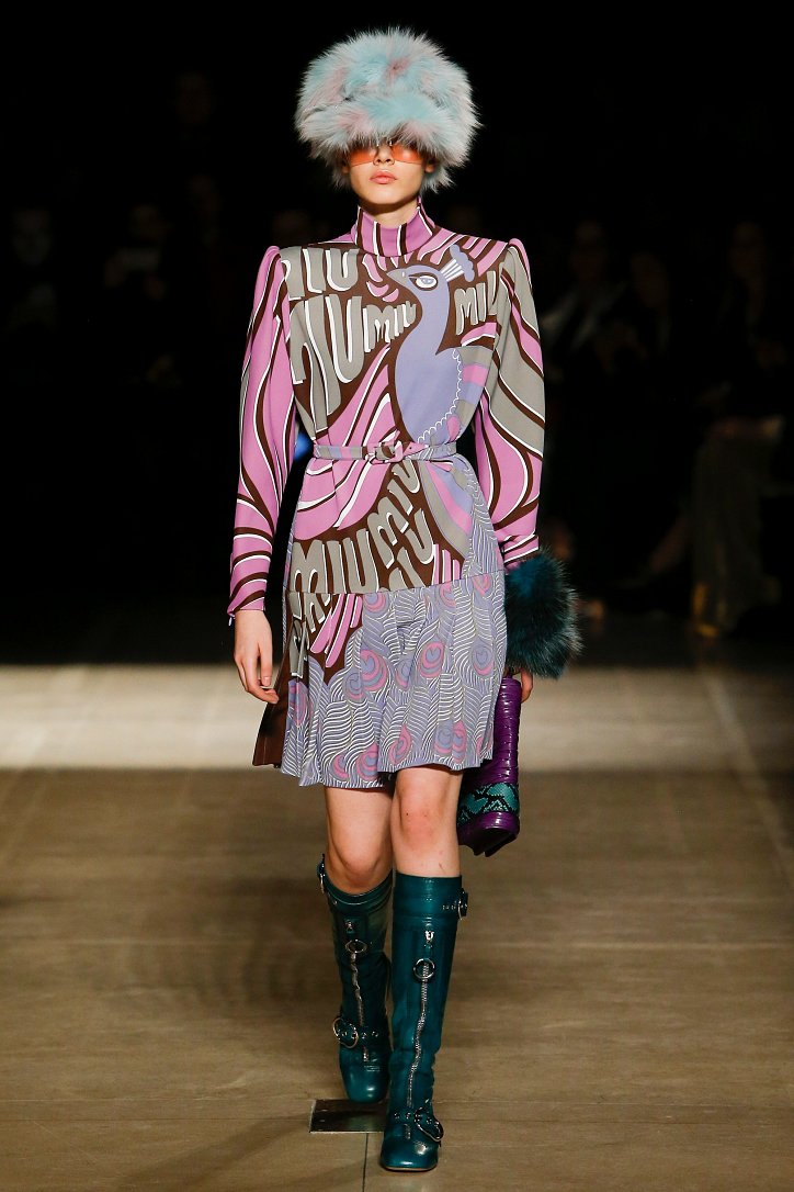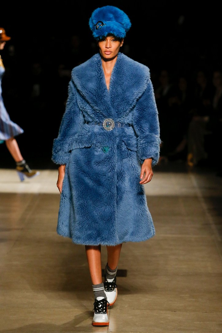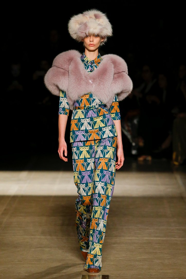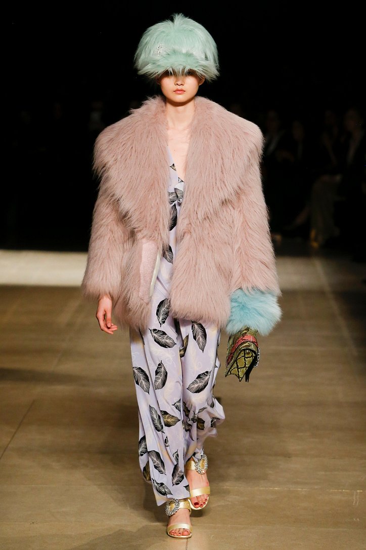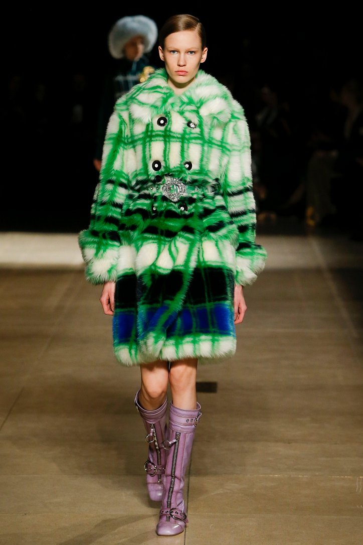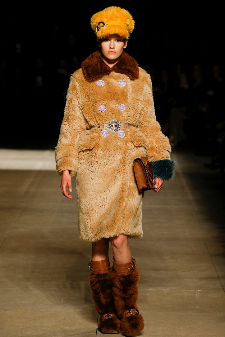Стоило только оглядеться в Palais d'Iena – как становилось понятно, чему будет посвящена коллекция Miu Miu осень-зима 2017-2018: буквально все – от стульев до парадной лестницы – было затянуто искусственным бледно-фиолетовым мехом! Показавшиеся на подиуме модели сразу же подтвердили догадки публики, демонстрируя настоящую меховую феерию, которая поражала буйством цветов и принтов. Тут были сумасшедше яркие шубы и женские куртки из меха, пальто и прозрачные плащи с огромными воротниками-пелеринами, меховые полосатые унты и длинные, до локтя, варежки, сумки и кепки, шапки и шляпы – все, конечно же, из меха. Прекрасно вписались в этот разгул гламура и декор в виде пайеток, и блестящие пряжки, и украшения.