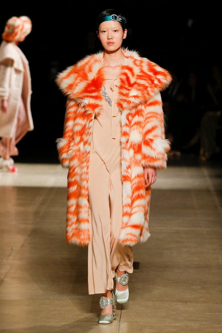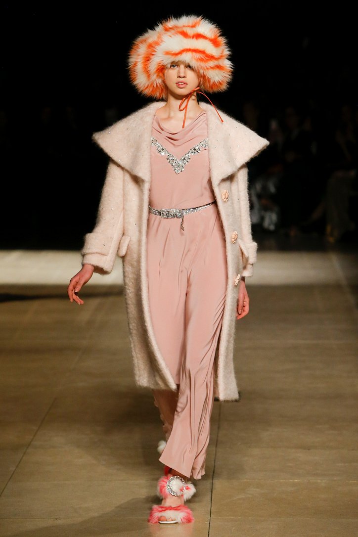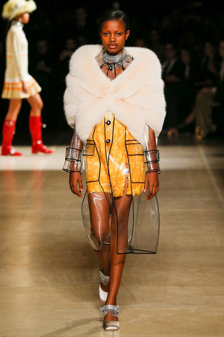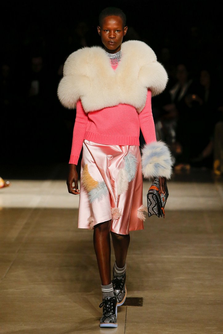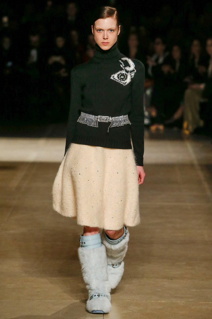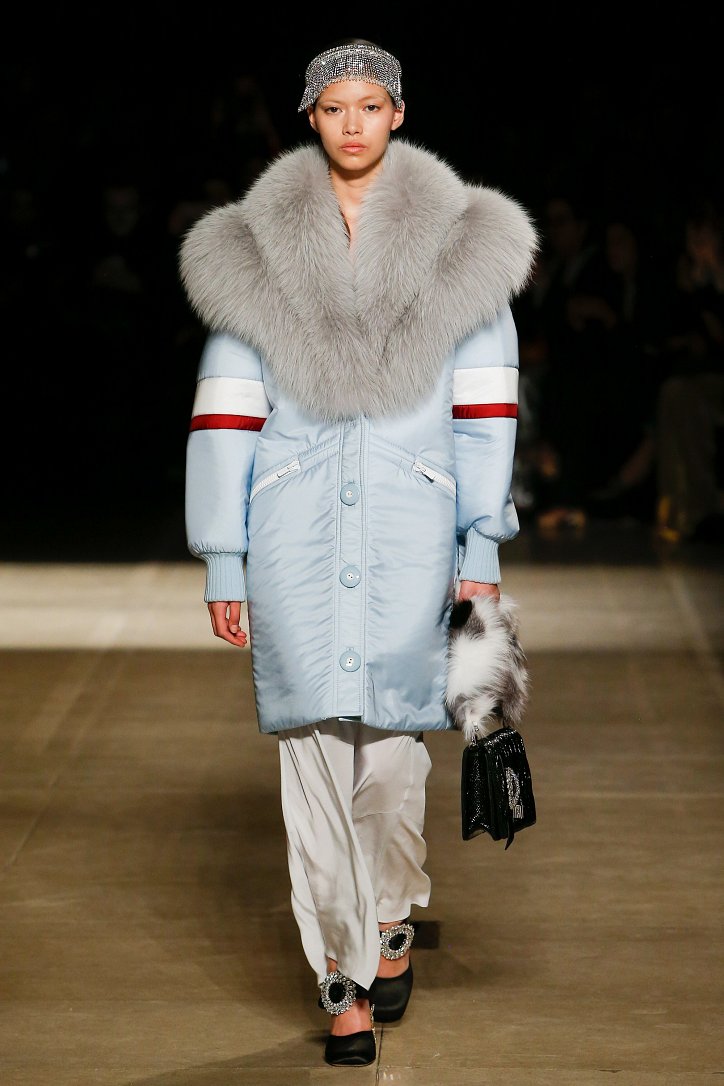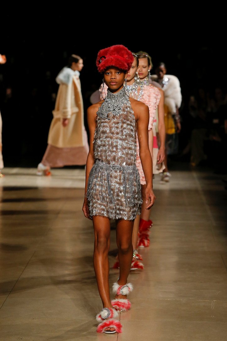 Стоило только оглядеться в Palais d'Iena – как становилось понятно, чему будет посвящена коллекция Miu Miu осень-зима 2017-2018: буквально все – от стульев до парадной лестницы – было затянуто искусственным бледно-фиолетовым мехом! Показавшиеся на подиуме модели сразу же подтвердили догадки публики, демонстрируя настоящую меховую феерию, которая поражала буйством цветов и принтов. Тут были сумасшедше яркие шубы и женские куртки из меха, пальто и прозрачные плащи с огромными воротниками-пелеринами, меховые полосатые унты и длинные, до локтя, варежки, сумки и кепки, шапки и шляпы – все, конечно же, из меха. Прекрасно вписались в этот разгул гламура и декор в виде пайеток, и блестящие пряжки, и украшения.