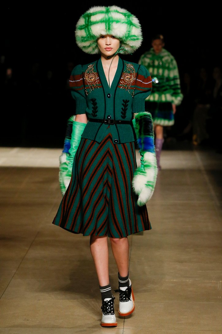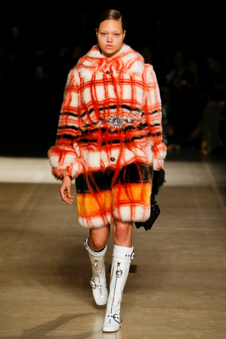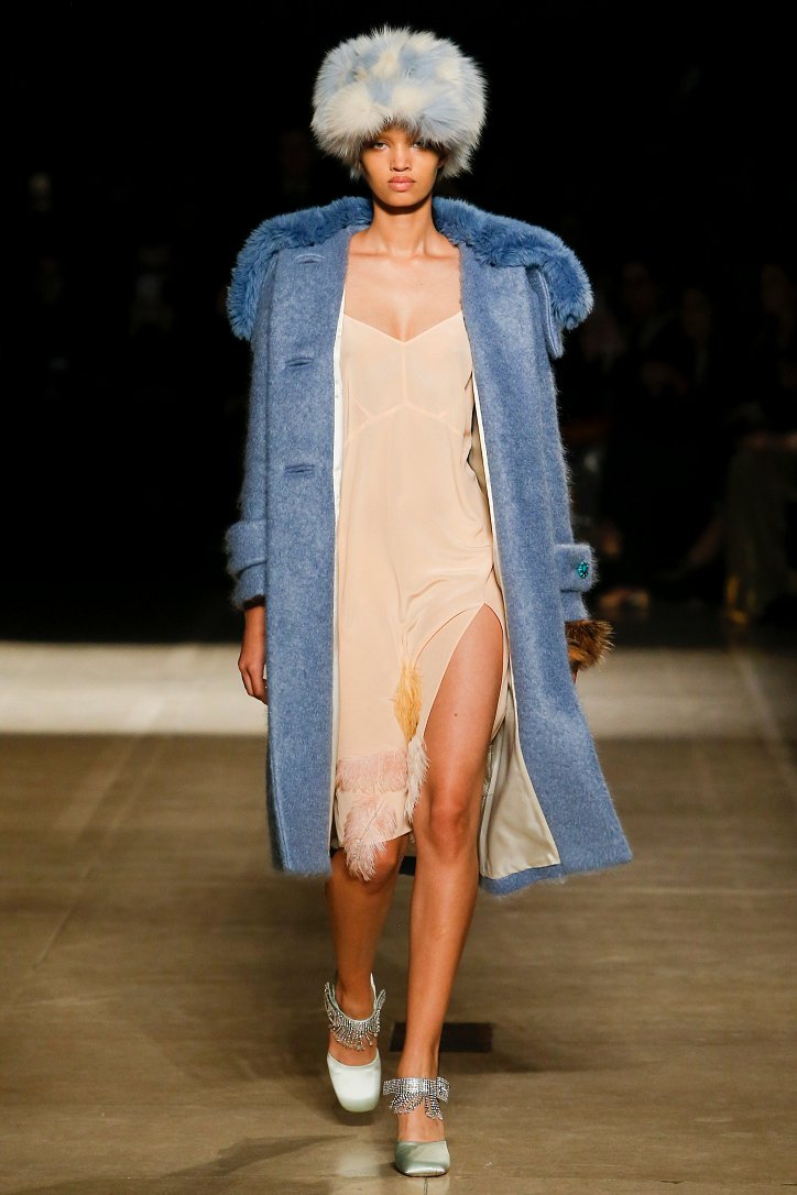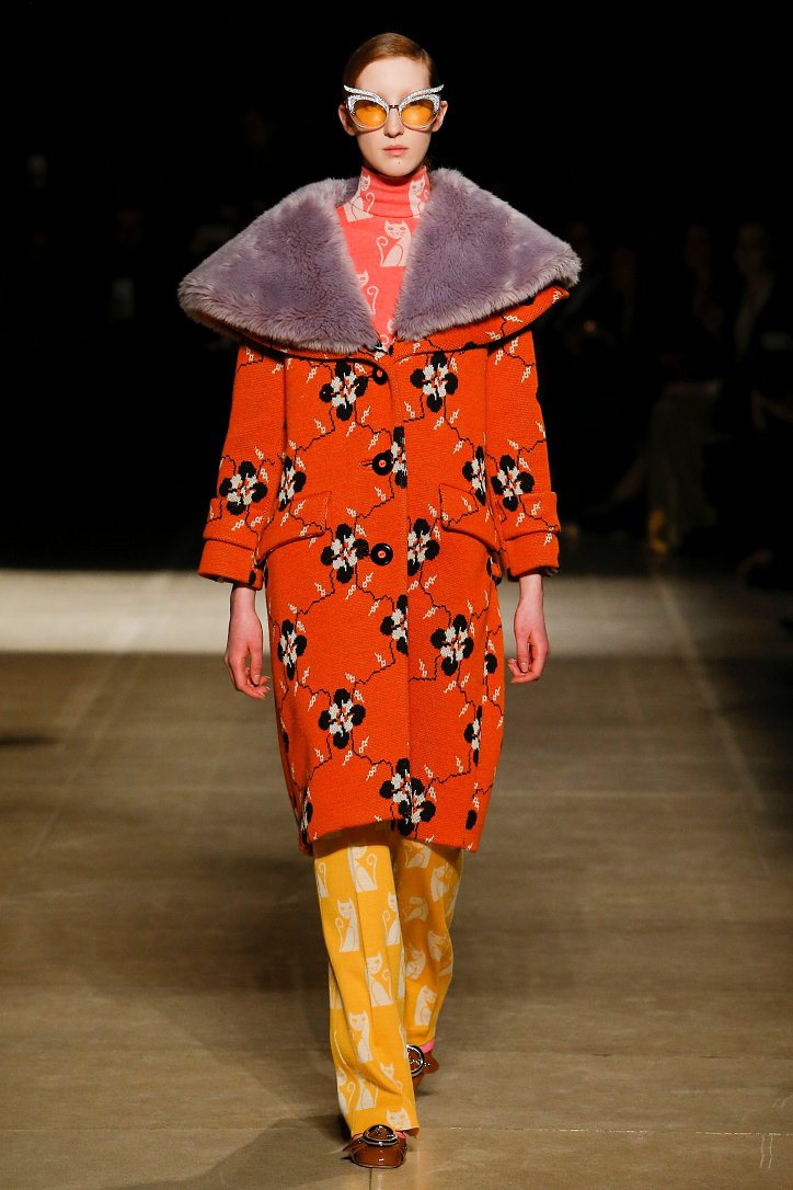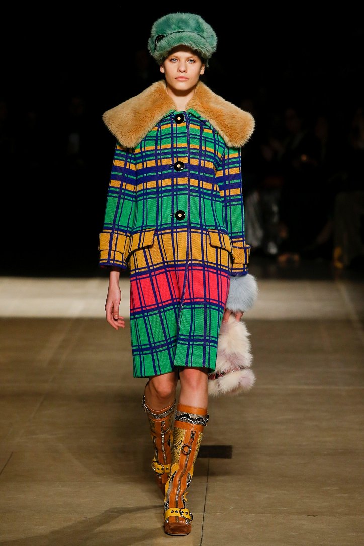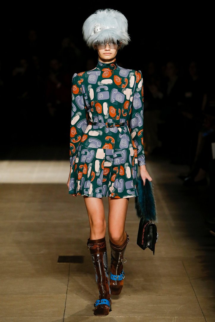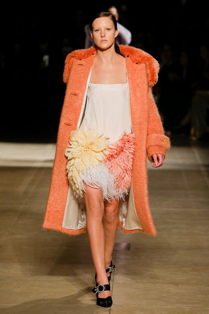 Стоило только оглядеться в Palais d'Iena – как становилось понятно, чему будет посвящена коллекция Miu Miu осень-зима 2017-2018: буквально все – от стульев до парадной лестницы – было затянуто искусственным бледно-фиолетовым мехом! Показавшиеся на подиуме модели сразу же подтвердили догадки публики, демонстрируя настоящую меховую феерию, которая поражала буйством цветов и принтов. Тут были сумасшедше яркие шубы и женские куртки из меха, пальто и прозрачные плащи с огромными воротниками-пелеринами, меховые полосатые унты и длинные, до локтя, варежки, сумки и кепки, шапки и шляпы – все, конечно же, из меха. Прекрасно вписались в этот разгул гламура и декор в виде пайеток, и блестящие пряжки, и украшения.