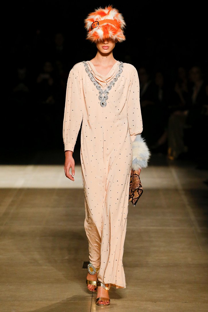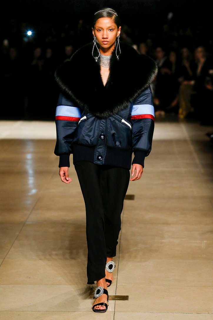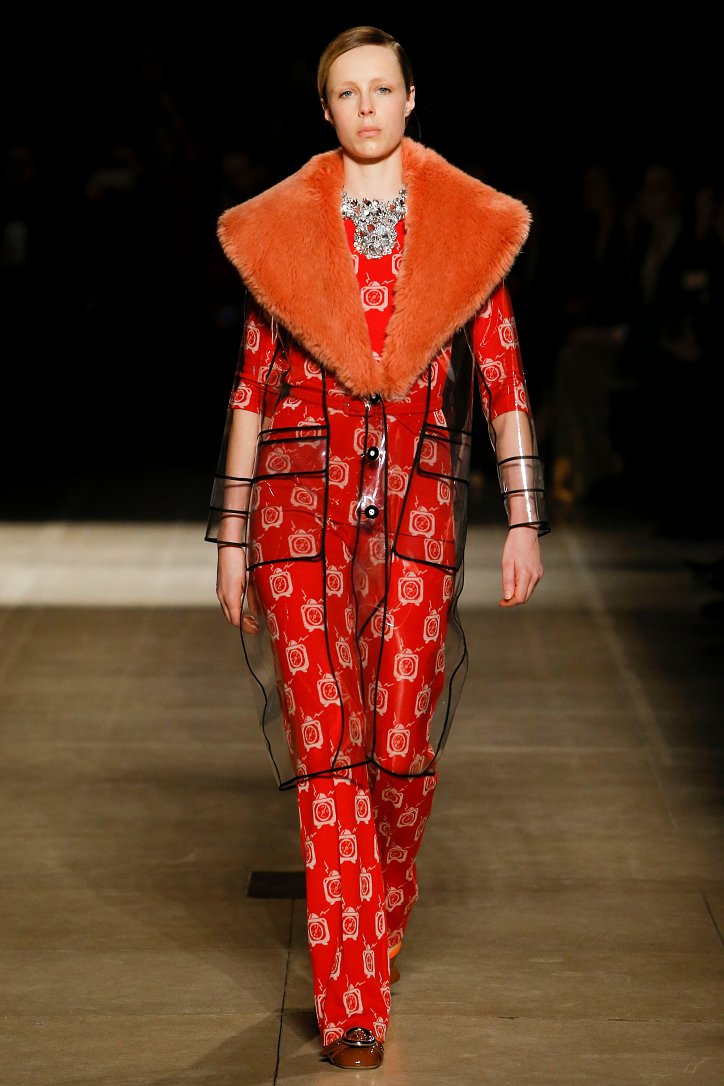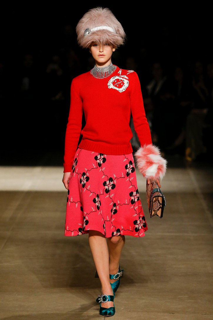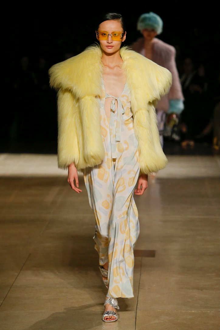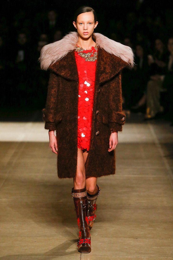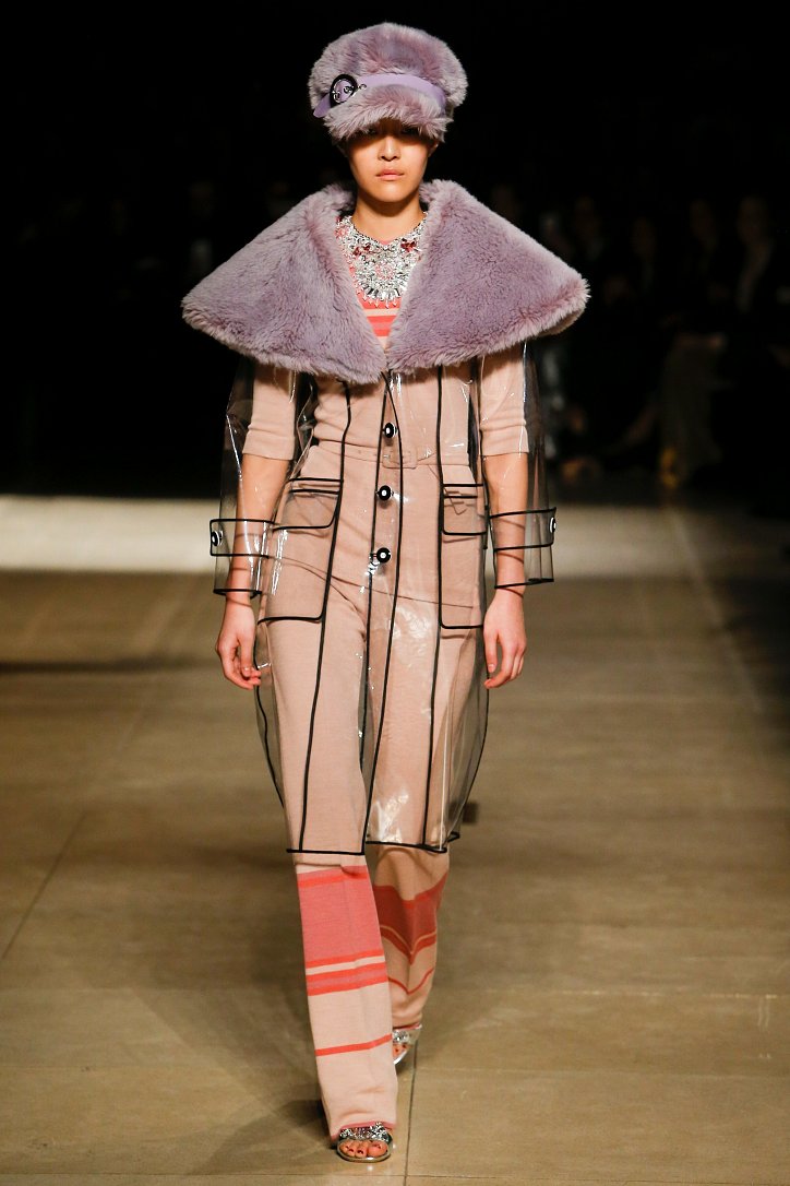 Стоило только оглядеться в Palais d'Iena – как становилось понятно, чему будет посвящена коллекция Miu Miu осень-зима 2017-2018: буквально все – от стульев до парадной лестницы – было затянуто искусственным бледно-фиолетовым мехом! Показавшиеся на подиуме модели сразу же подтвердили догадки публики, демонстрируя настоящую меховую феерию, которая поражала буйством цветов и принтов. Тут были сумасшедше яркие шубы и женские куртки из меха, пальто и прозрачные плащи с огромными воротниками-пелеринами, меховые полосатые унты и длинные, до локтя, варежки, сумки и кепки, шапки и шляпы – все, конечно же, из меха. Прекрасно вписались в этот разгул гламура и декор в виде пайеток, и блестящие пряжки, и украшения.