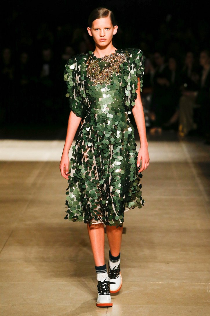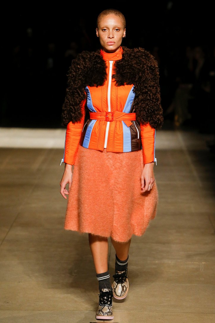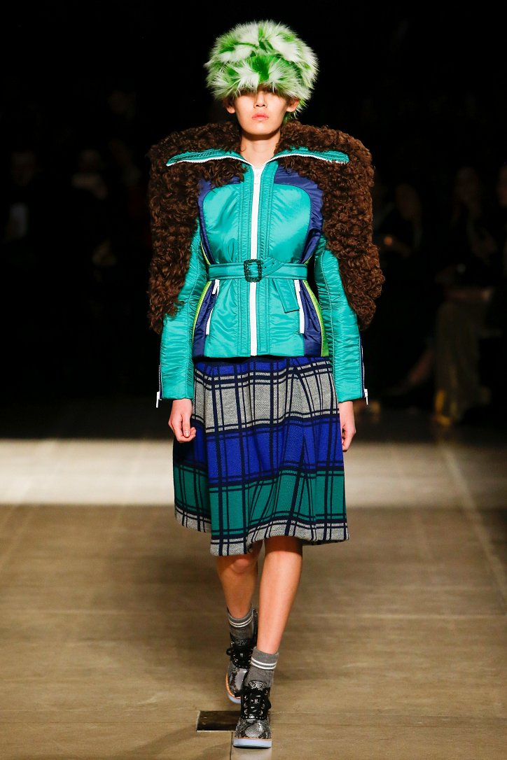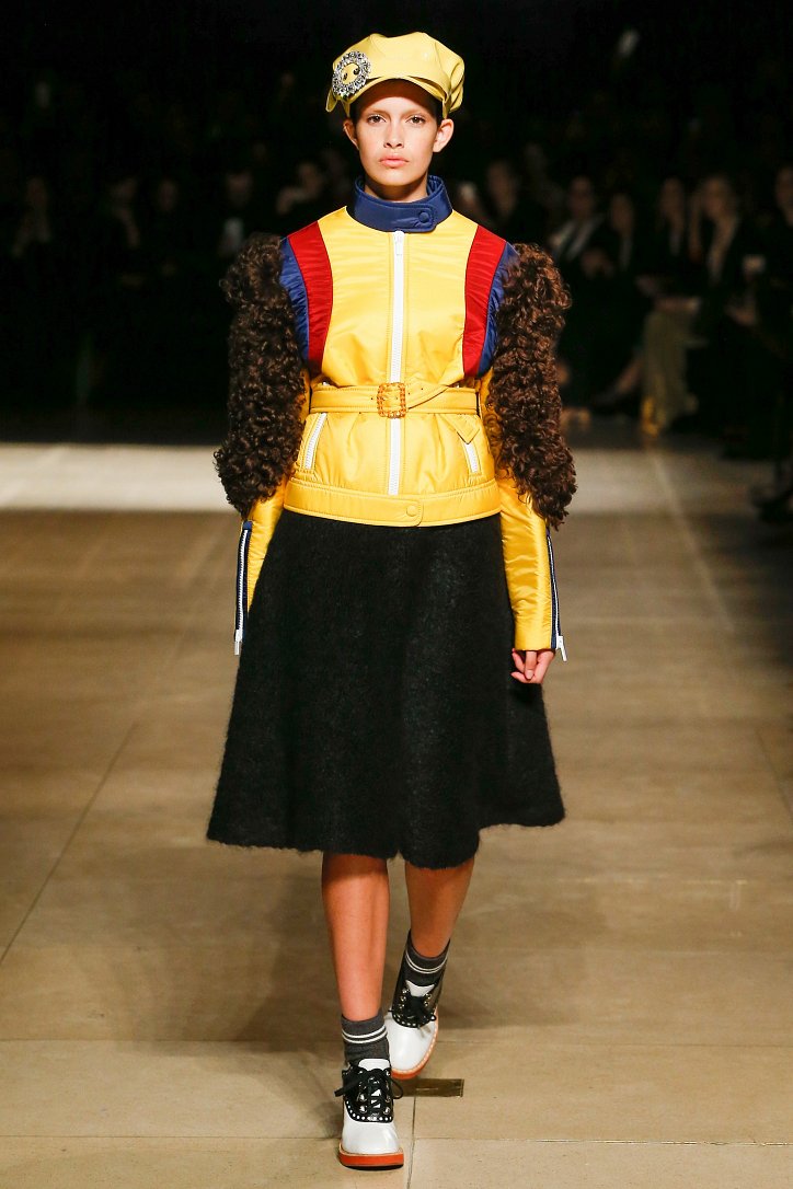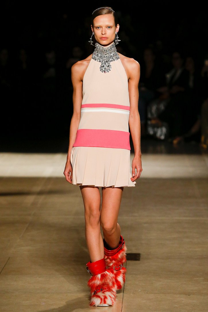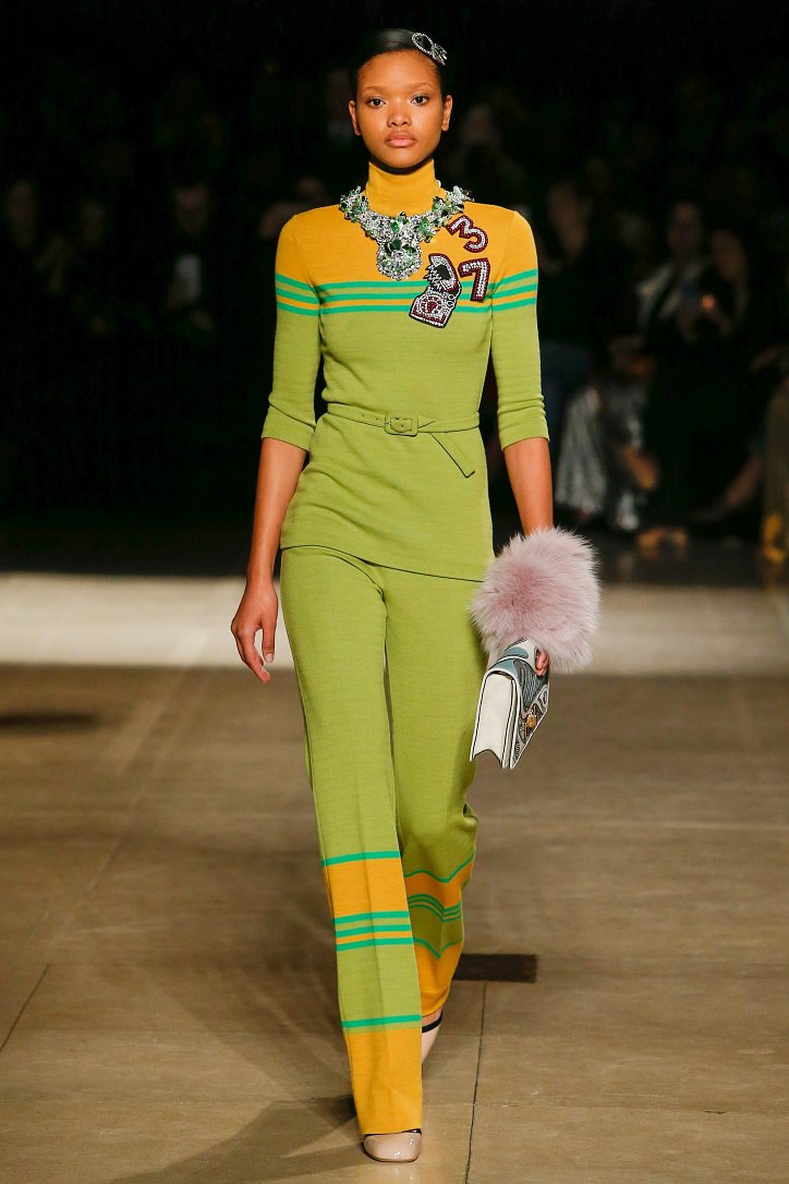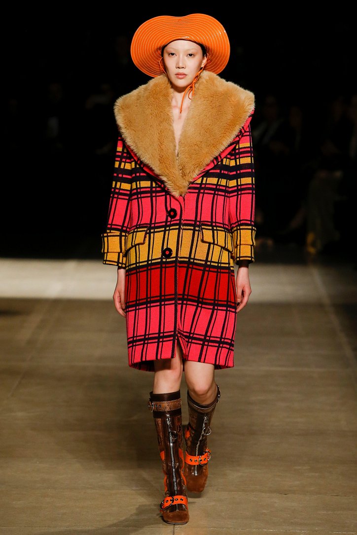 Стоило только оглядеться в Palais d'Iena – как становилось понятно, чему будет посвящена коллекция Miu Miu осень-зима 2017-2018: буквально все – от стульев до парадной лестницы – было затянуто искусственным бледно-фиолетовым мехом! Показавшиеся на подиуме модели сразу же подтвердили догадки публики, демонстрируя настоящую меховую феерию, которая поражала буйством цветов и принтов. Тут были сумасшедше яркие шубы и женские куртки из меха, пальто и прозрачные плащи с огромными воротниками-пелеринами, меховые полосатые унты и длинные, до локтя, варежки, сумки и кепки, шапки и шляпы – все, конечно же, из меха. Прекрасно вписались в этот разгул гламура и декор в виде пайеток, и блестящие пряжки, и украшения.