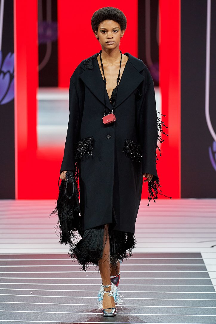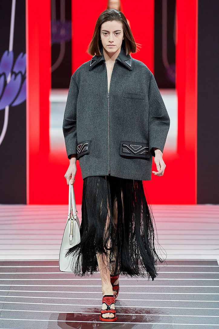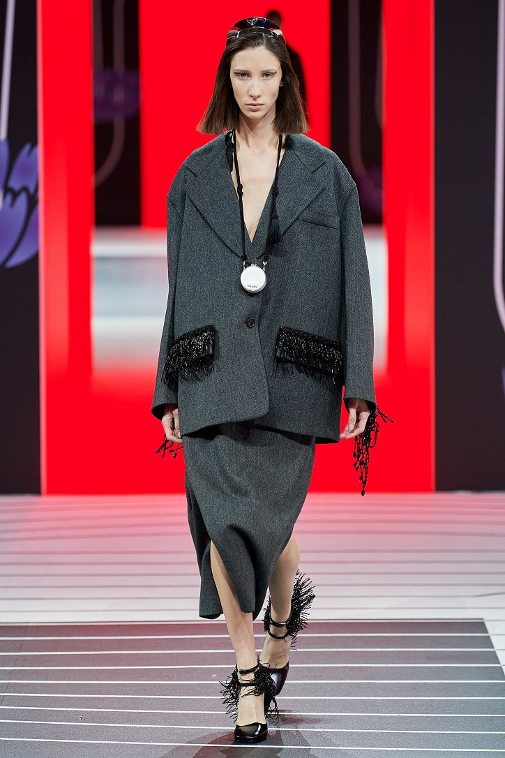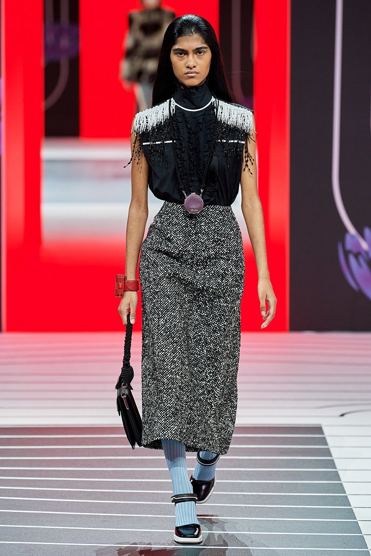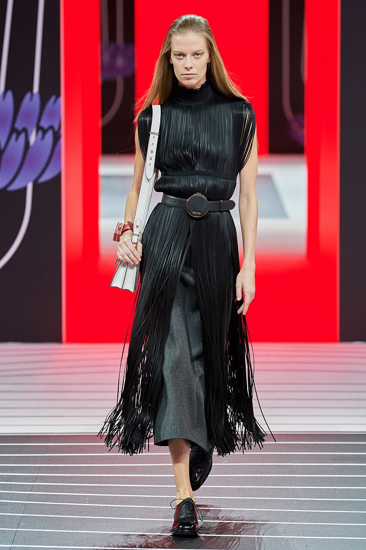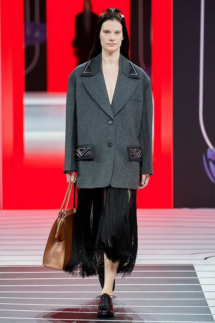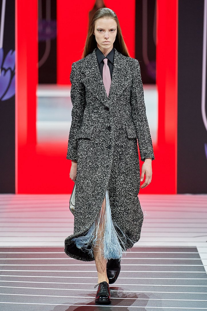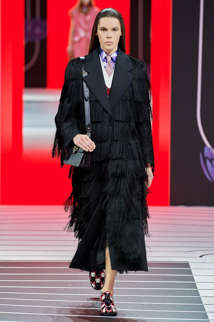 Быть сильной и женственной одновременно – возможно! Именно таким был посыл новой коллекции Prada осень-зима 2020-2021. Миучча Прада решила соединить воедино «гардеробные» атрибуты бизнес-леди и утончённой и даже немного легкомысленной женщины. В результате на подиуме появились модели в классических деловых однобортных жакетах, перехваченных на талии кожаными ремнями, а пару им составили юбки из шелковой бахромы, взлетающий и оголяющей ноги при каждом шаге.