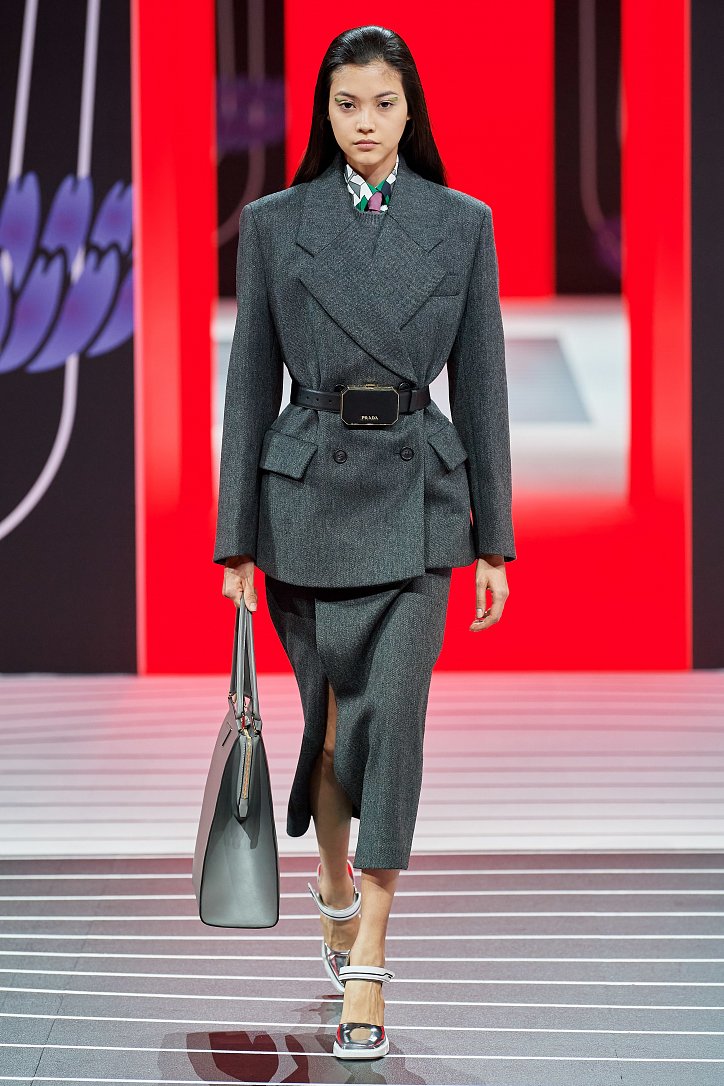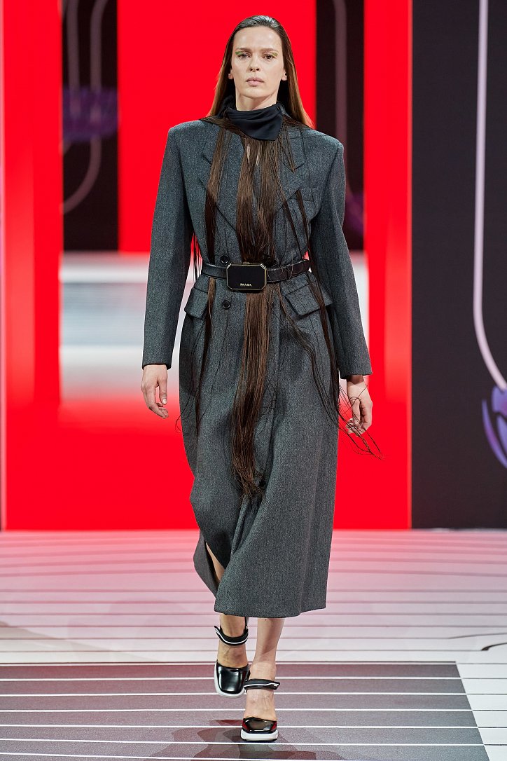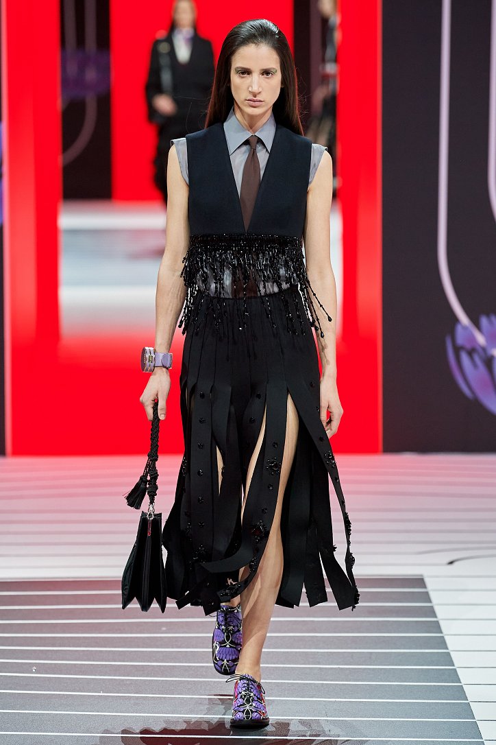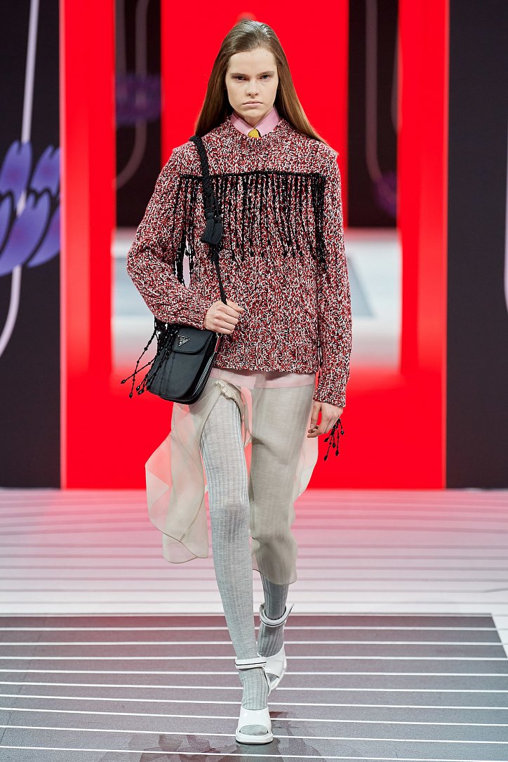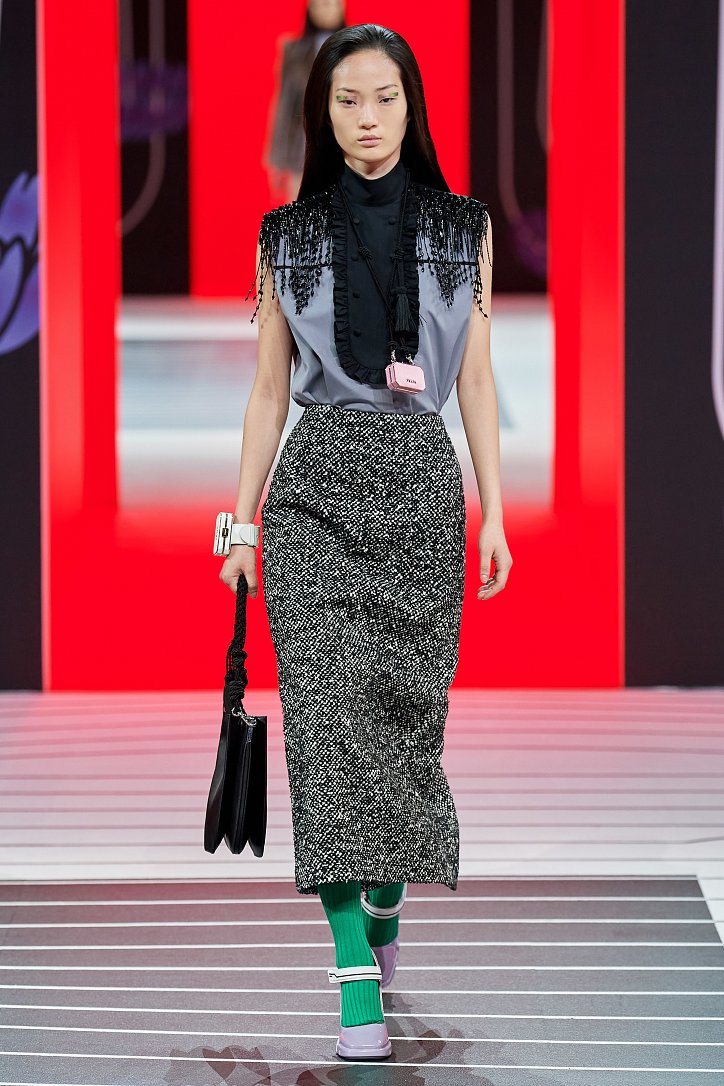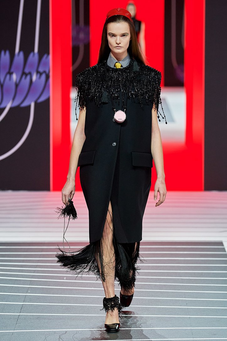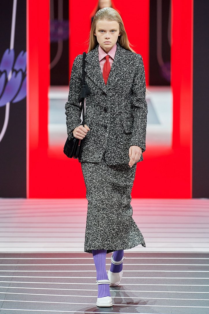 Быть сильной и женственной одновременно – возможно! Именно таким был посыл новой коллекции Prada осень-зима 2020-2021. Миучча Прада решила соединить воедино «гардеробные» атрибуты бизнес-леди и утончённой и даже немного легкомысленной женщины. В результате на подиуме появились модели в классических деловых однобортных жакетах, перехваченных на талии кожаными ремнями, а пару им составили юбки из шелковой бахромы, взлетающий и оголяющей ноги при каждом шаге.