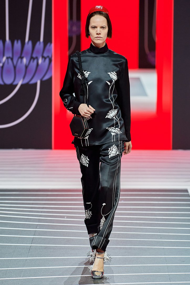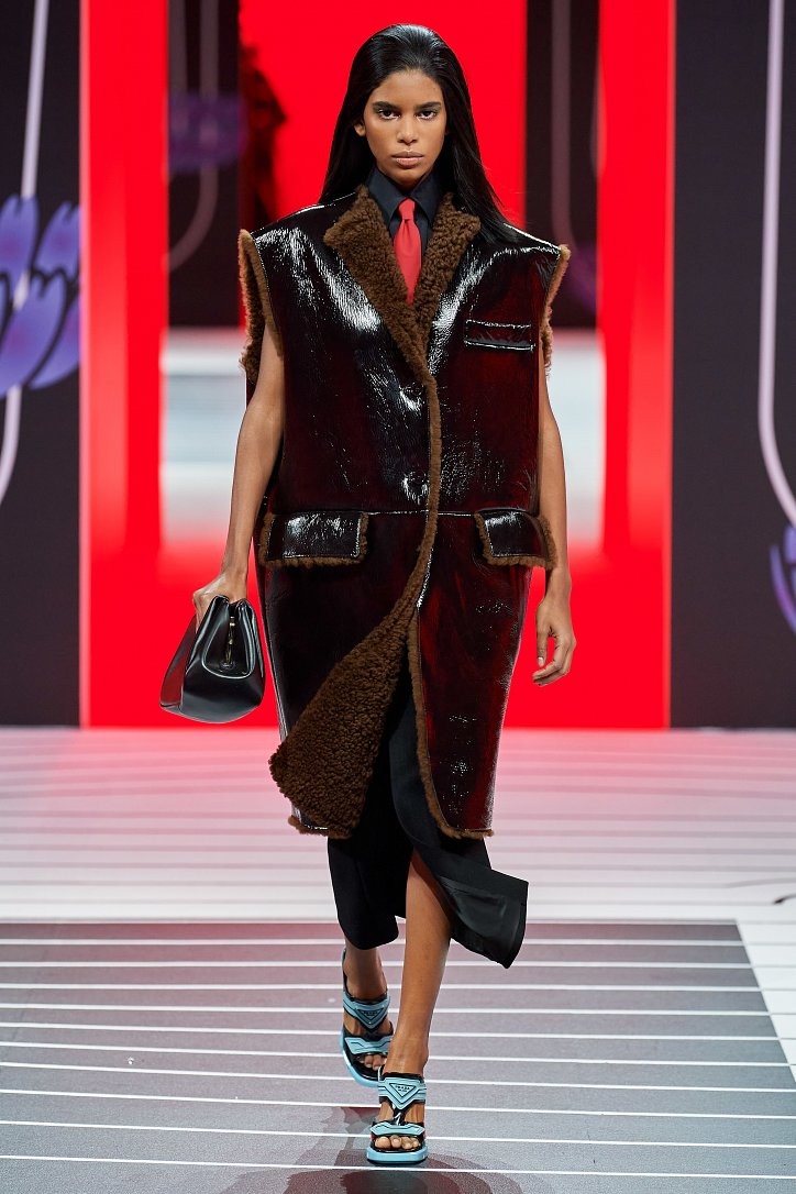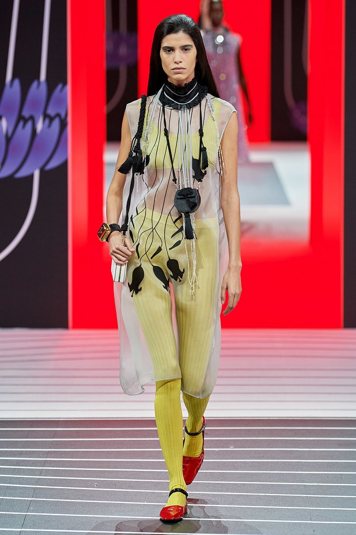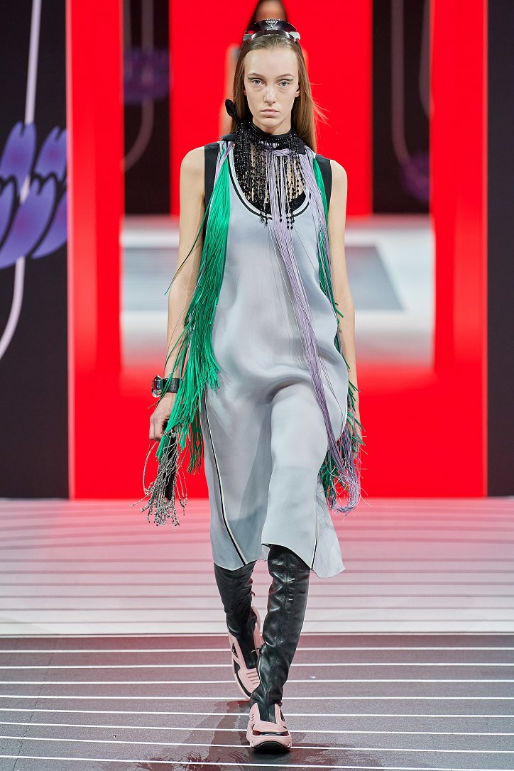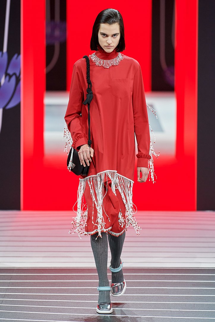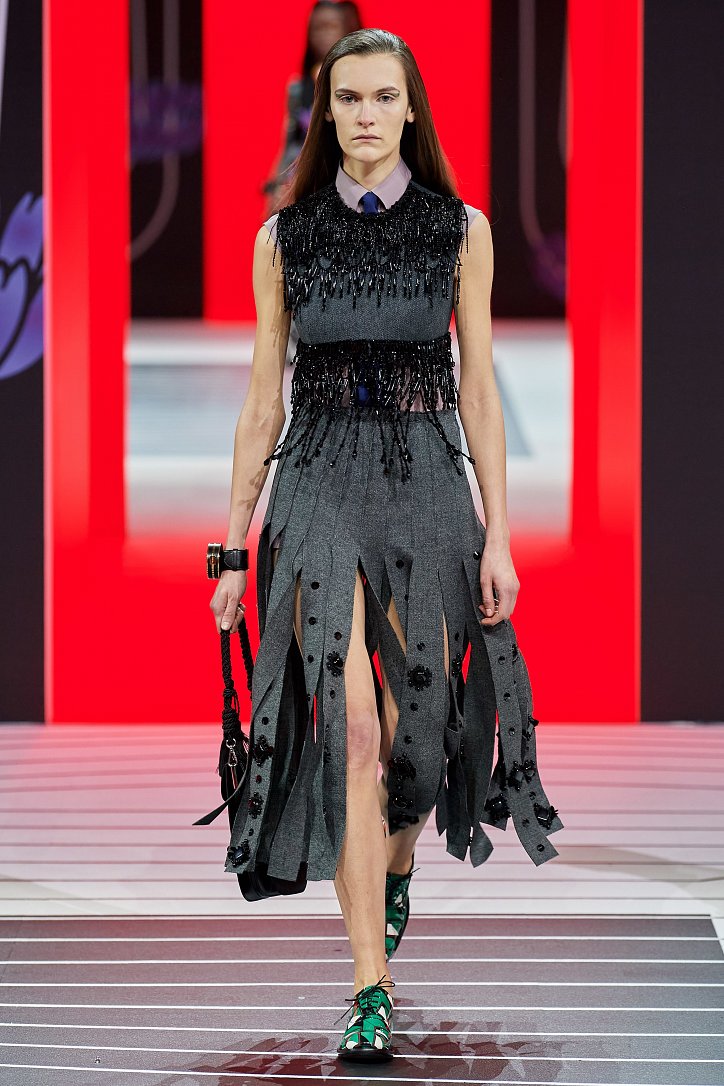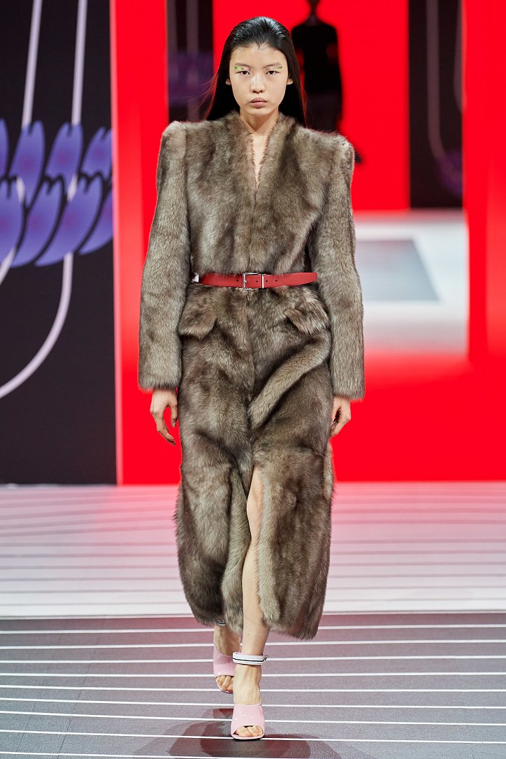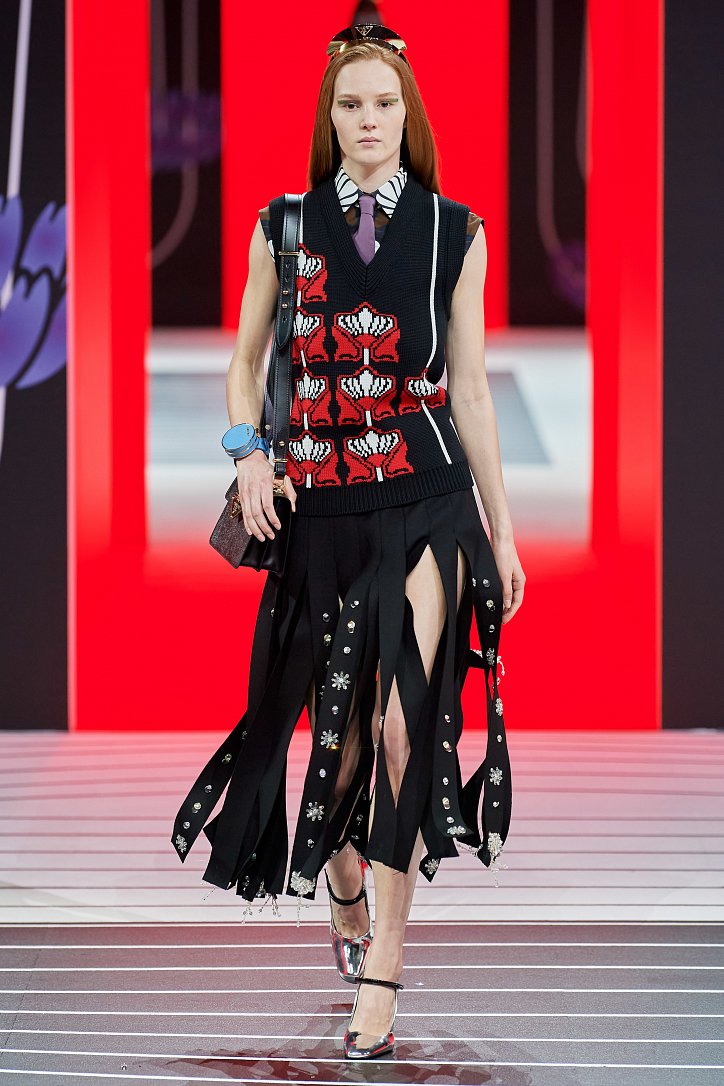 Быть сильной и женственной одновременно – возможно! Именно таким был посыл новой коллекции Prada осень-зима 2020-2021. Миучча Прада решила соединить воедино «гардеробные» атрибуты бизнес-леди и утончённой и даже немного легкомысленной женщины. В результате на подиуме появились модели в классических деловых однобортных жакетах, перехваченных на талии кожаными ремнями, а пару им составили юбки из шелковой бахромы, взлетающий и оголяющей ноги при каждом шаге.