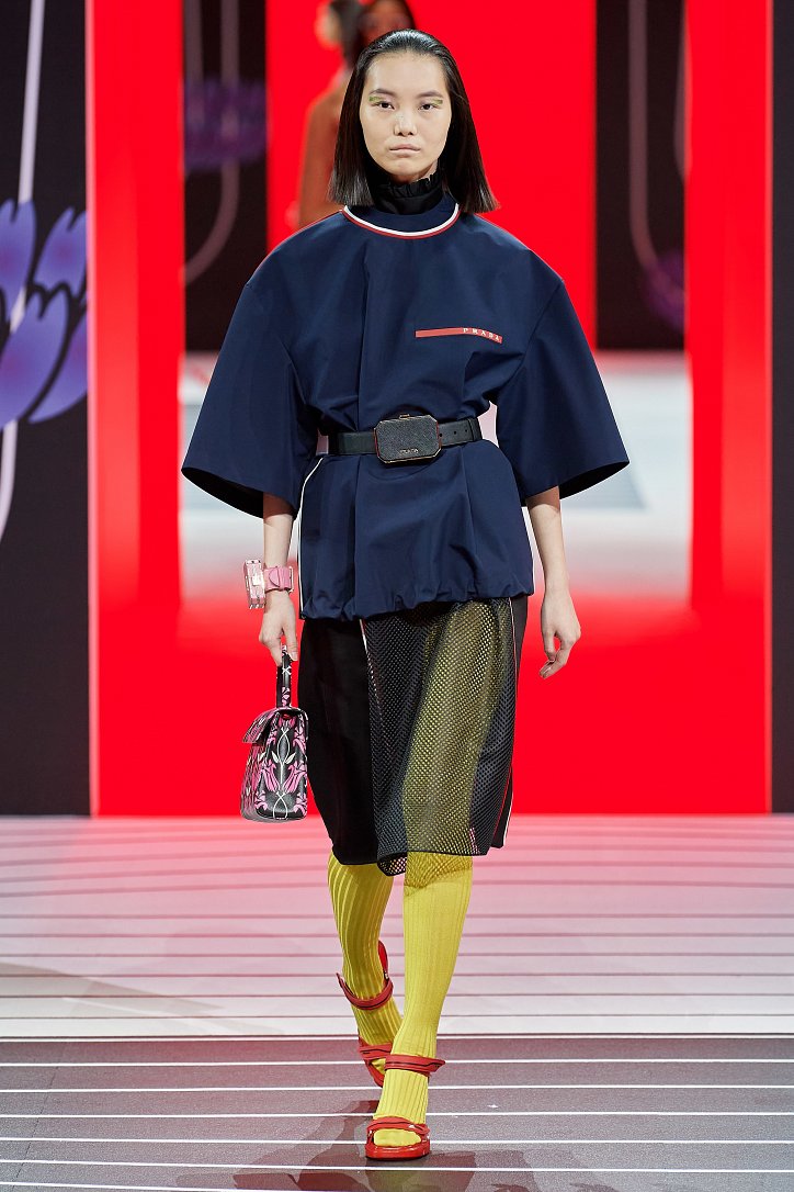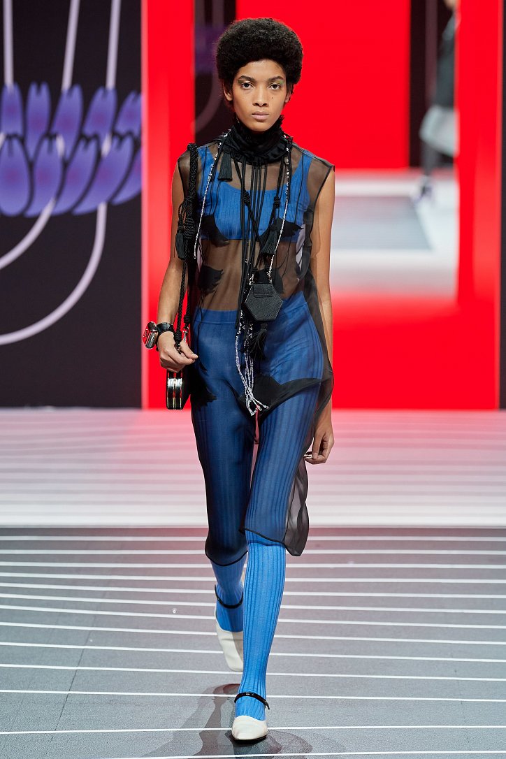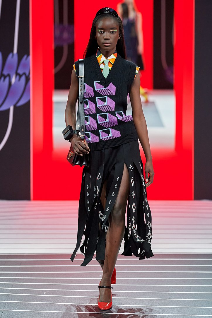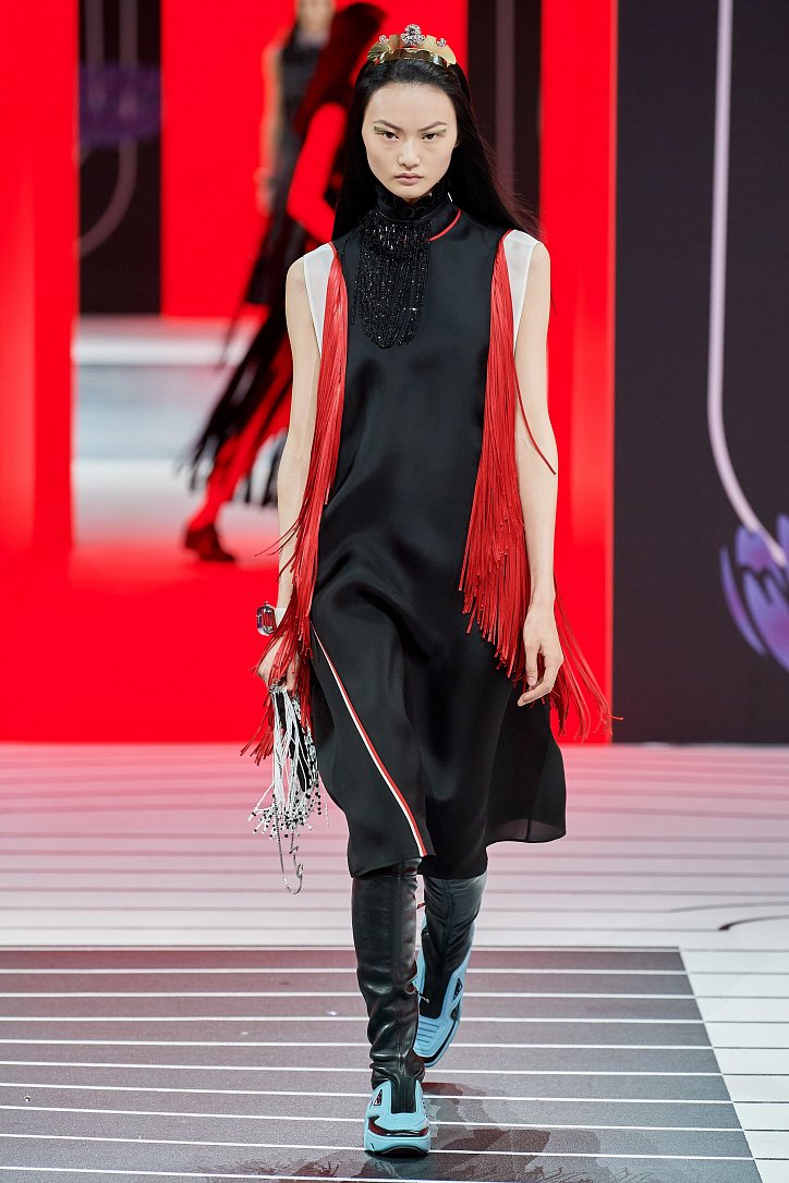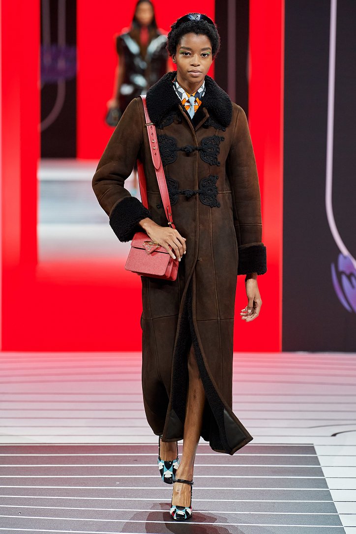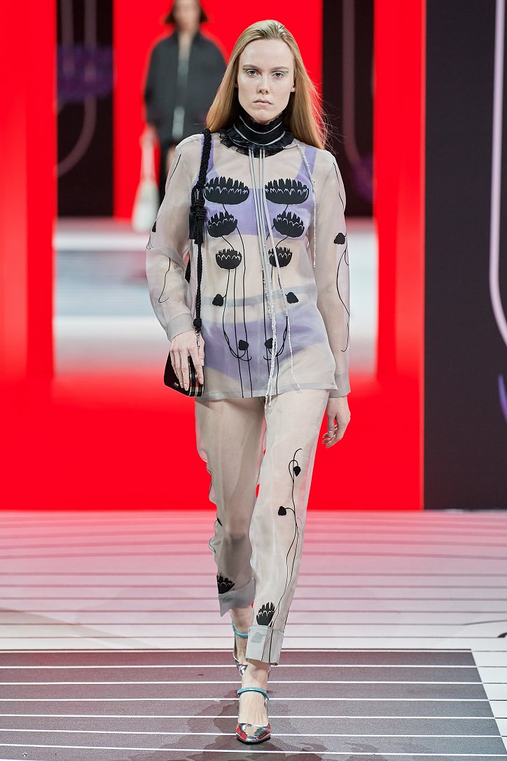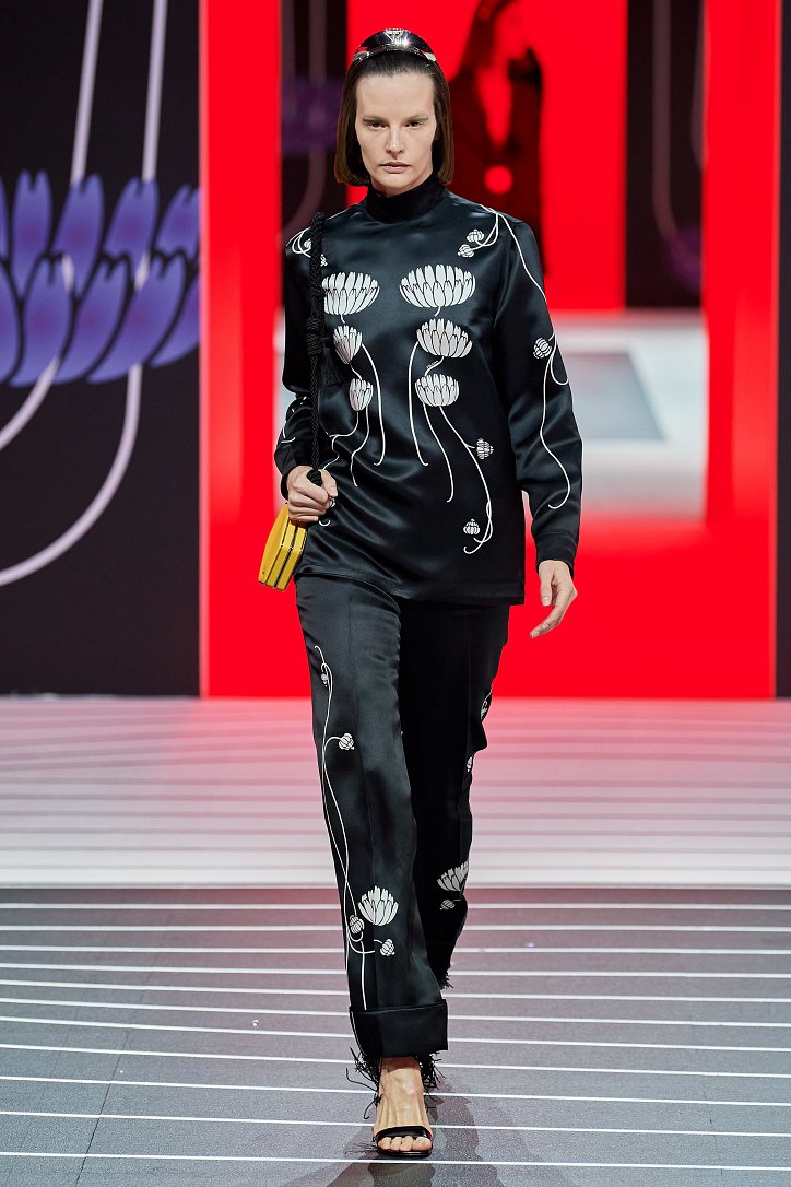 Быть сильной и женственной одновременно – возможно! Именно таким был посыл новой коллекции Prada осень-зима 2020-2021. Миучча Прада решила соединить воедино «гардеробные» атрибуты бизнес-леди и утончённой и даже немного легкомысленной женщины. В результате на подиуме появились модели в классических деловых однобортных жакетах, перехваченных на талии кожаными ремнями, а пару им составили юбки из шелковой бахромы, взлетающий и оголяющей ноги при каждом шаге.