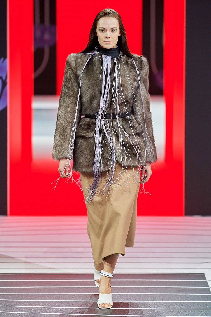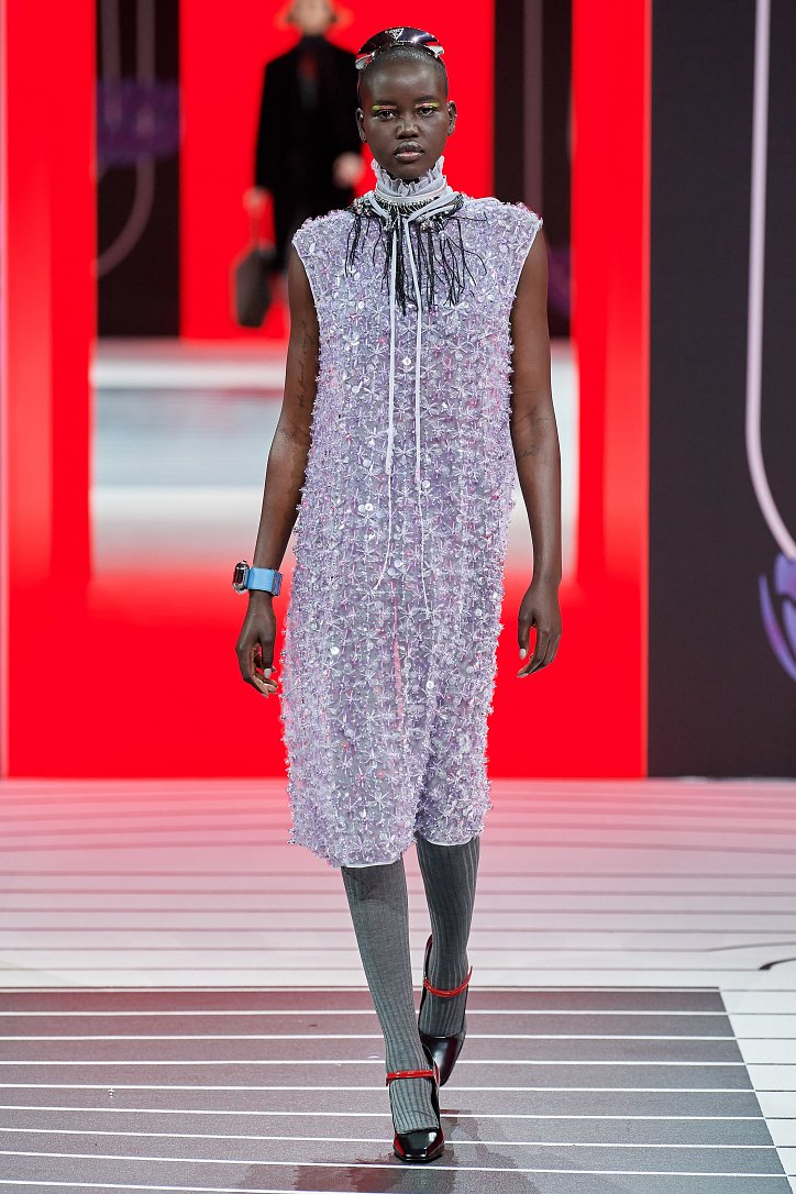 В других луках бахрома выглядела как широкие полосы ткани – так, слово юбку нарезали в шредере. Эту же идею развивали и аутфиты с мешковатыми классическими пальто в мужском стиле, которые дизайнер предлагает носить с прозрачными тюлевыми платьями с рюшами на груди, и эффектные украшения, которые дополняли многие осенние луки, и яркая обувь, и цветные колготки.