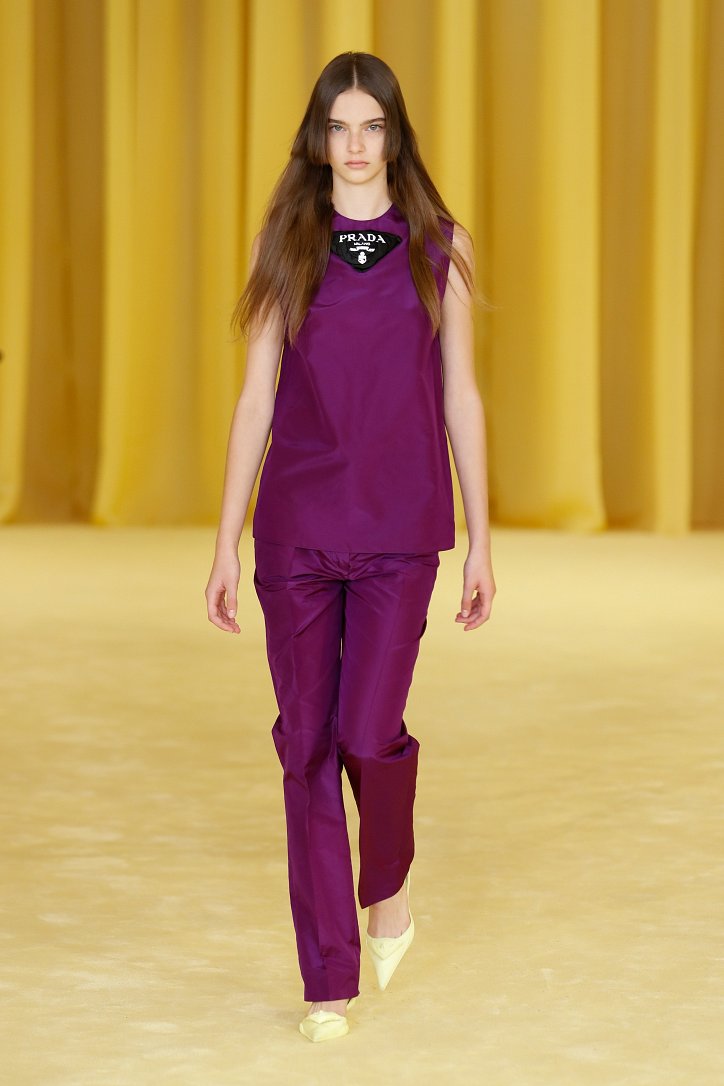 В целом же коллекция была посвящена столь любимой Миуччей Прада теме униформы. Новой униформой Prada стали узкие брюки в стиле девяностых и топы, напоминающие футболки без рукавов (в некоторых луках их заменяли рубашки и туники). Дополняли образы остроконечные туфли с открытой пяткой, которые стали настоящим «гвоздем программы».