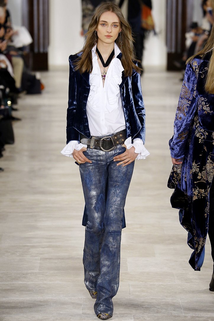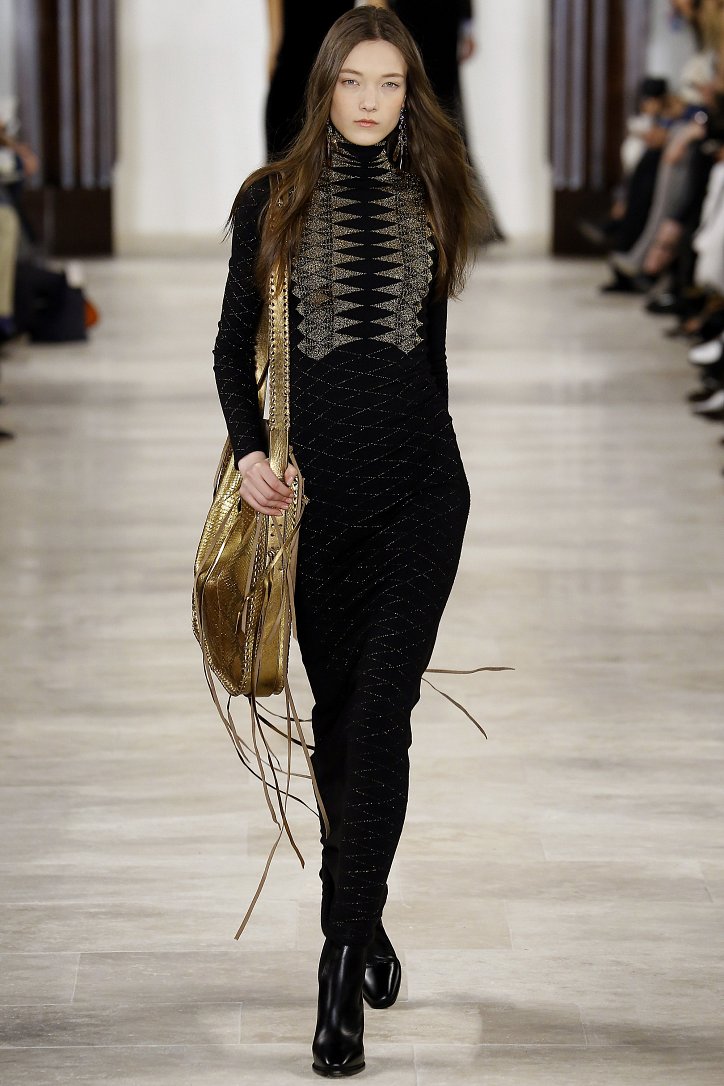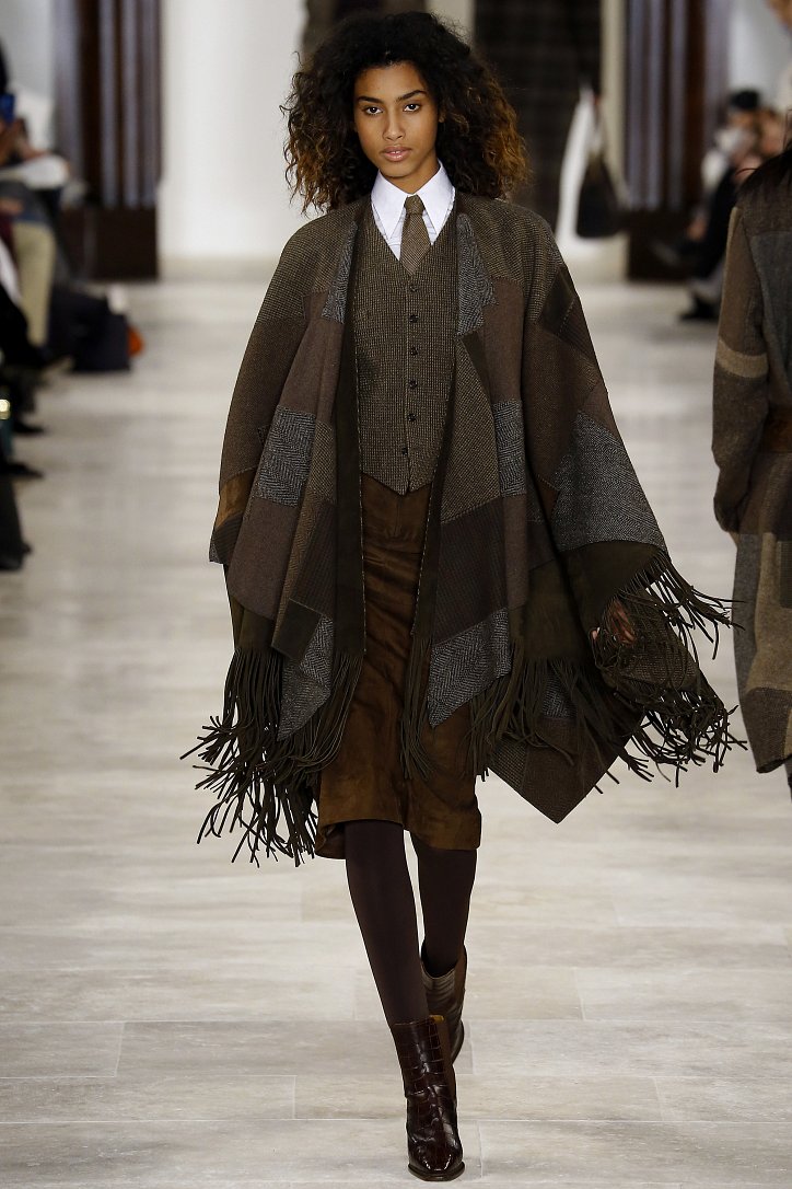 Элегантная и утонченная, коллекция Ralph Lauren осень-зима 2016-2017 стала роскошным «лоскутным одеялом», в котором сплелись воедино королевский шик, расслабленность английского деревенского быта и традиционный стиль индейцев навахо.