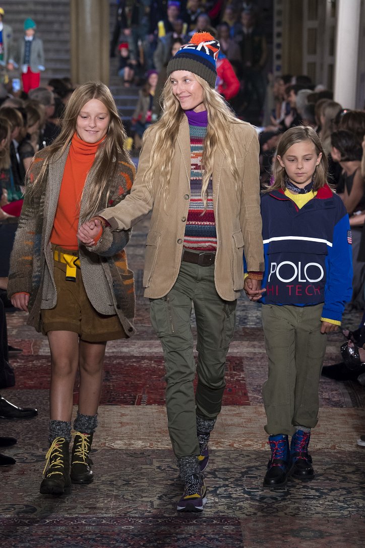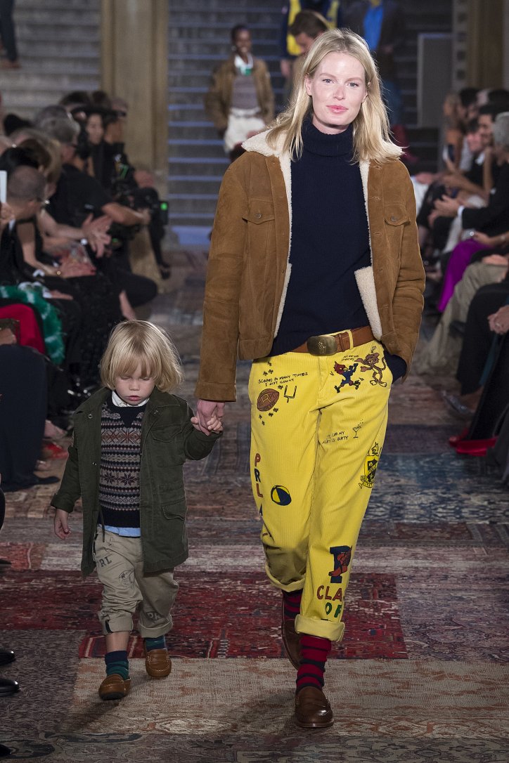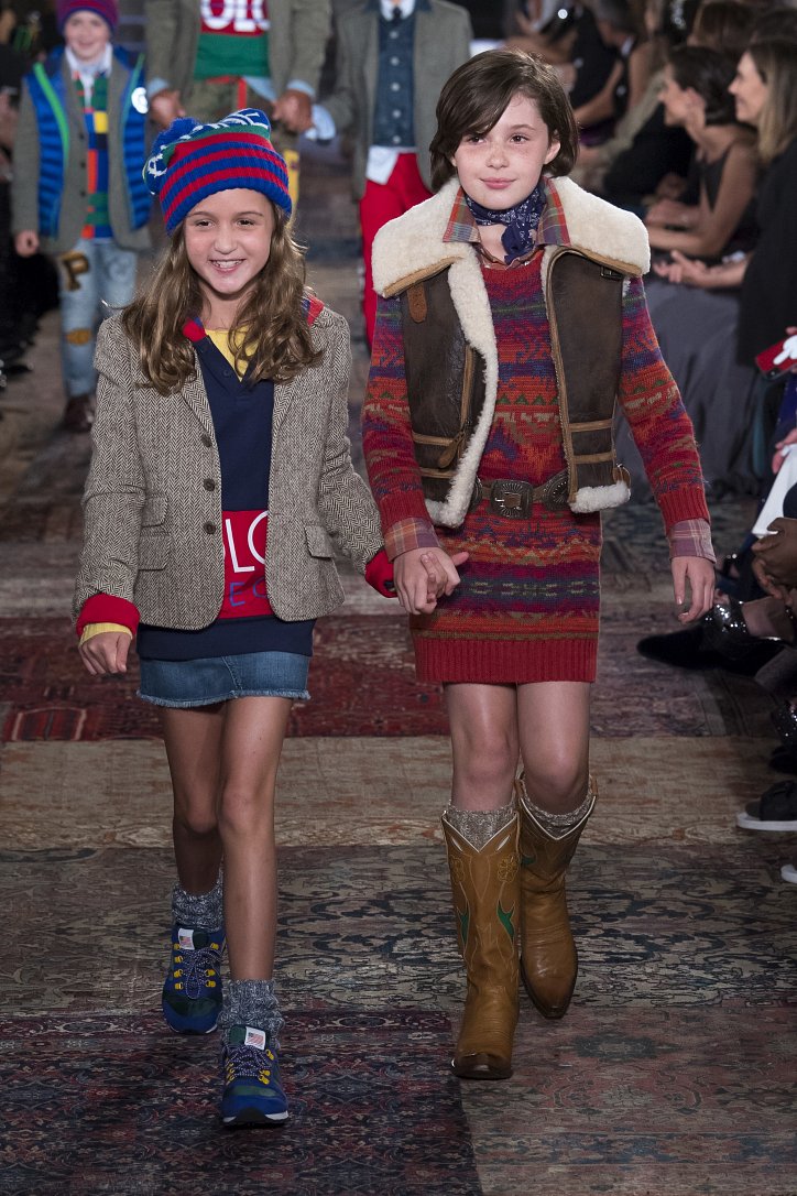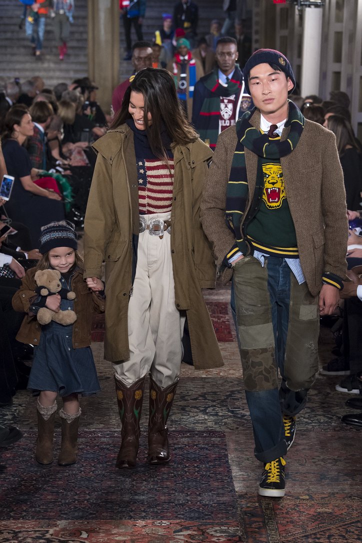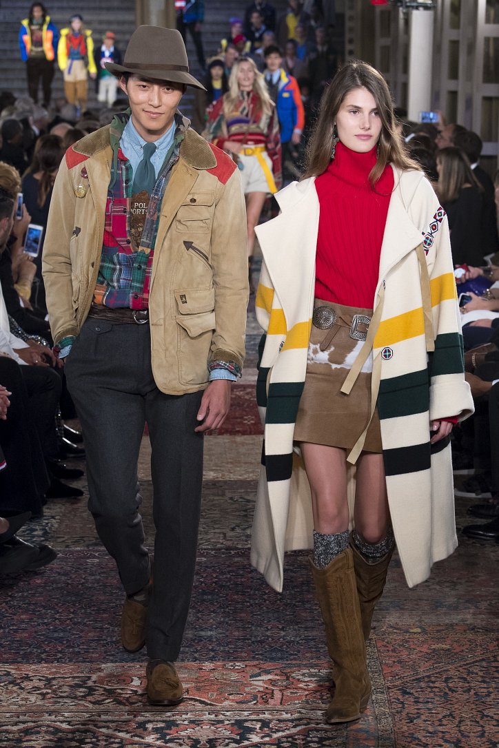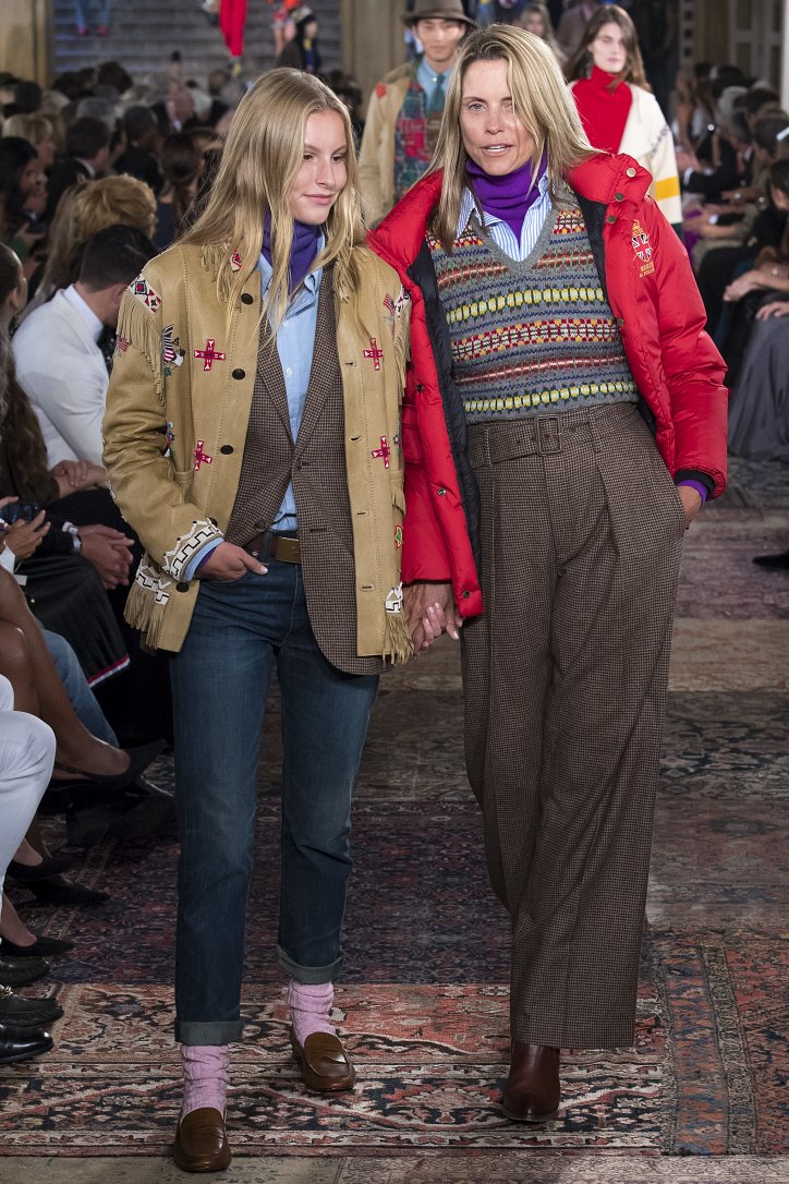 Пестрые кардиганы в стиле индейских накидок, клетчатые рубашки, деним и грубые вязаные свитеры, пэчворк и замша – тема Дикого Запада звучала особенно ярко на юбилейном показе. А показ линейки Polo Ralph Lauren получился по-настоящему семейным: модели выходили парами вместе с детьми.
