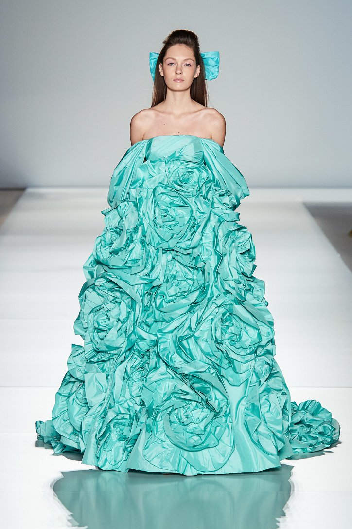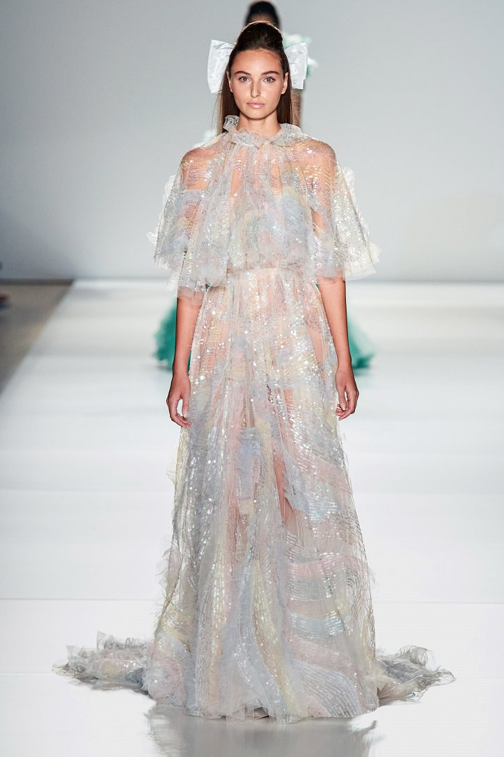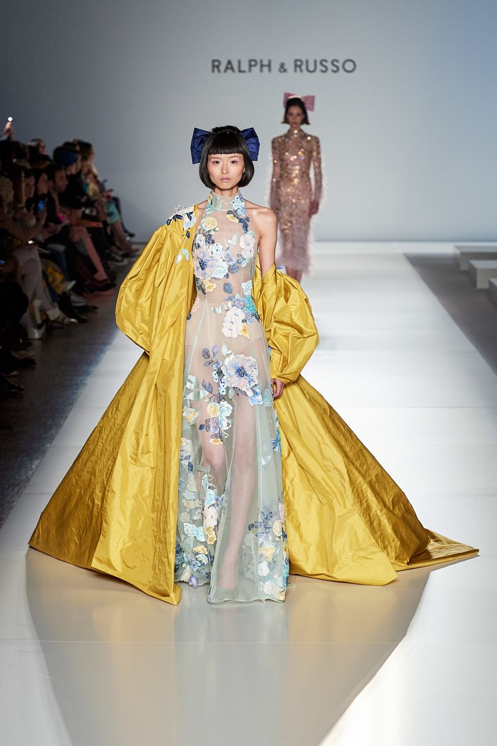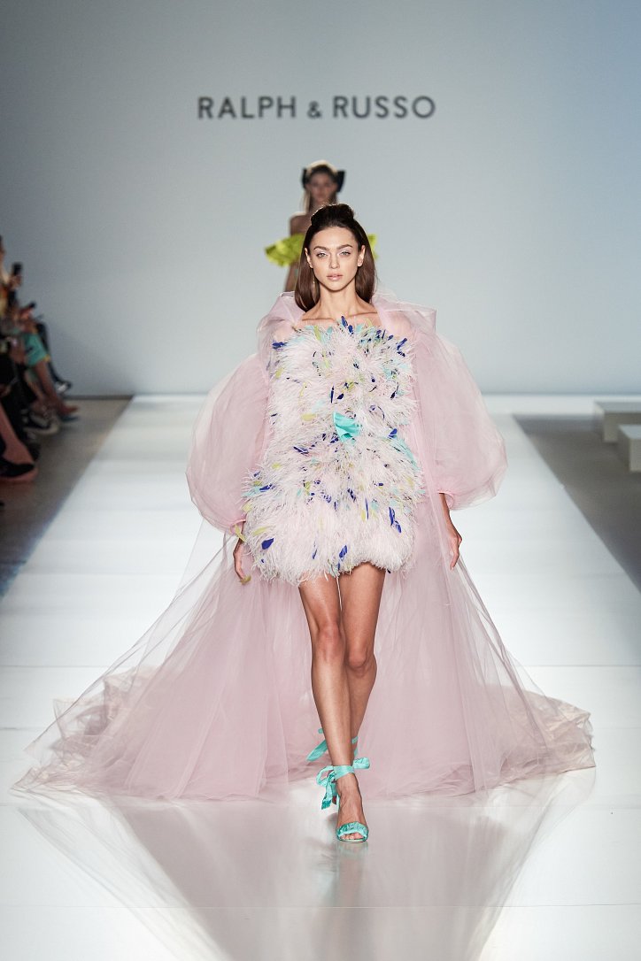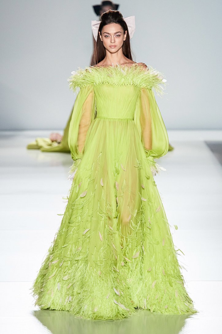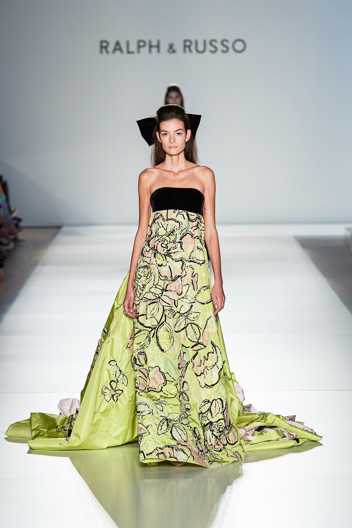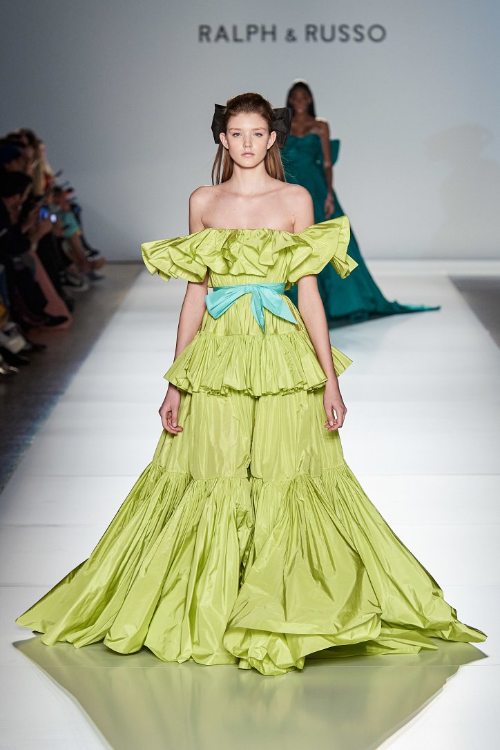 Оригинальной была и цветовая гамма коллекции Ralph & Russo, в которой солировали желто-зеленый шартрез и прохладный аква, разбавленные оттенками белого и нежно-розового.