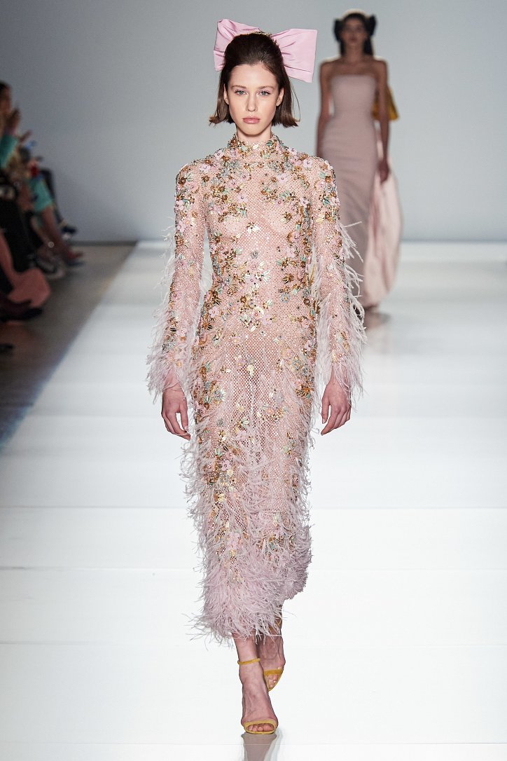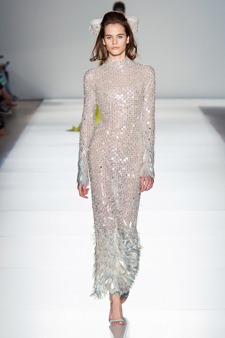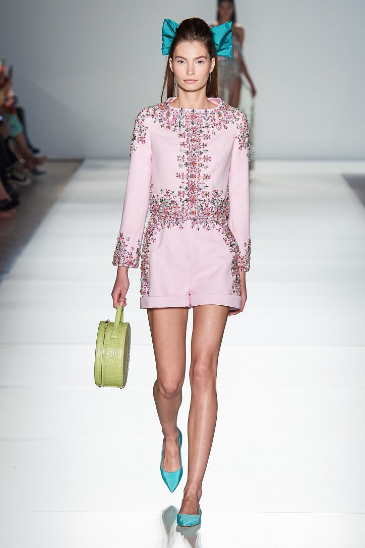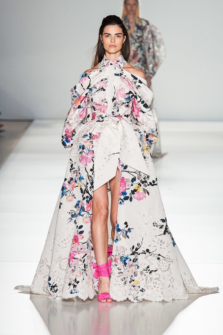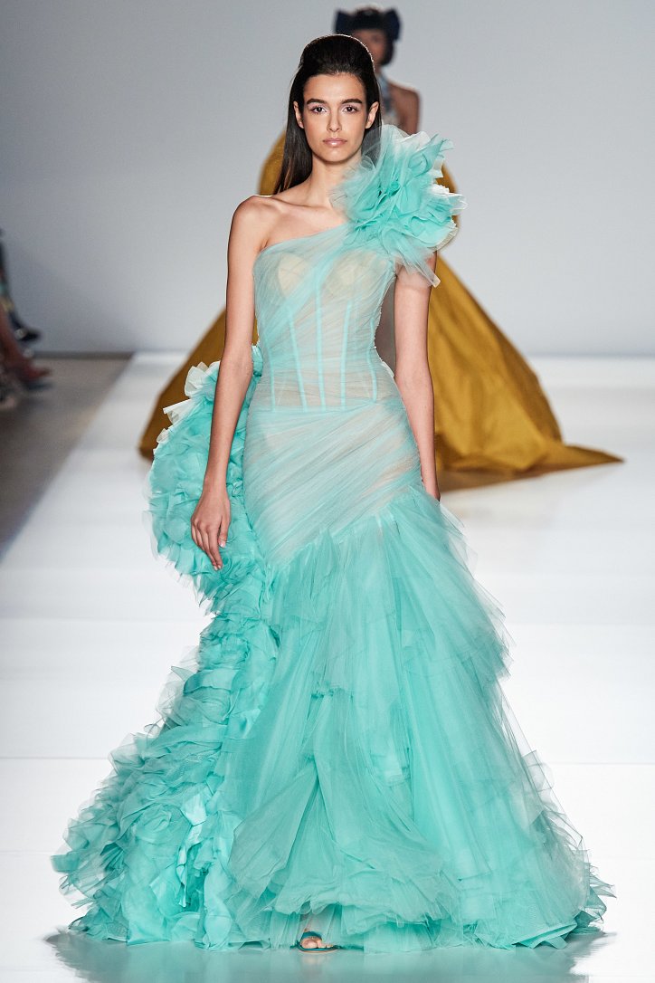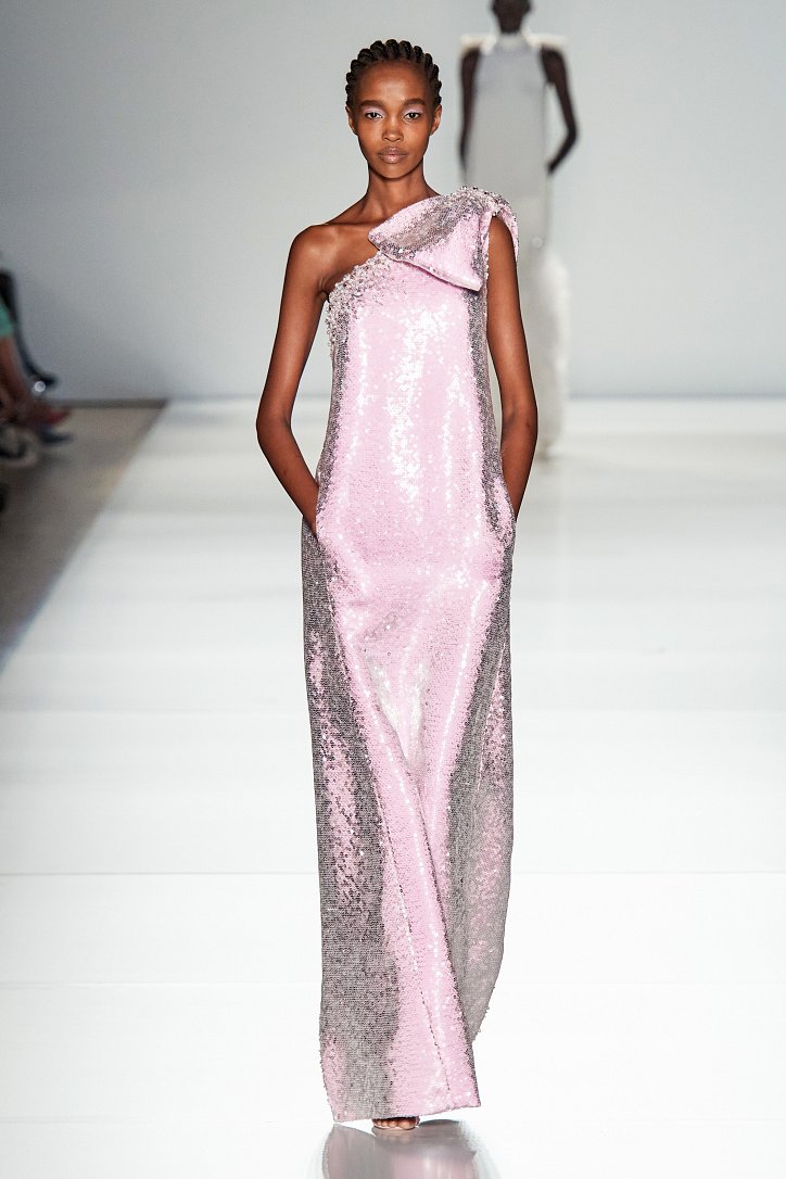 Оригинальной была и цветовая гамма коллекции Ralph & Russo, в которой солировали желто-зеленый шартрез и прохладный аква, разбавленные оттенками белого и нежно-розового.