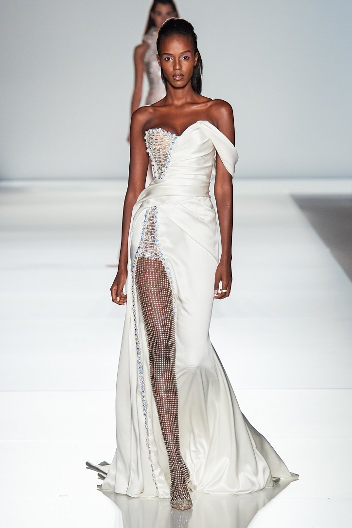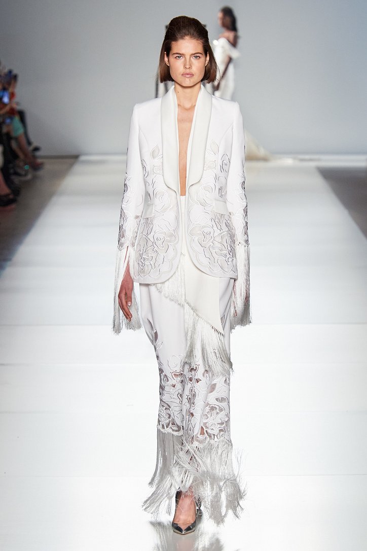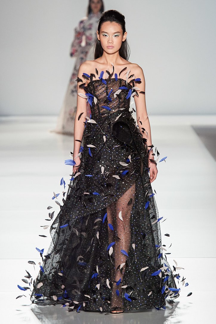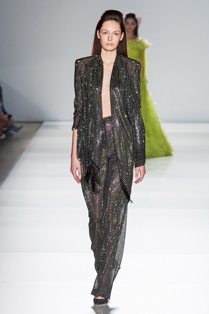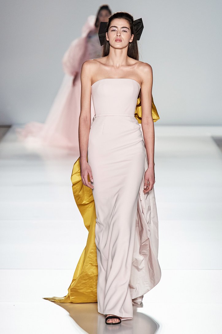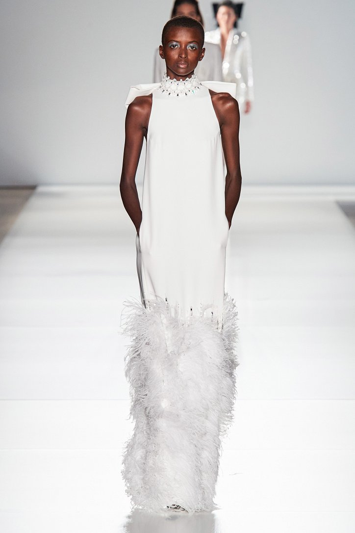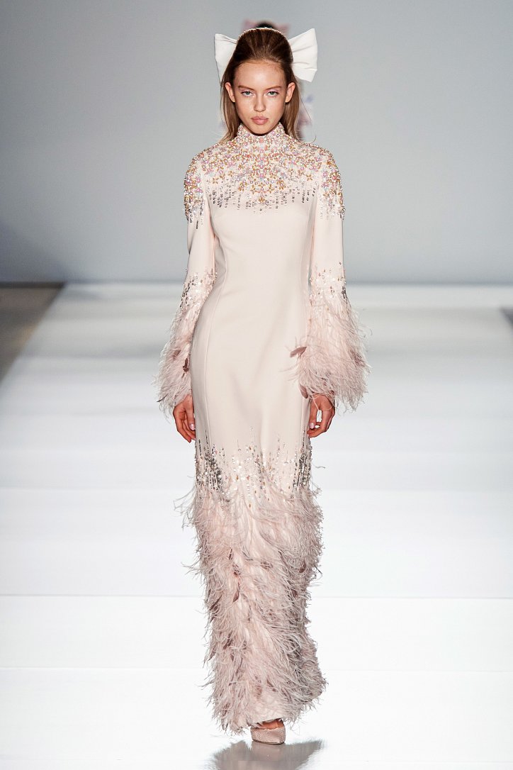 Оригинальной была и цветовая гамма коллекции Ralph & Russo, в которой солировали желто-зеленый шартрез и прохладный аква, разбавленные оттенками белого и нежно-розового.