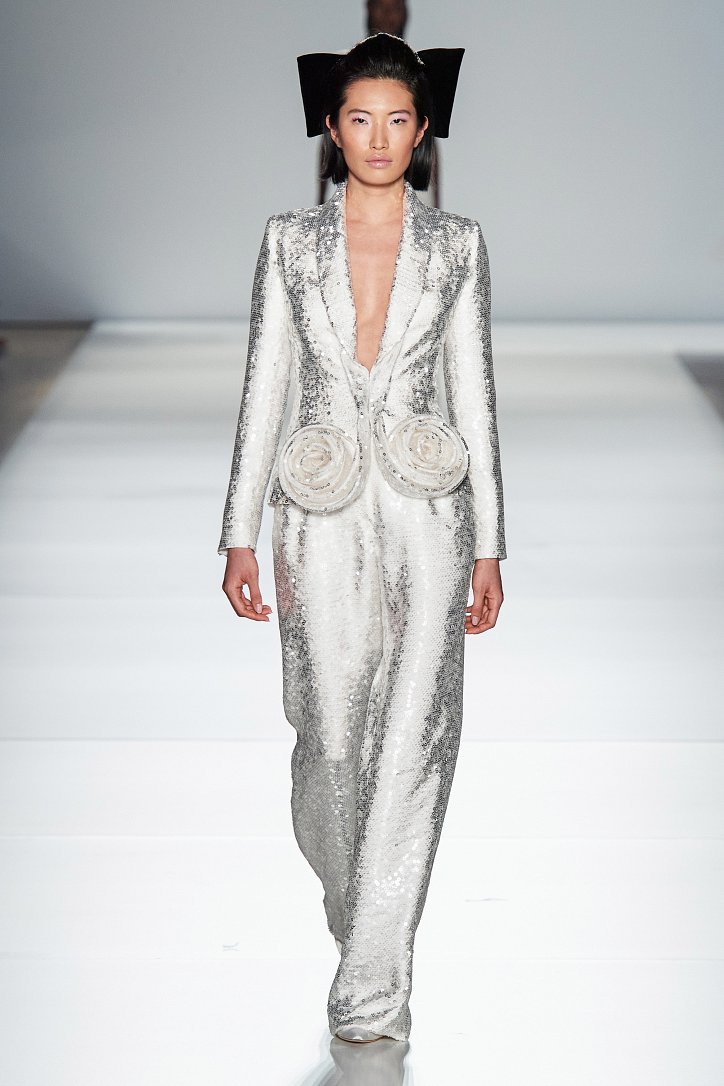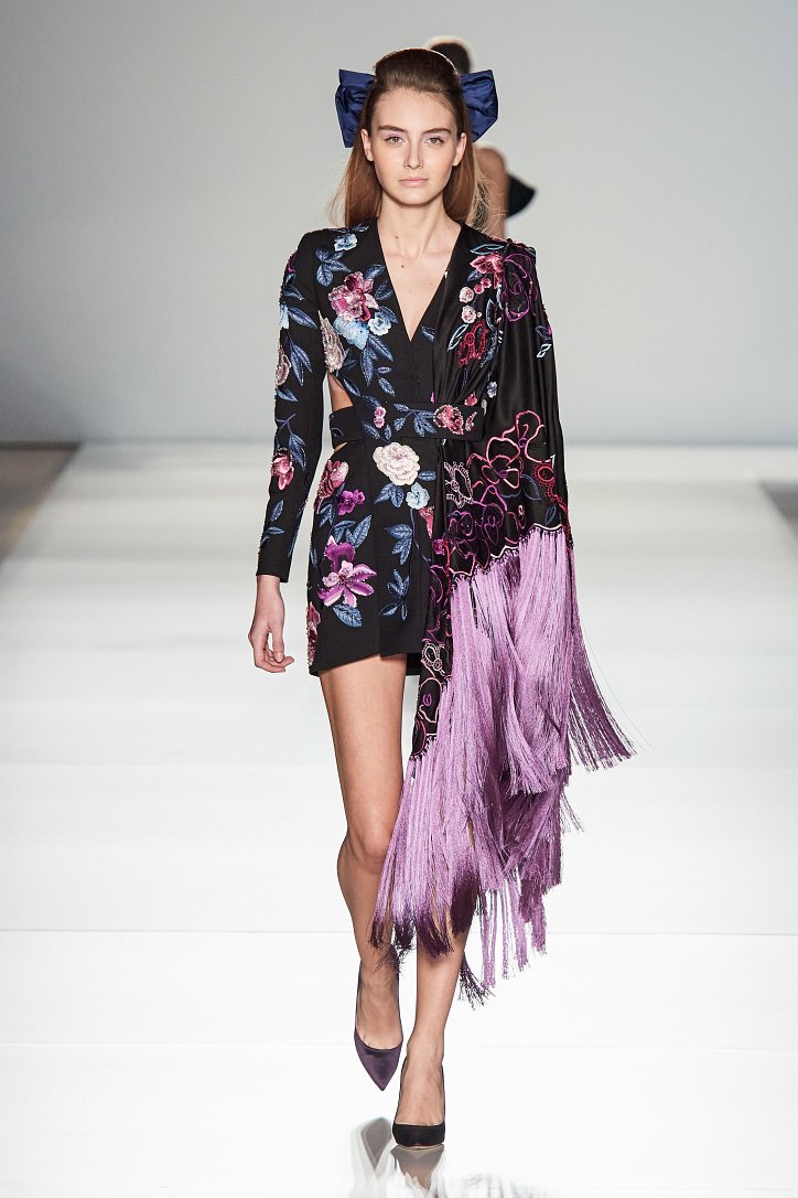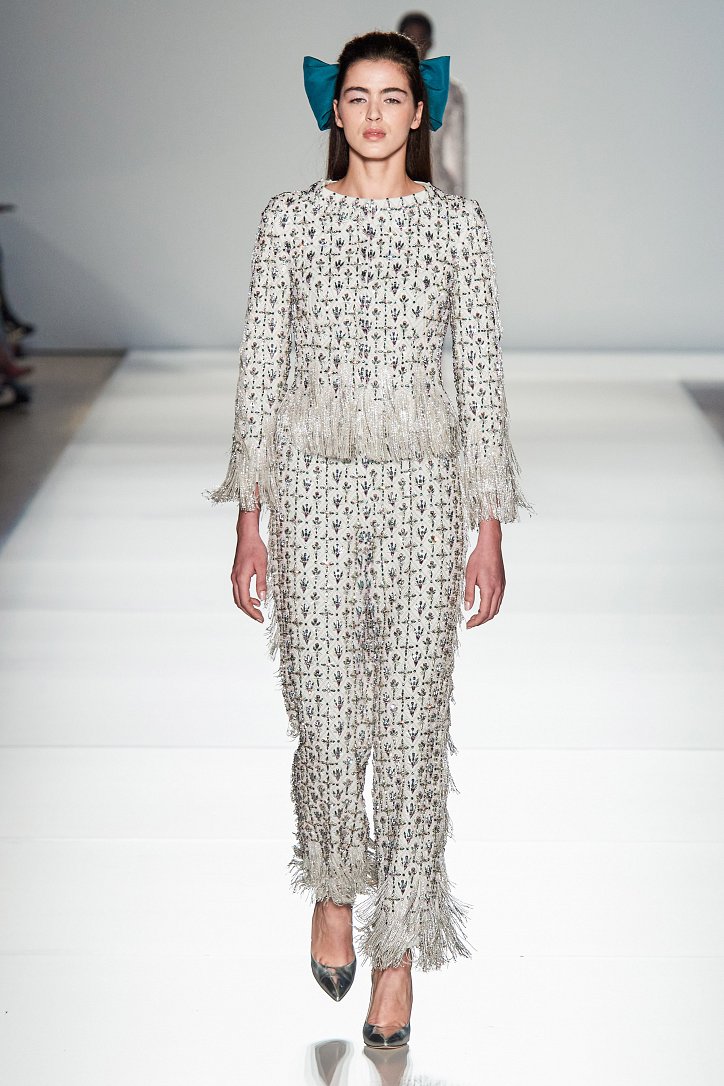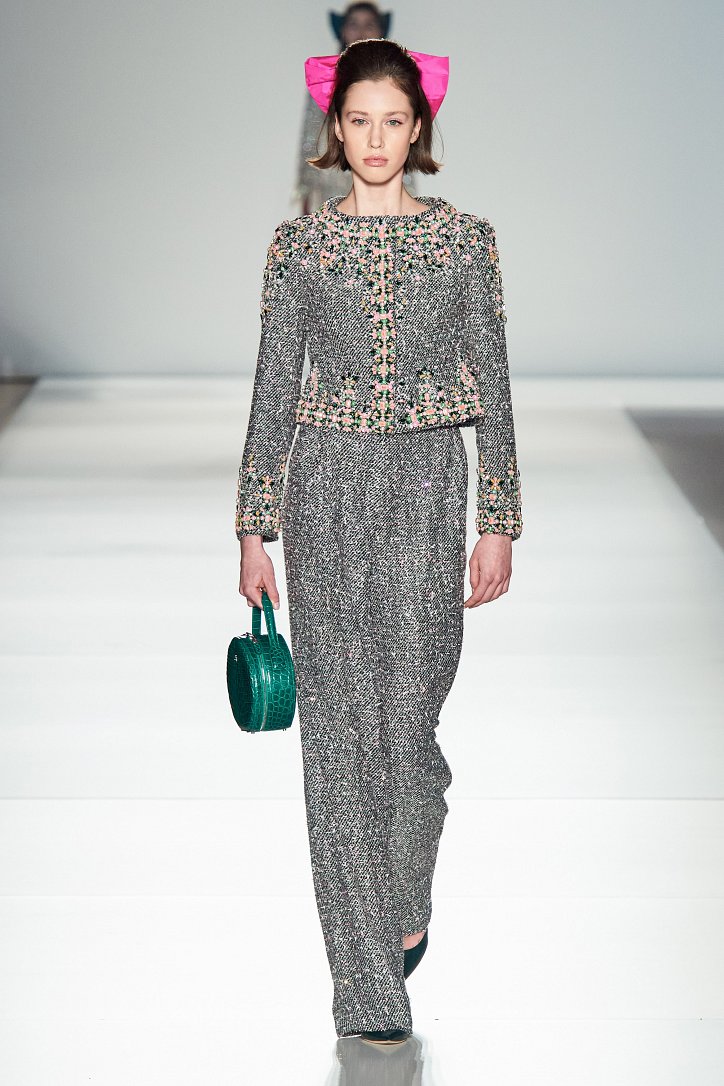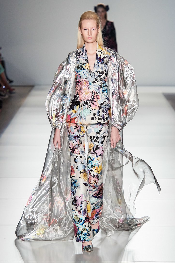 Проинспектировав архивы и осовременив найденное, дизайнеры представили интересную коллекцию, в которой были жаккардовые пальто и украшенные перышками вечерние платья, блестящие брючные костюмы и платья, декорированные скульптурными воланами из органзы и огромными объёмными цветами, модели с цветочной вышивкой и принтами.