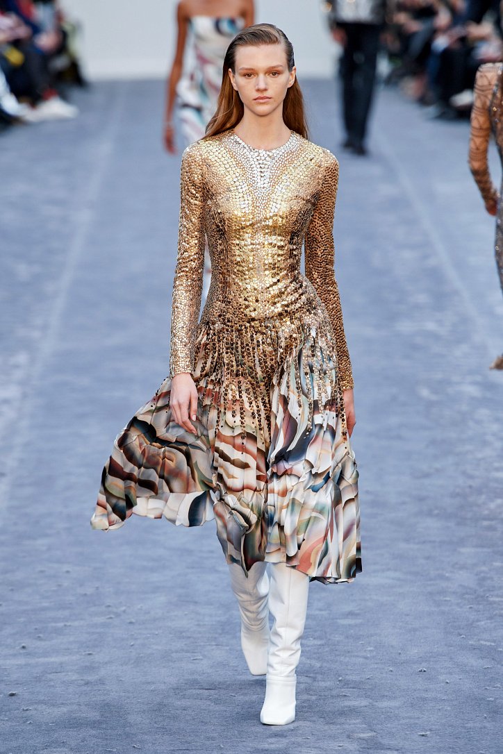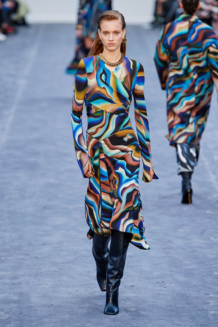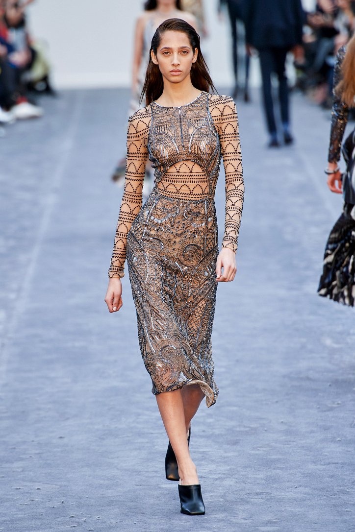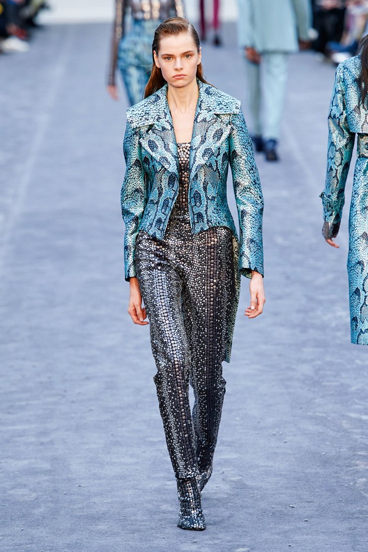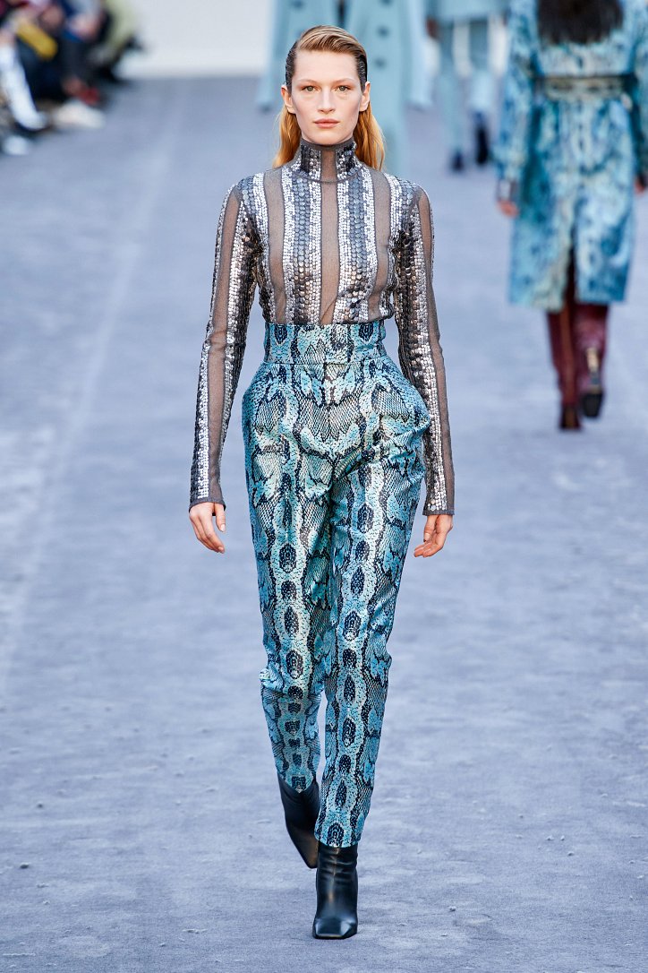 Отношения Пола Сарриджа и дома моды Roberto Cavalli изначально не были простыми и однозначными. Придя на место Питера Дундаса, новый креативный директор решил изменить и ДНК бренда, который прочно ассоциировался с роскошной жизнью, гламуром и туалетами для «особых случаев». Поставив цель – создать модную одежду, которую можно будет носить не только ночью, но и днем – дизайнер «ринулся в бой», максимально снизив градус гламура и яркости. И вот – новая коллекция Roberto Cavalli. И что же? Как видим, «вирус Кавалли» оказался заразен: даже сдержанный по натуре Сарридж не смог долго противостоять ярким цветам, блеску пайеток и анималистике: в осенне-зимней коллекции появился «тигр» (что, правда, не в натуральном окрасе, а в виде яркого абстрактного паттерна) и «змея» в серо-голубой интерпретации.
