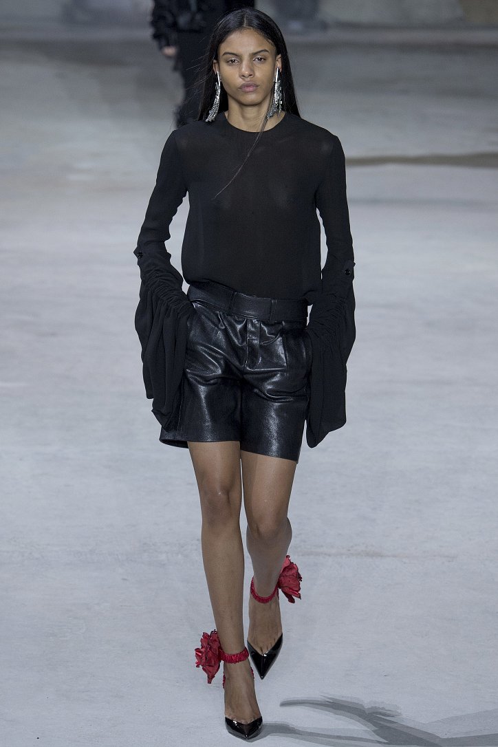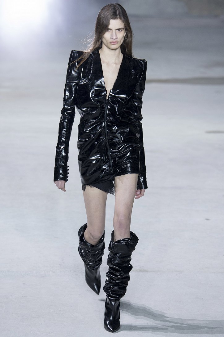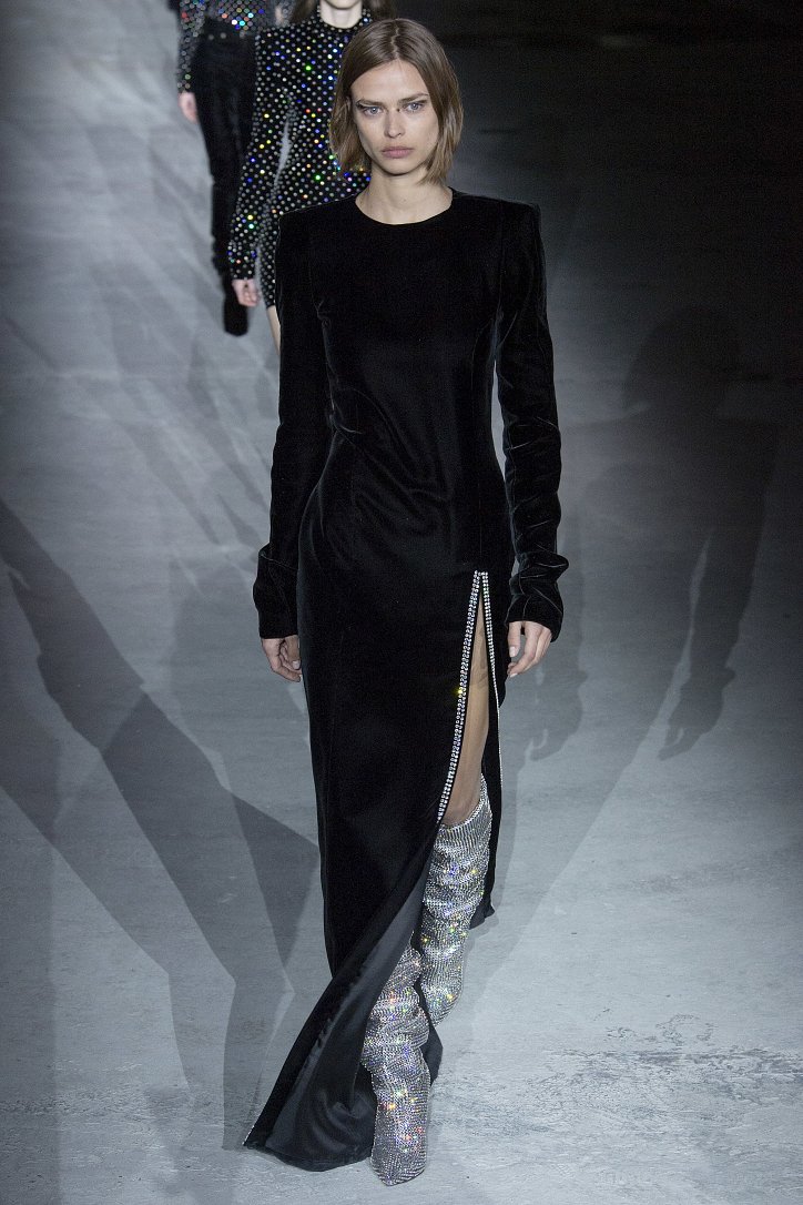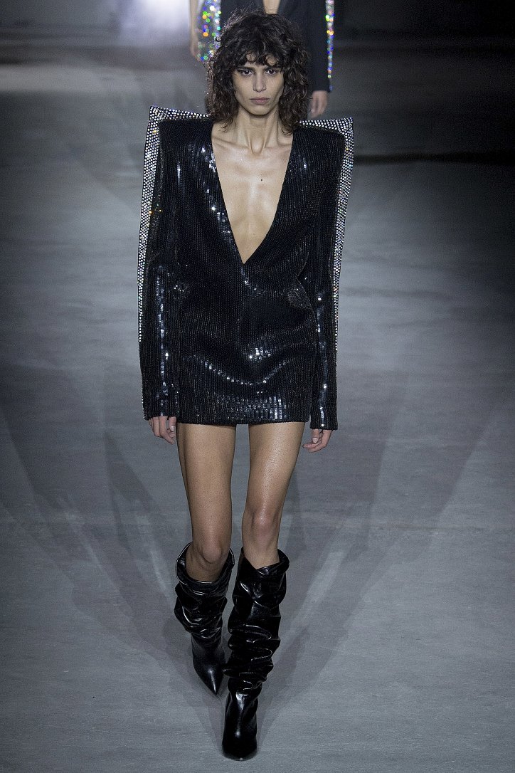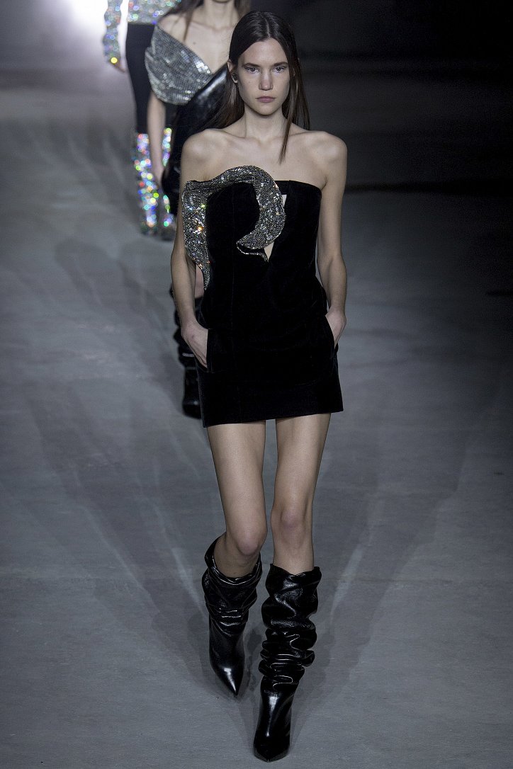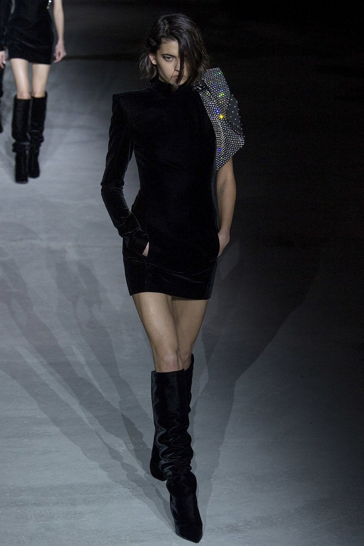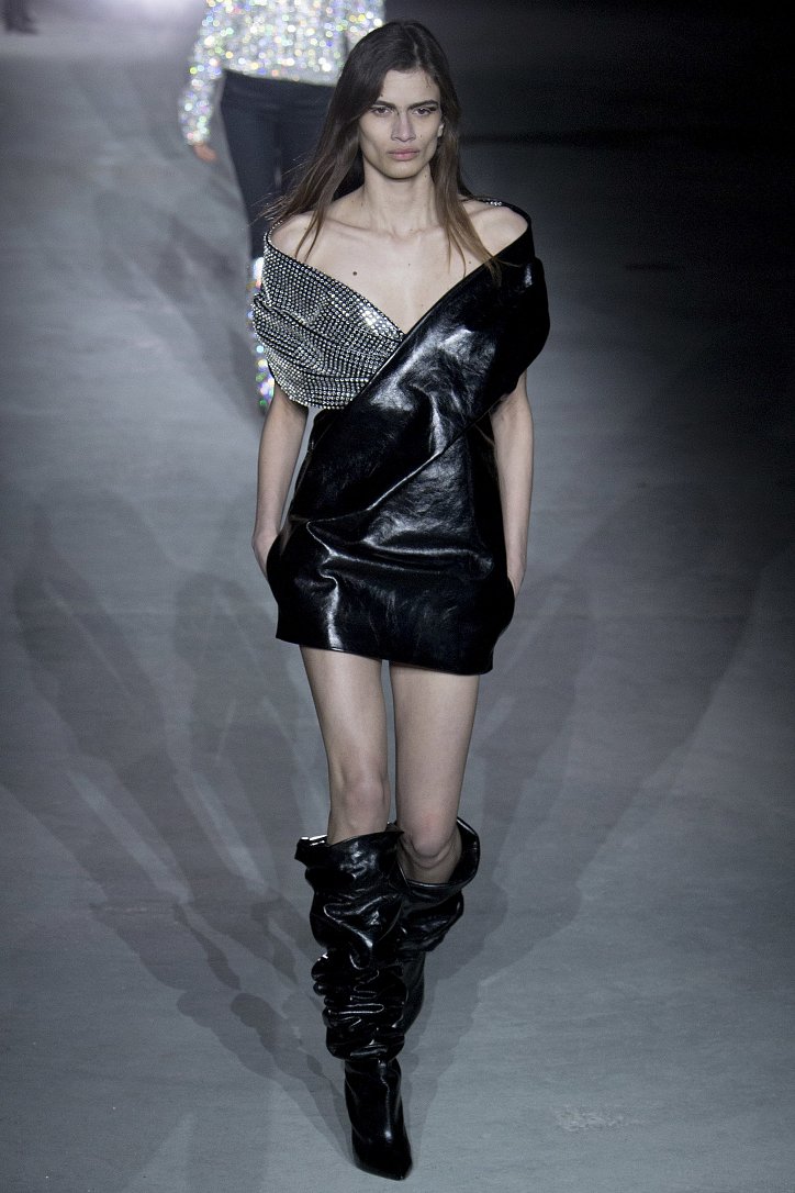 С чем ассоциируется бренд Saint Laurent? У Anthony Vaccarello – с ночными клубами и вечеринками. Так что свою коллекцию Saint Laurent осень-зима 2017-2018 дизайнер решил продемонстрировать в соответствующей обстановке: в штаб-квартире бренда были возведены очень своеобразные декорации, напоминающие модный «альтернативный» клуб. Среди бетонных стен и строительных лесов в свете резких огней дефилировали модели в эпатажных нарядах: мини-юбках и бомберах-оверсайз, джинсах и ультракоротких дубленках, асимметричных платьях с разрезами почти до талии и сапогах-гармошках. Латекс, кожа, сверхоткровенные вырезы и разрезы, дерзкое мини – коллекция получилась очень сексуальной и смелой.