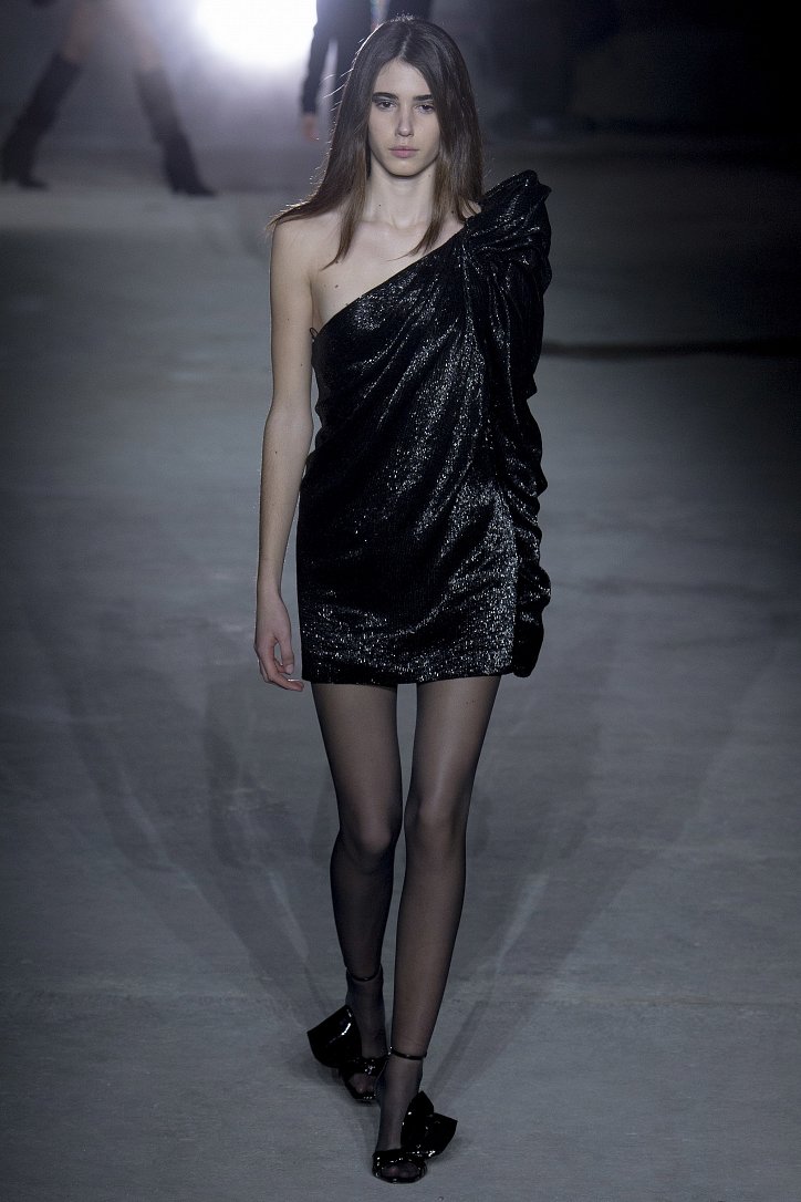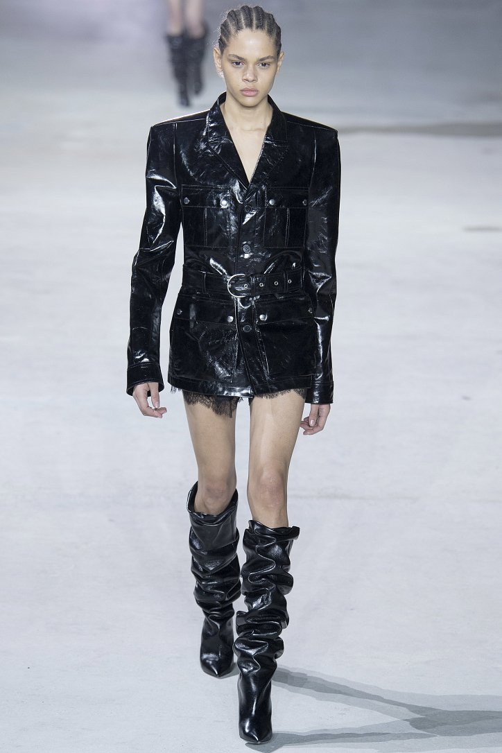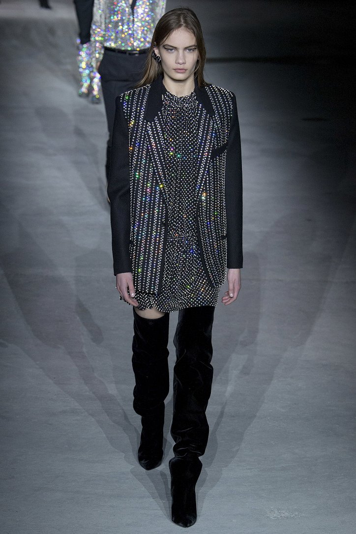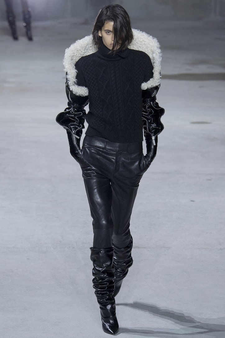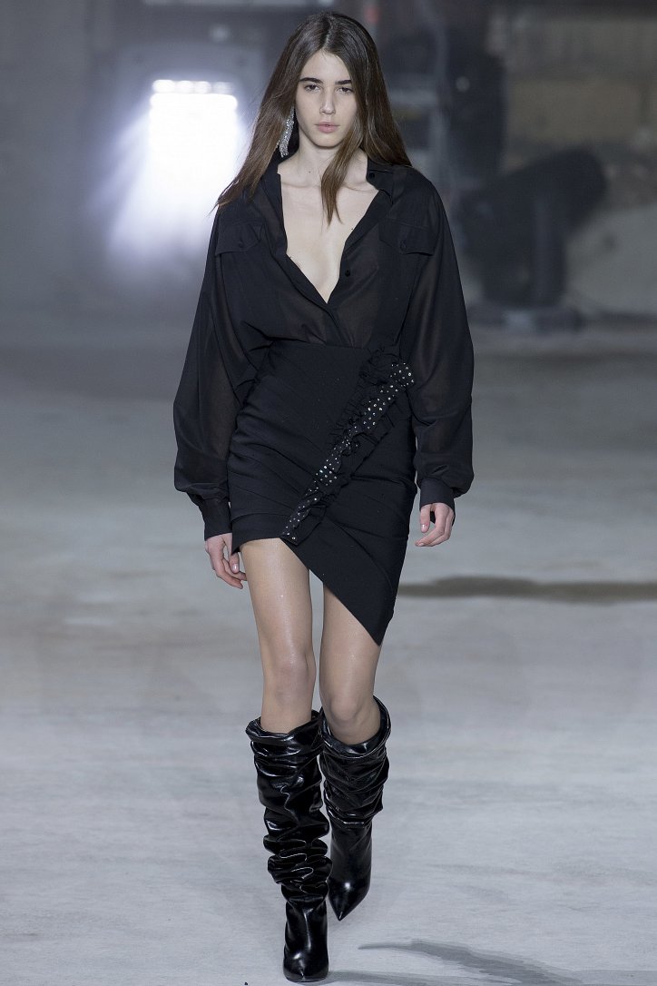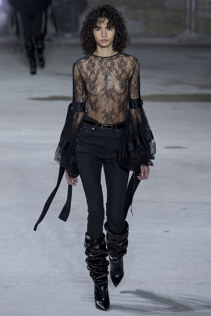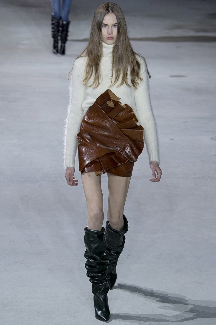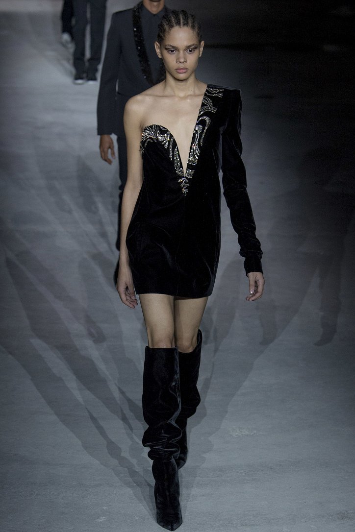 С чем ассоциируется бренд Saint Laurent? У Anthony Vaccarello – с ночными клубами и вечеринками. Так что свою коллекцию Saint Laurent осень-зима 2017-2018 дизайнер решил продемонстрировать в соответствующей обстановке: в штаб-квартире бренда были возведены очень своеобразные декорации, напоминающие модный «альтернативный» клуб. Среди бетонных стен и строительных лесов в свете резких огней дефилировали модели в эпатажных нарядах: мини-юбках и бомберах-оверсайз, джинсах и ультракоротких дубленках, асимметричных платьях с разрезами почти до талии и сапогах-гармошках. Латекс, кожа, сверхоткровенные вырезы и разрезы, дерзкое мини – коллекция получилась очень сексуальной и смелой.