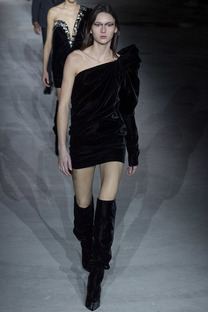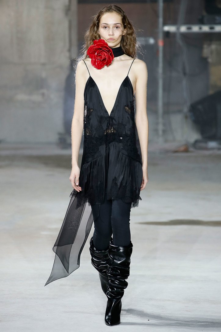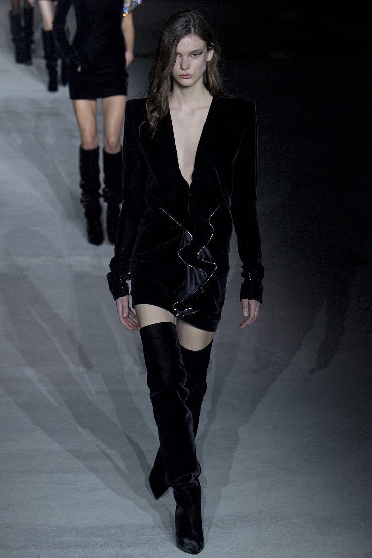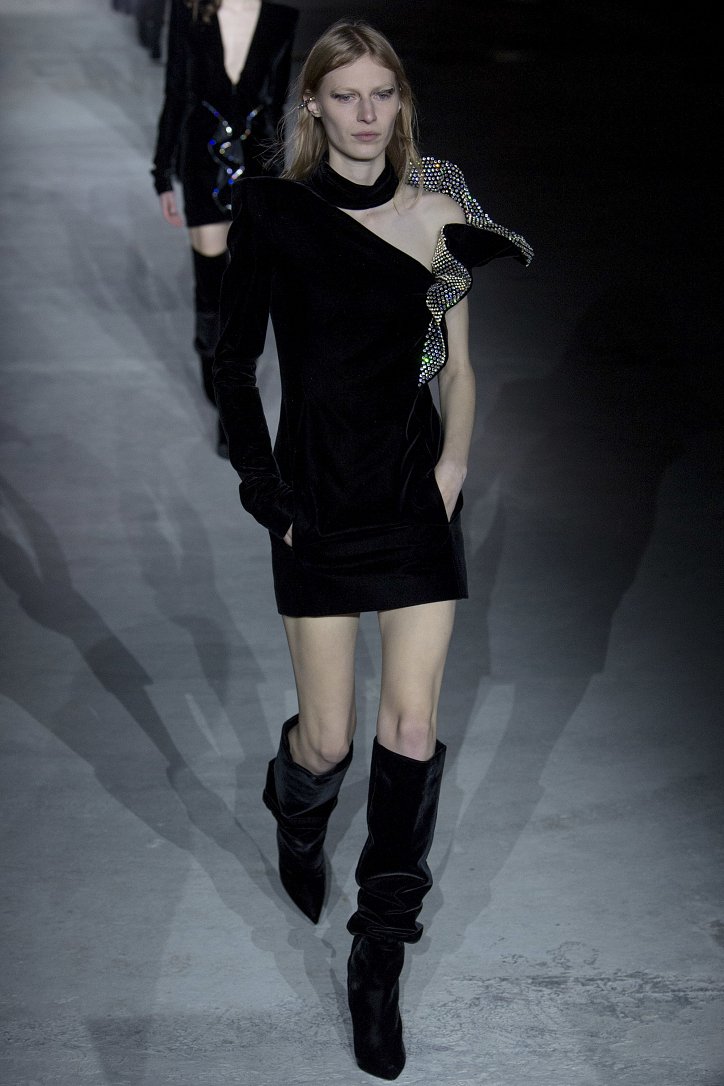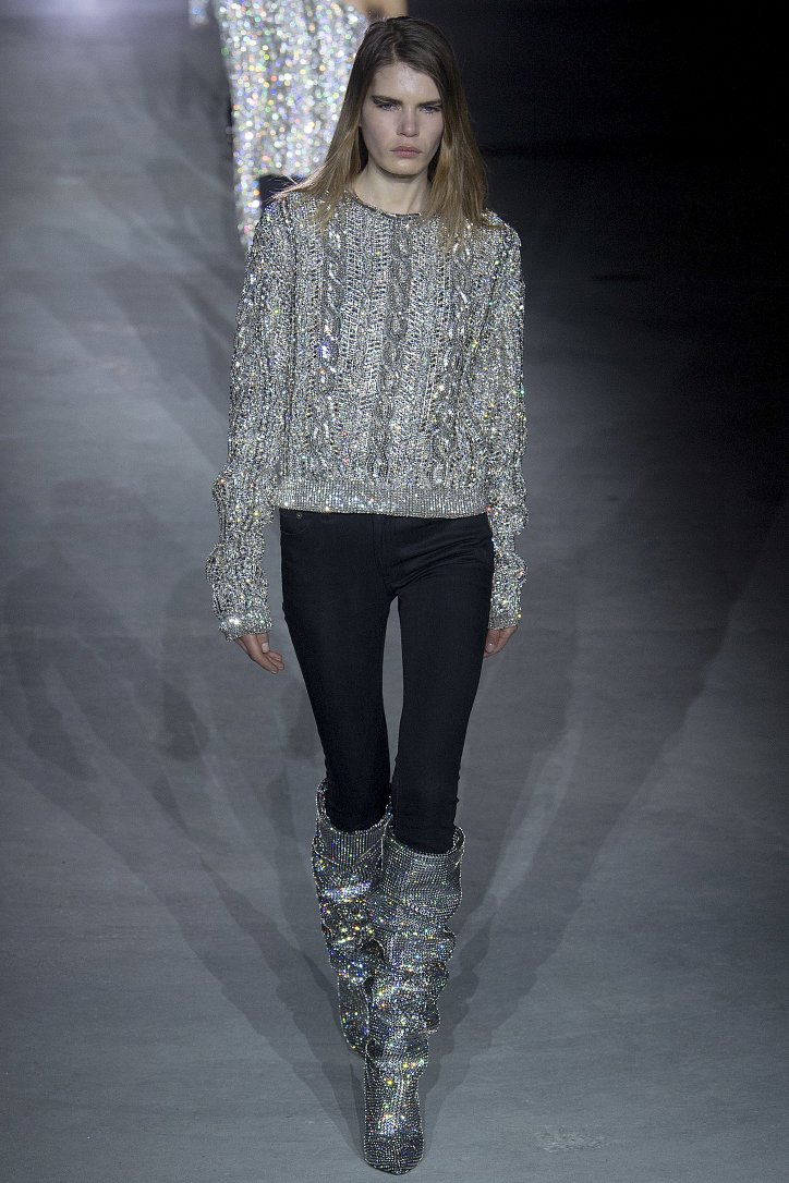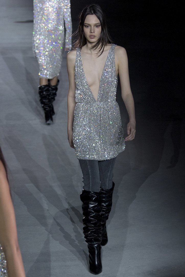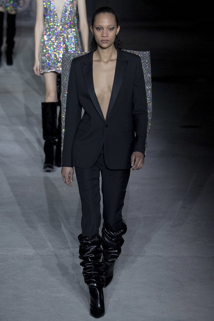 С чем ассоциируется бренд Saint Laurent? У Anthony Vaccarello – с ночными клубами и вечеринками. Так что свою коллекцию Saint Laurent осень-зима 2017-2018 дизайнер решил продемонстрировать в соответствующей обстановке: в штаб-квартире бренда были возведены очень своеобразные декорации, напоминающие модный «альтернативный» клуб. Среди бетонных стен и строительных лесов в свете резких огней дефилировали модели в эпатажных нарядах: мини-юбках и бомберах-оверсайз, джинсах и ультракоротких дубленках, асимметричных платьях с разрезами почти до талии и сапогах-гармошках. Латекс, кожа, сверхоткровенные вырезы и разрезы, дерзкое мини – коллекция получилась очень сексуальной и смелой.